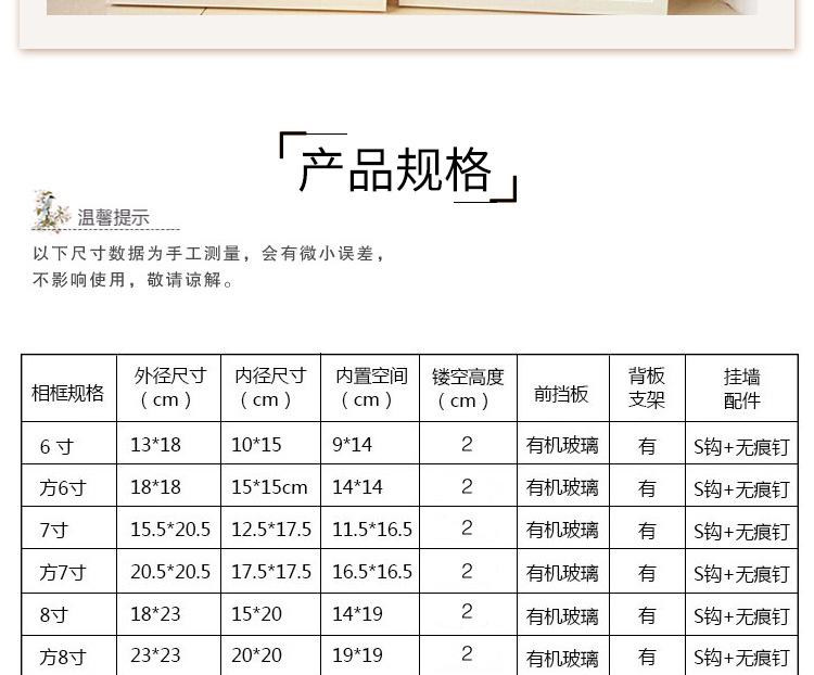 El grosor del marco de fotos es de 3.2 cm, el ancho del marco es de 2 cm, y el hueco es de 2 cm (se pueden colocar objetos tridimensionales de menos de 2 cm de grosor)