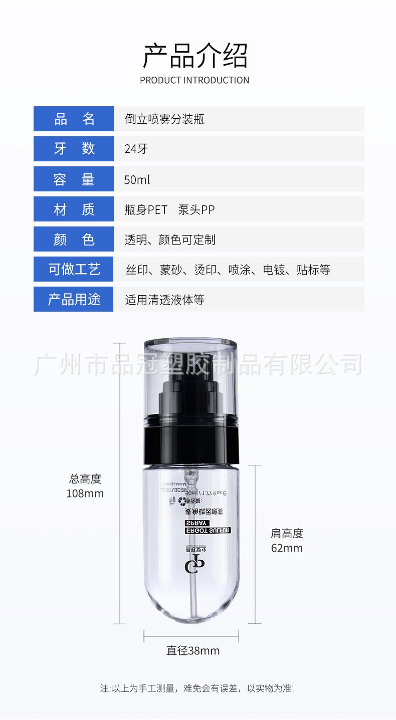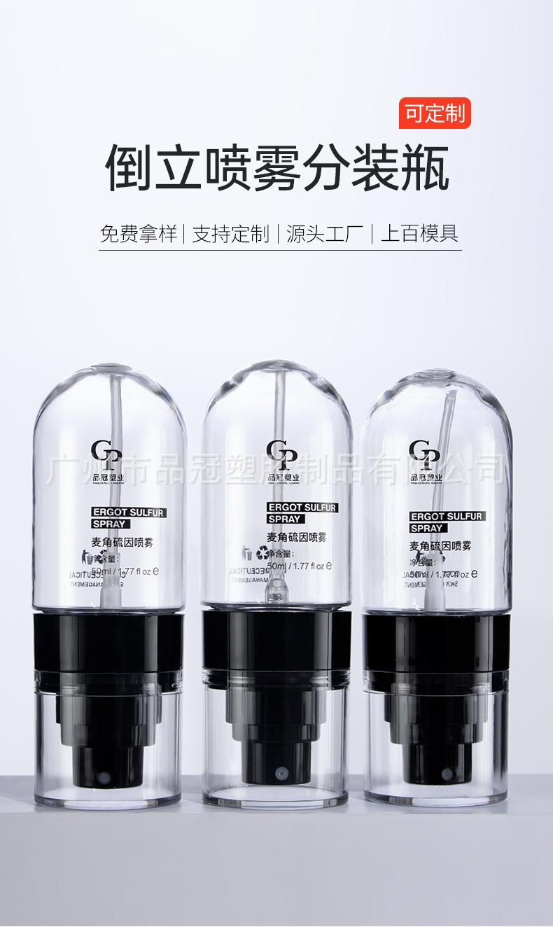 Botella de spray invertida transparente de 50 ml, venta al por mayor de fábrica, botellas cosméticas, prensa de plástico PET, embalaje de botellas