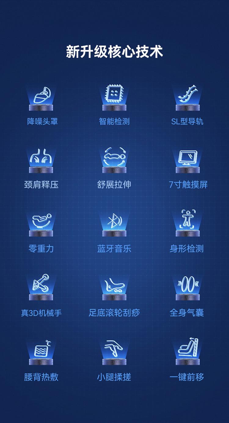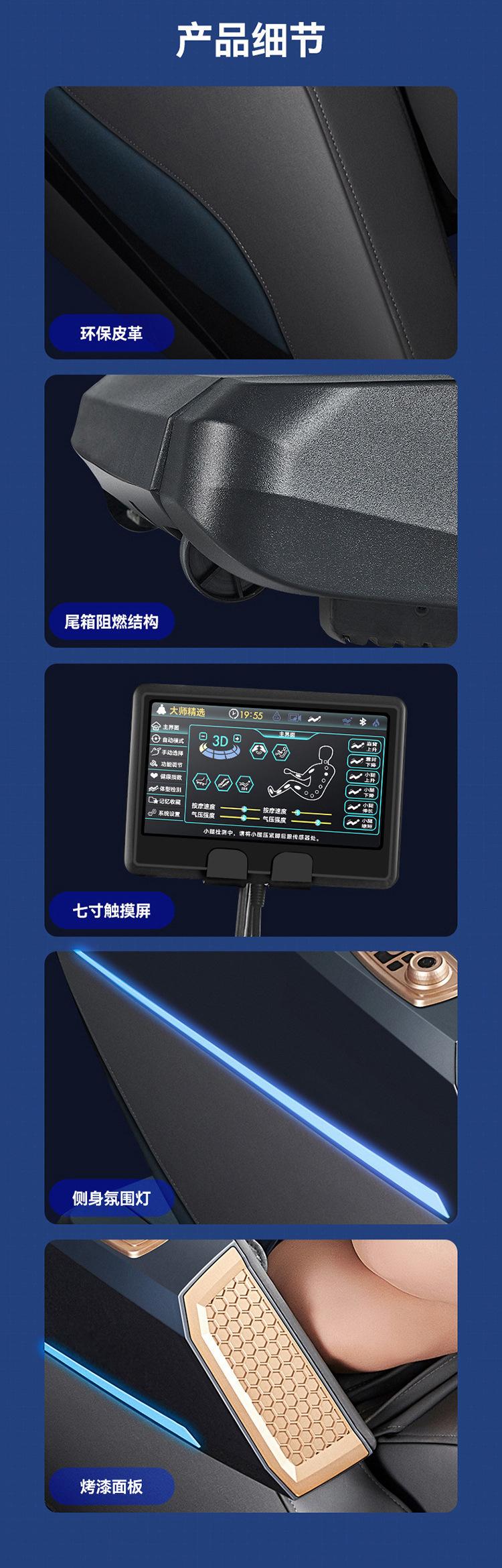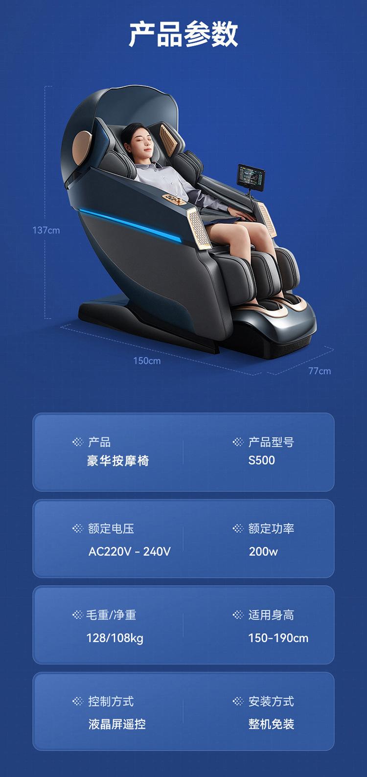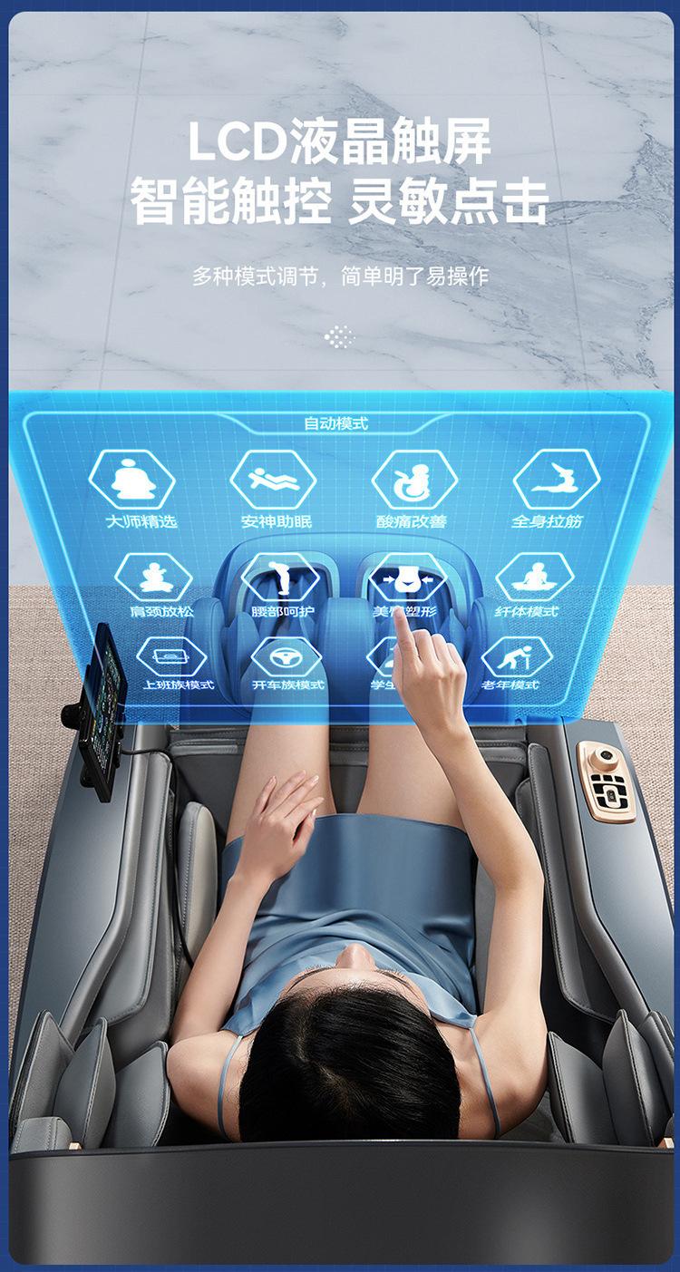 S400 technology blue + 3d movement + negative ions + top waist stretch + sleep head compartment + supercar central control + electric legs + ai physical examination + lcd screen