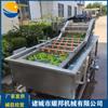 El equipo de limpieza de vegetales es una máquina de limpieza por aspersión de burbujas. El material cae en el agua, y el agua que gira en el cuerpo del tanque se utiliza para removerlo y limpiarlo. El material, la máquina de burbujas y el agua se combinan para girar el material. El gas a alta presión genera burbujas, lo que permite que el material gire. La suciedad pesada, como barro y arena, se separa y cae en el área de sedimentación debajo del filtro. El material se mueve gradualmente hacia la cinta transportadora bajo la presión del agua, donde es empujado continuamente hacia adelante y extraído del tanque interior. Una vez fuera del agua, se instala un cabezal de aspersión en el extremo superior. Después de la limpieza por aspersión, el material se lava dos veces y pasa al siguiente proceso. La limpieza cuádruple con bomba de agua circulante, desinfección con ozono y aspersión de agua a alta presión elimina los residuos agrícolas e impurezas de la superficie del producto, limpiando a fondo las frutas, verduras y otros materiales. Un dispositivo de filtrado y eliminación de impurezas separa eficazmente impurezas como hojas podridas, residuos vegetales y pelos adheridos a las verduras. Estos residuos se filtran por el puerto de rebose del agua circulante. El sedimento se descarga por el puerto y se aísla mediante un filtro en el tanque de agua circulante para mantener las verduras limpias. Las ventajas de la lavadora de verduras son su limpieza a fondo, su gran capacidad de limpieza y la posibilidad de esterilizar con ozono para eliminar residuos de medicamentos, sin dañar las verduras de hoja. Durante el proceso de limpieza, las boquillas de pulverización y alta presión suministran agua continuamente, y el suministro de agua es ajustable, lo que facilita un ajuste flexible según la cantidad de verduras a procesar y el grado de limpieza. Además, durante este proceso, se puede añadir la cantidad adecuada de medicamento según las necesidades para su redesinfección o conservación. Este equipo es ampliamente utilizado y económico en la industria del procesamiento de frutas y verduras.