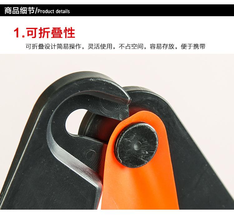 1. Al usarla, extraiga la señal de advertencia de vehículo defectuoso de la caja, sujétela por la base con las manos y abra los soportes a ambos lados. Coloque la señal abierta en el suelo, levante las láminas reflectantes izquierda y derecha e inserte el pasador de la lámina reflectante izquierda en la ranura inferior de la lámina reflectante derecha.
