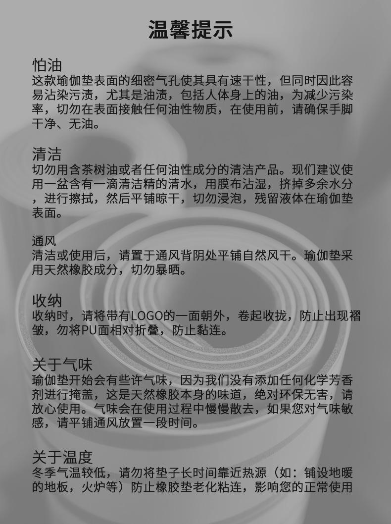 | Precaución con el aceite: Los finos poros de la superficie de la esterilla de yoga de TPE permiten un secado rápido, pero al mismo tiempo son propensos a mancharse, incluso con aceite corporal. Para reducir la contaminación, evite el contacto con sustancias aceitosas en la superficie. Antes de usar, asegúrese de tener las manos y los pies limpios y sin aceite. |