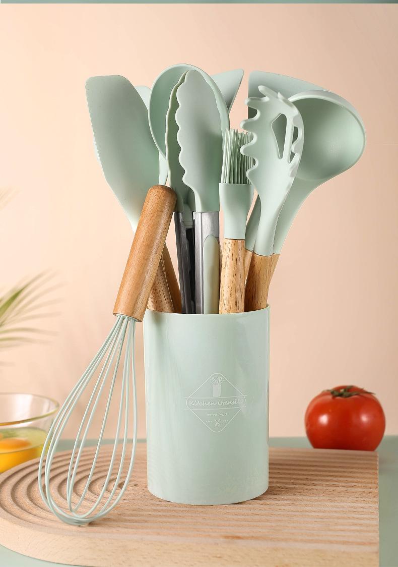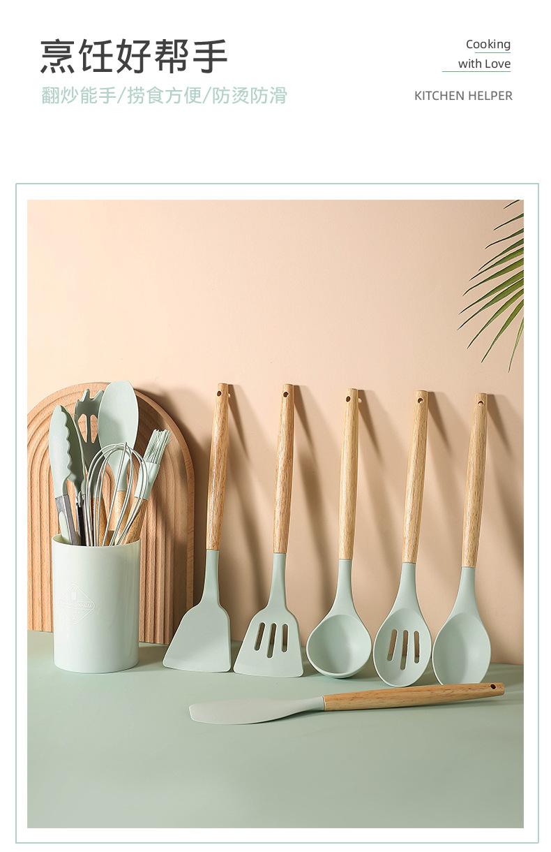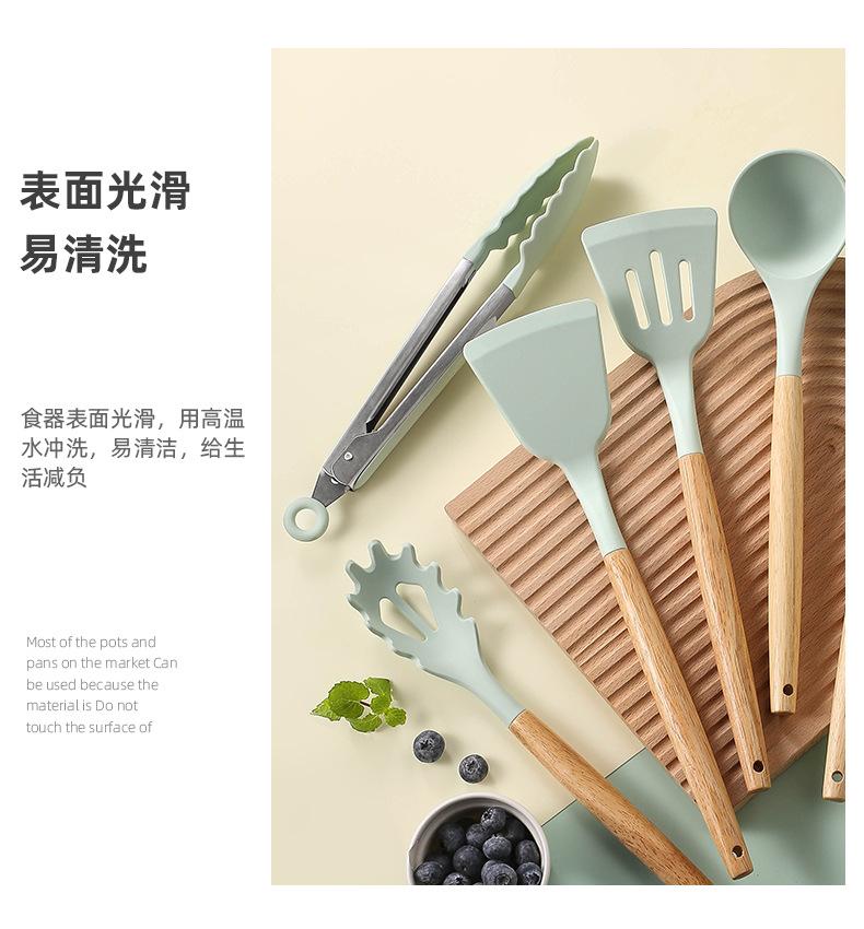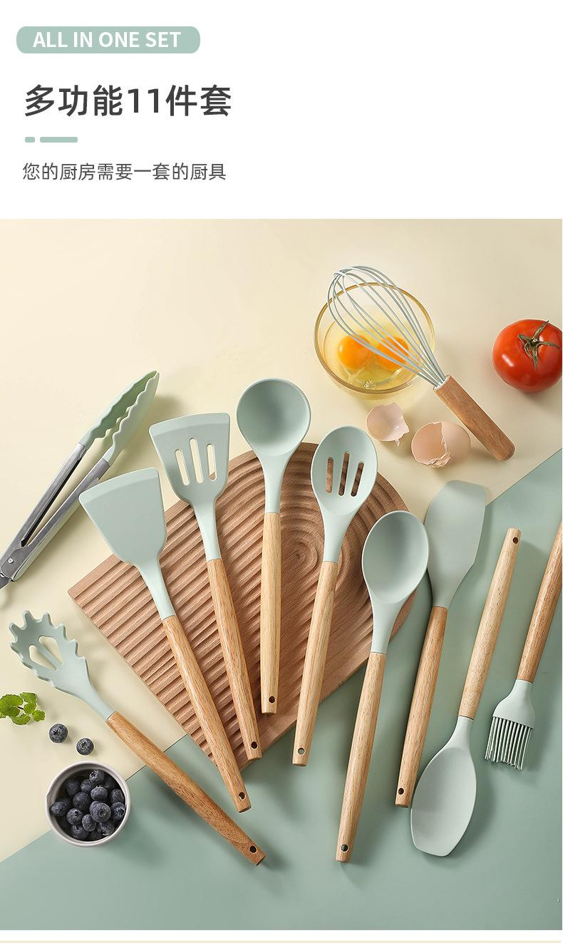 Dark green wooden handle 12-piece set-with bucket Silicone kitchenware 11-piece set + storage bucket (color box)