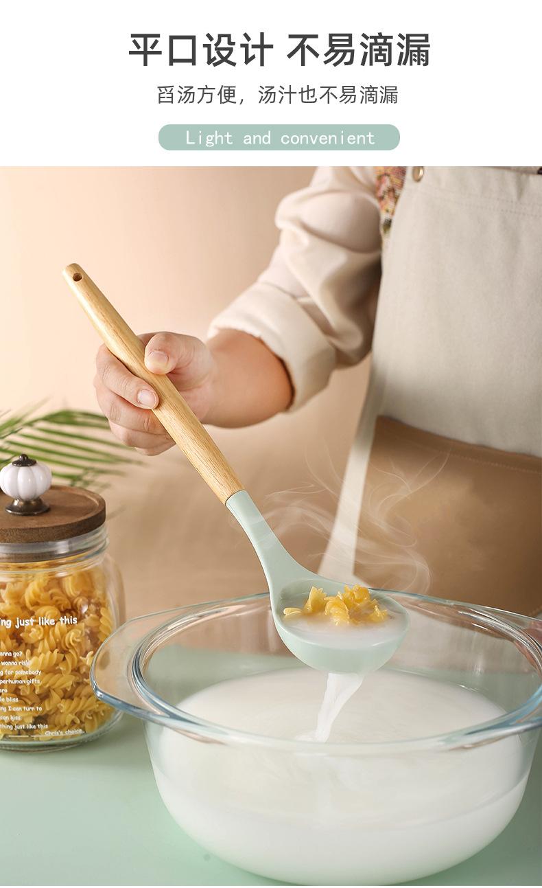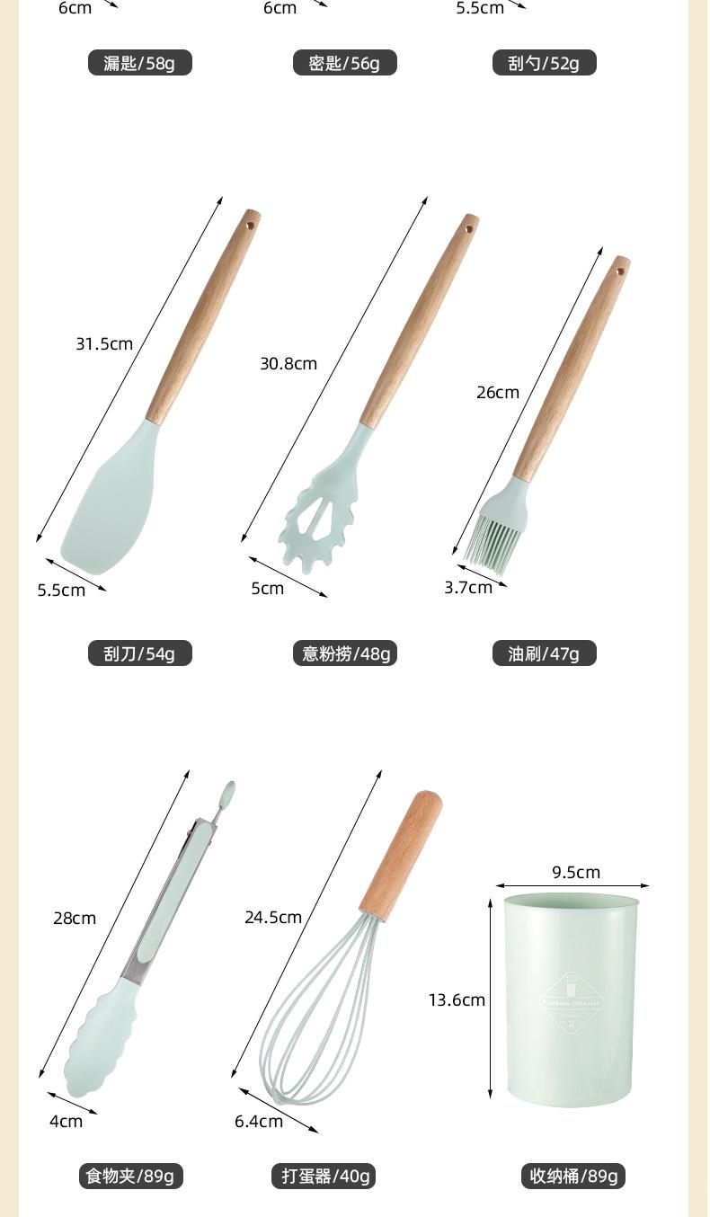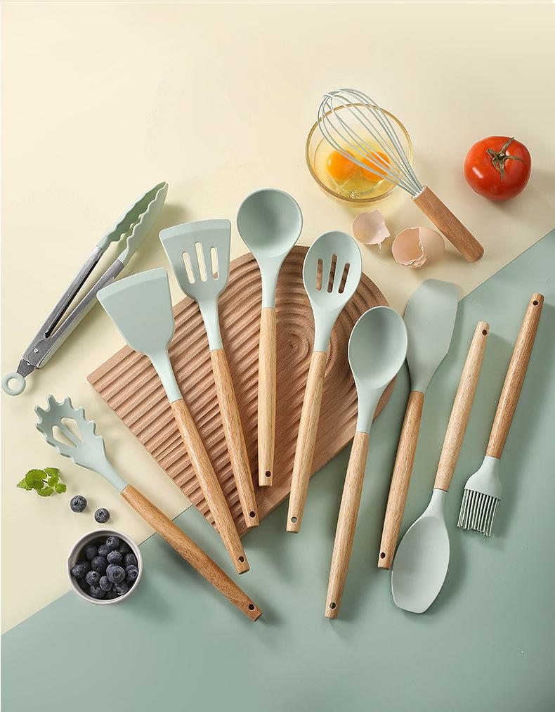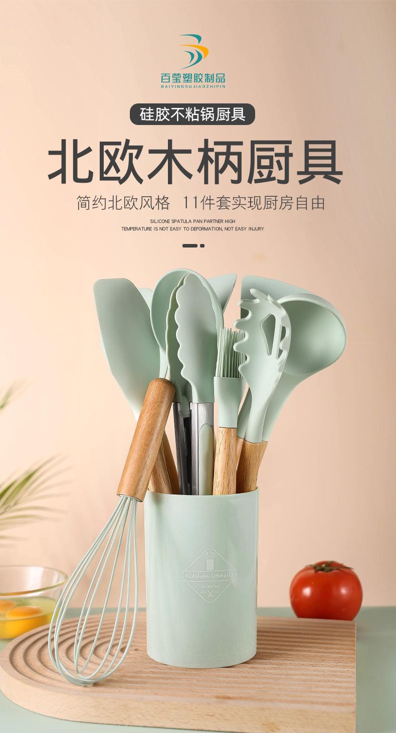 Dark green wooden handle 12-piece set-with bucket Silicone kitchenware 11-piece set + storage bucket (color box)