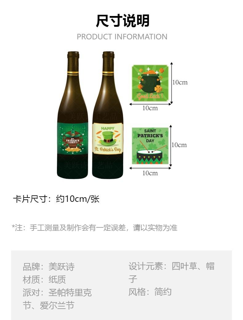 Uso del producto:Diseño del Día de San Patricio, pegatinas para botellas de vino, diseño de ambiente de festival irlandés, pegatinas para copas de vino, suministros de decoración para fiesta de cumpleaños.