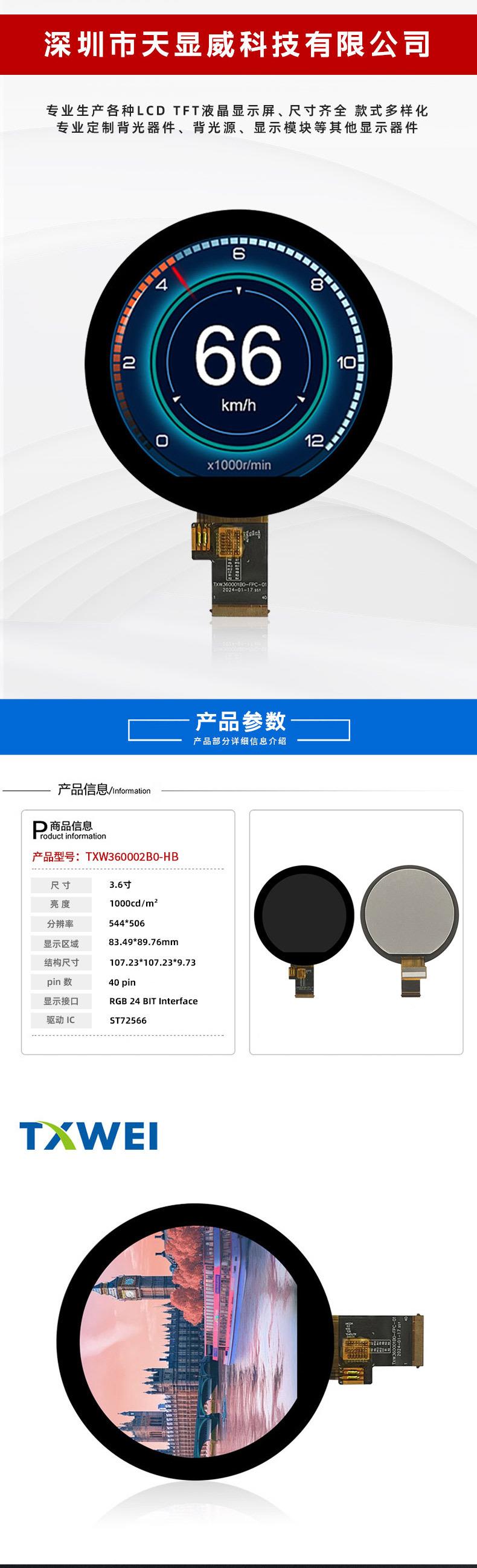 Pantalla LCD TFT de 3,6 pulgadas, visible a la luz solar, para instrumentos industriales de dos ruedas, con brillo de 1000, redonda.