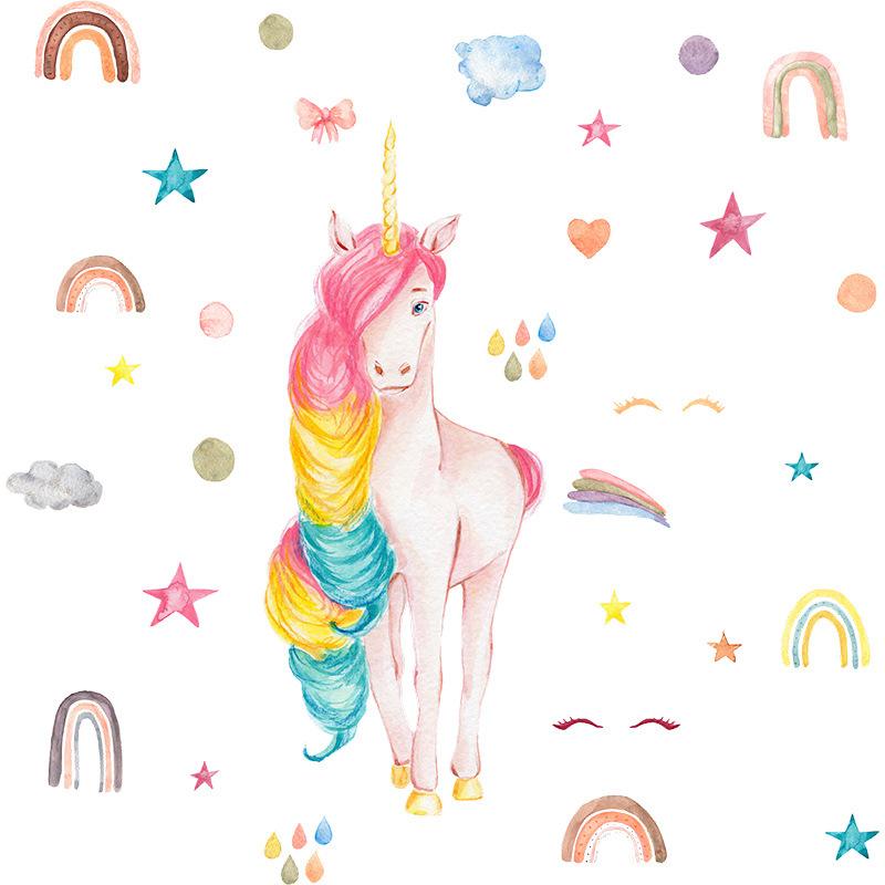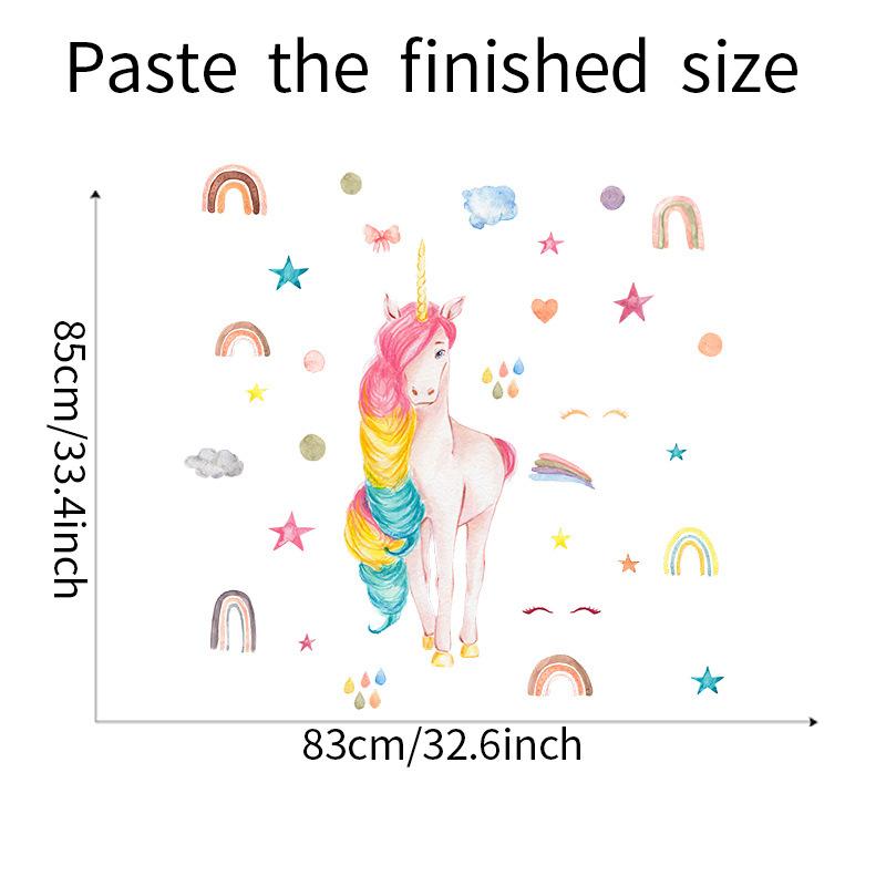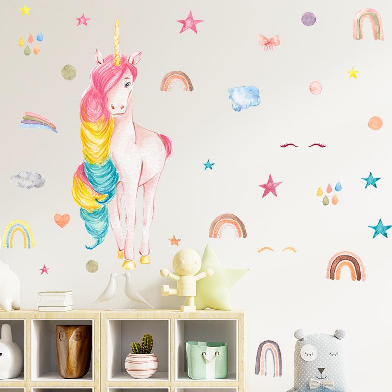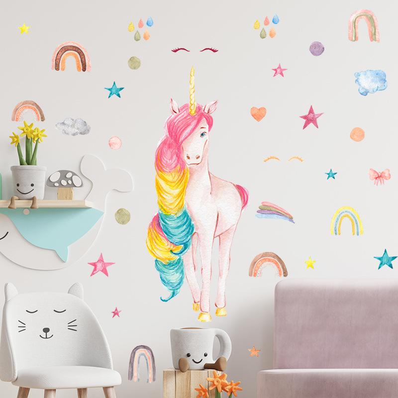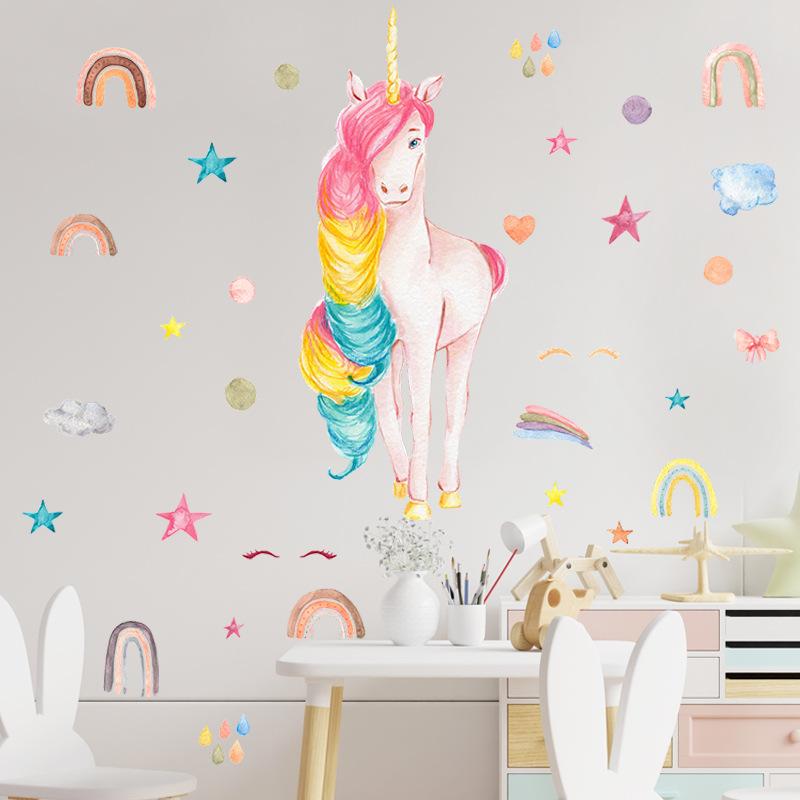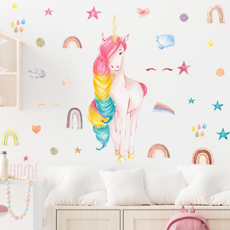 Nueva pegatina de pared FX-D296 con diseño de unicornio, arcoíris y estrellas, ideal para decorar el dormitorio, el pasillo y el hogar.