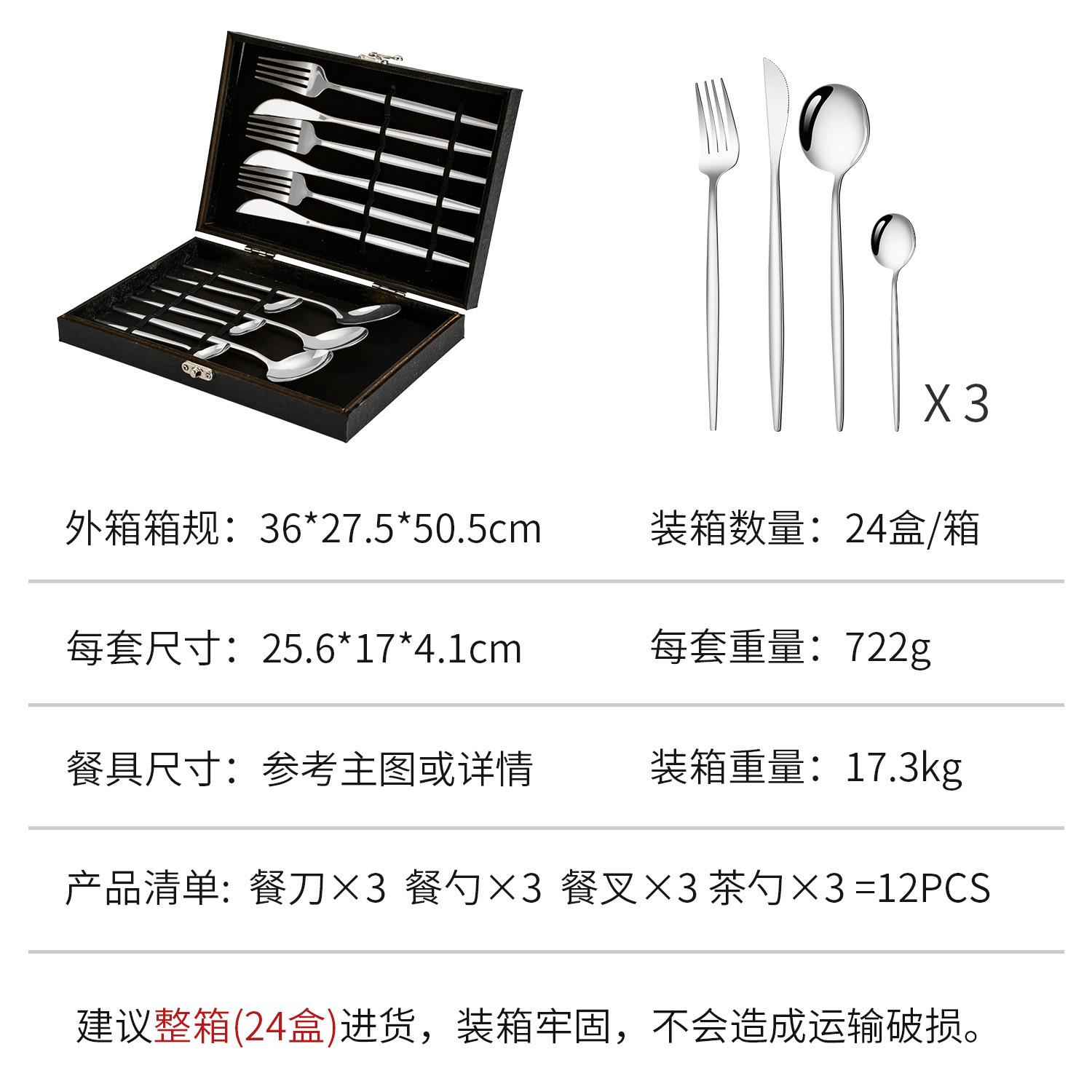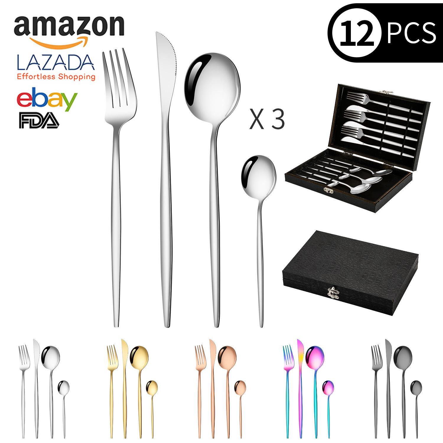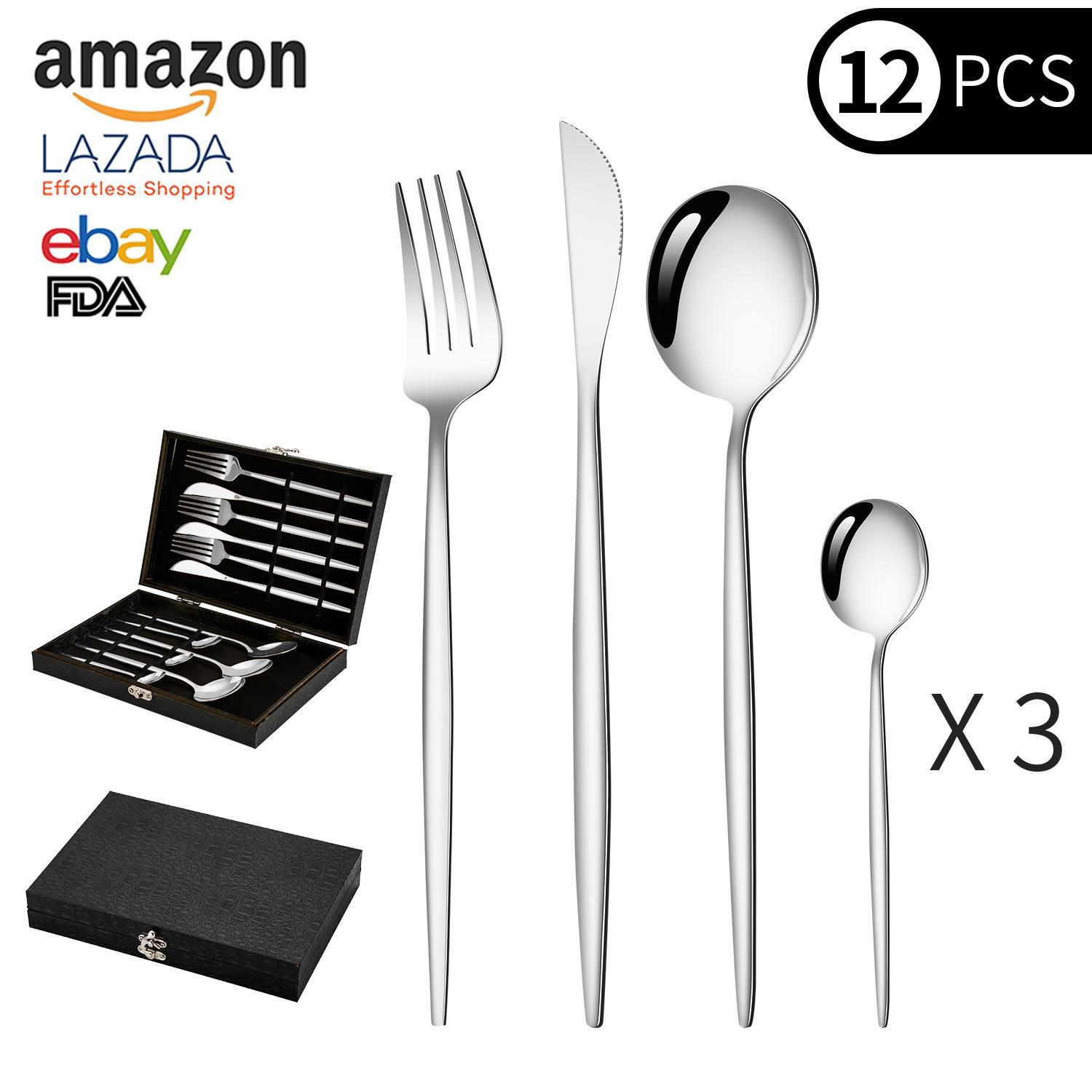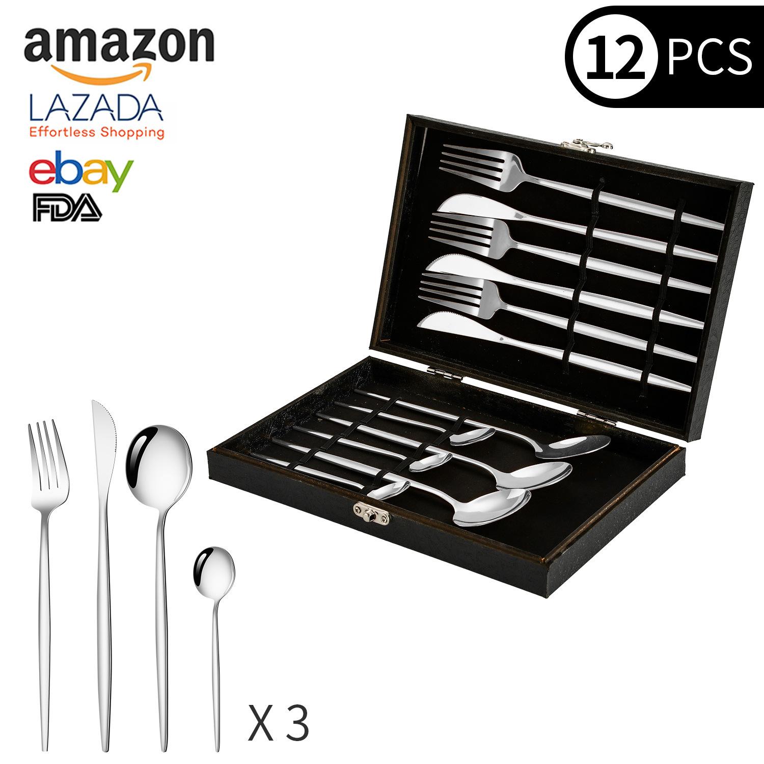 Cubiertos portugueses de acero inoxidable de Amazon, juego de 12 piezas para hotel transfronterizo, cubiertos occidentales, caja de madera con grano de cuero, cuchillo para carne, tenedor y cuchara