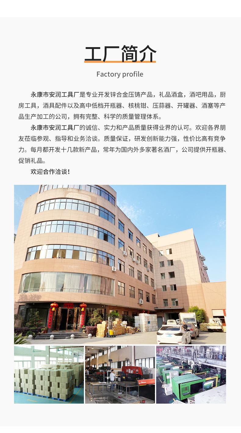La Fábrica de Herramientas Yongkang Anrun se especializa en el desarrollo de productos de fundición a presión de aleación de zinc, cajas de regalo para vino, suministros para bar, herramientas de cocina, accesorios para vino, así como abrebotellas de gama alta, media y baja, cascanueces, prensas de ajo, abre latas, tapones para vino y otros productos. La empresa procesadora cuenta con un sistema de gestión de calidad completo y científico. La integridad, la fortaleza y la calidad de los productos de la Fábrica de Herramientas Yongkang Anrun han sido reconocidas por la industria. Amigos de todos los ámbitos son bienvenidos a visitar, proporcionar orientación y negociar negocios.