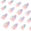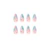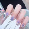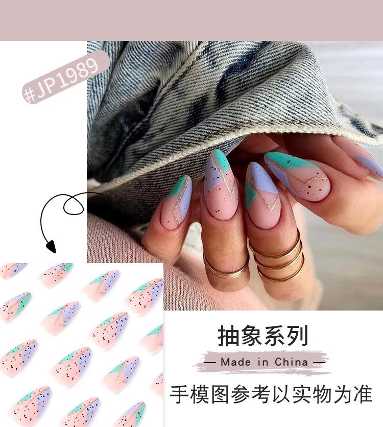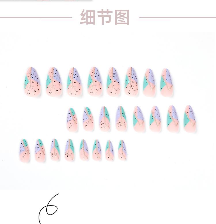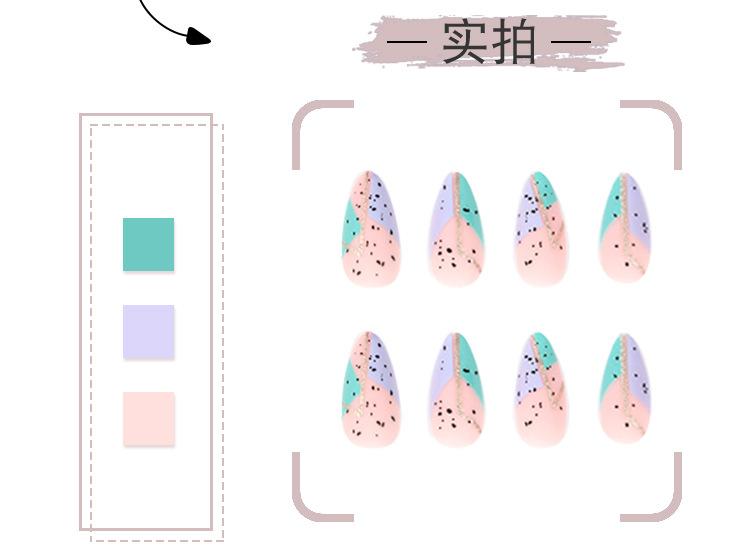 Producto terminado para manicura geométrica verde y morada, venta al por mayor, hilo dorado con puntos negros, parche para uñas.