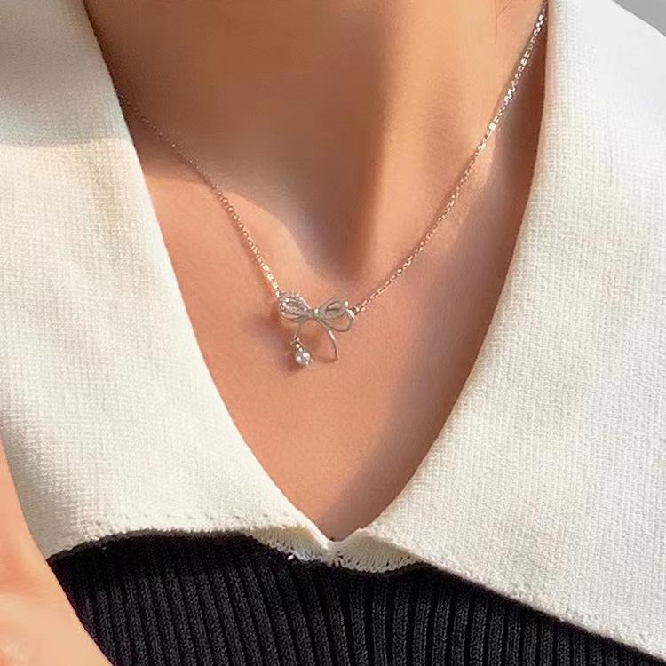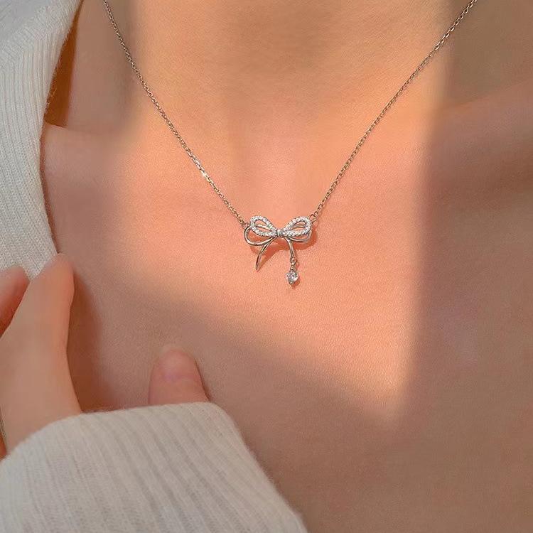 Collar con colgante de lazo de diamantes, diseño de nicho, estilo versátil, cadena de clavícula sencilla de alta gama para mujer.