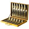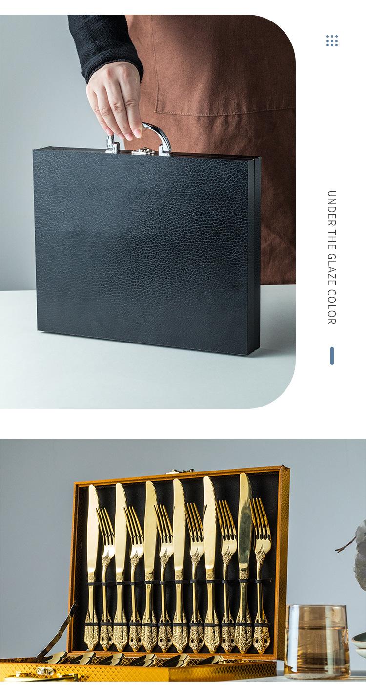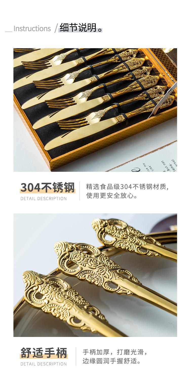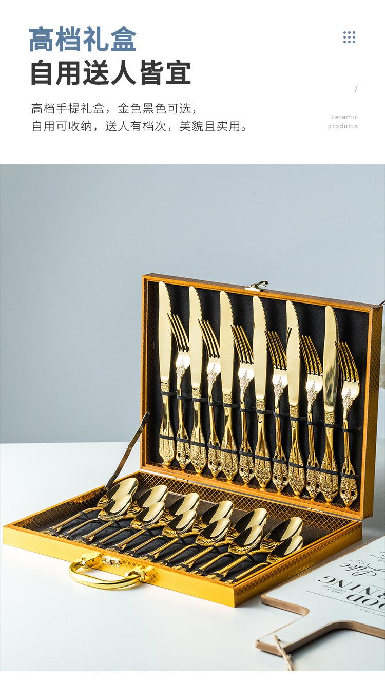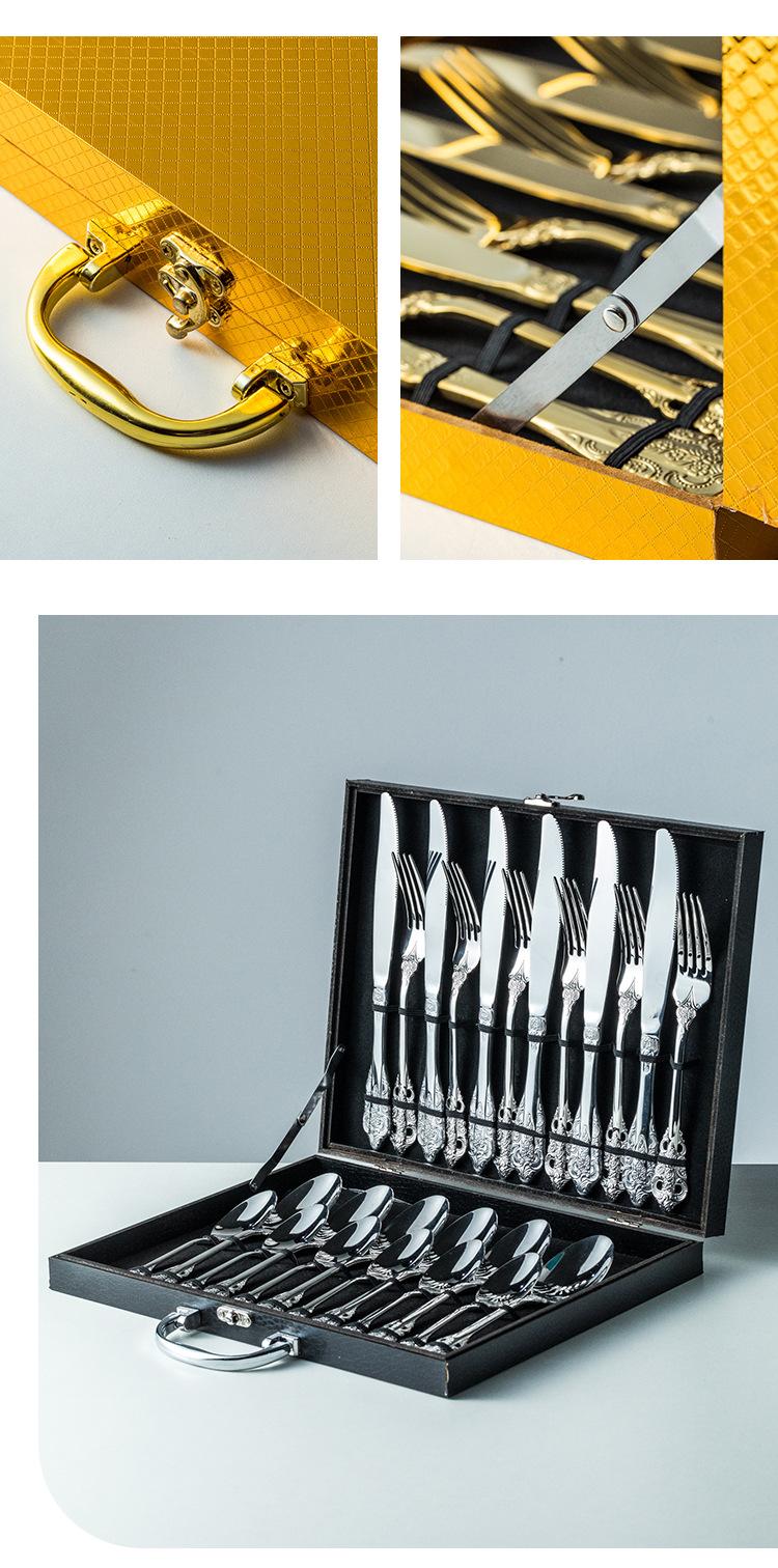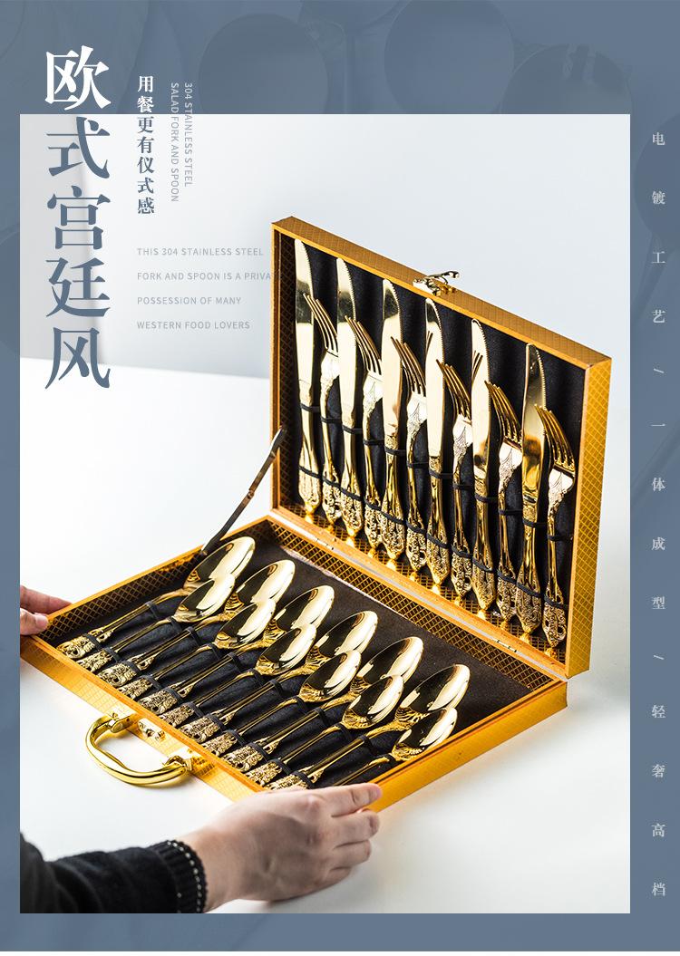 Vajilla europea de acero inoxidable 304 chapada en oro tallada para hotel, cuchillo para bistec, tenedor, cuchara de postre, juego de 24 piezas, caja de regalo