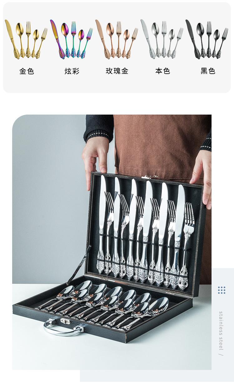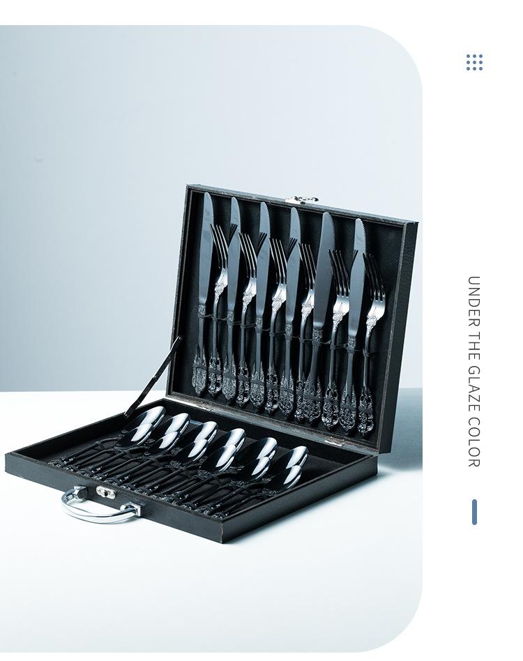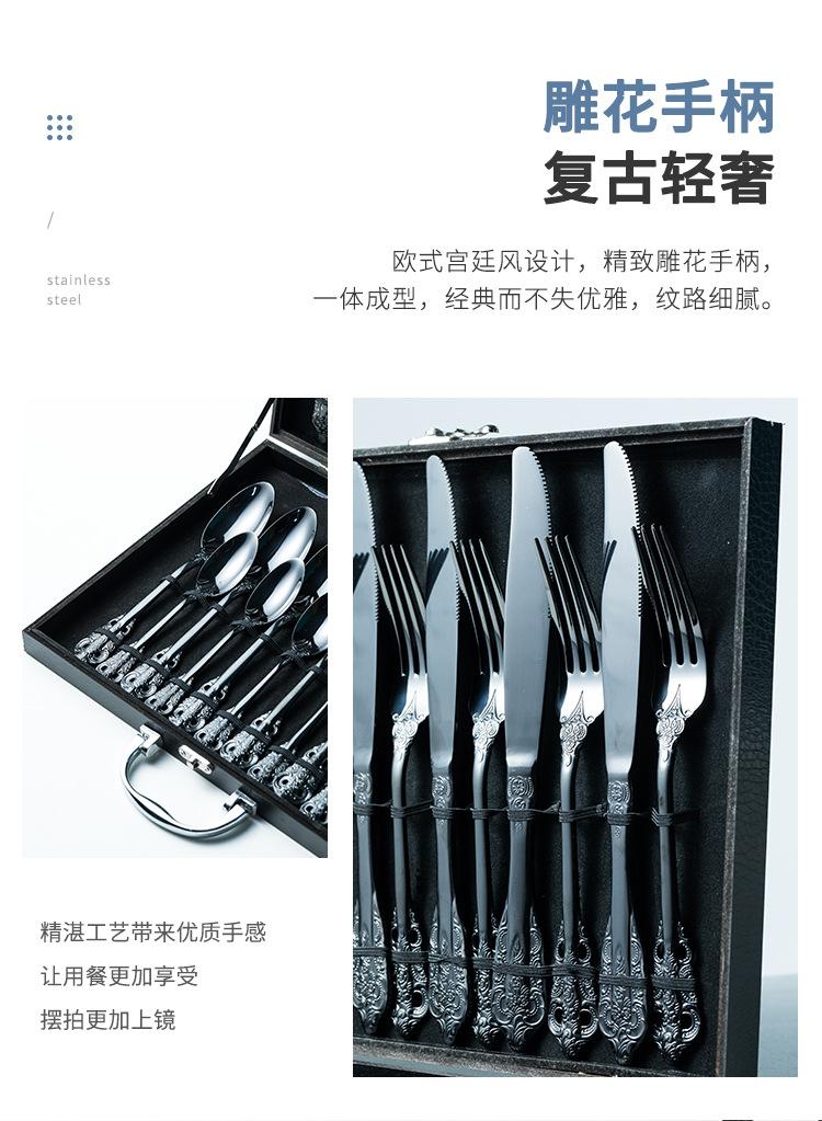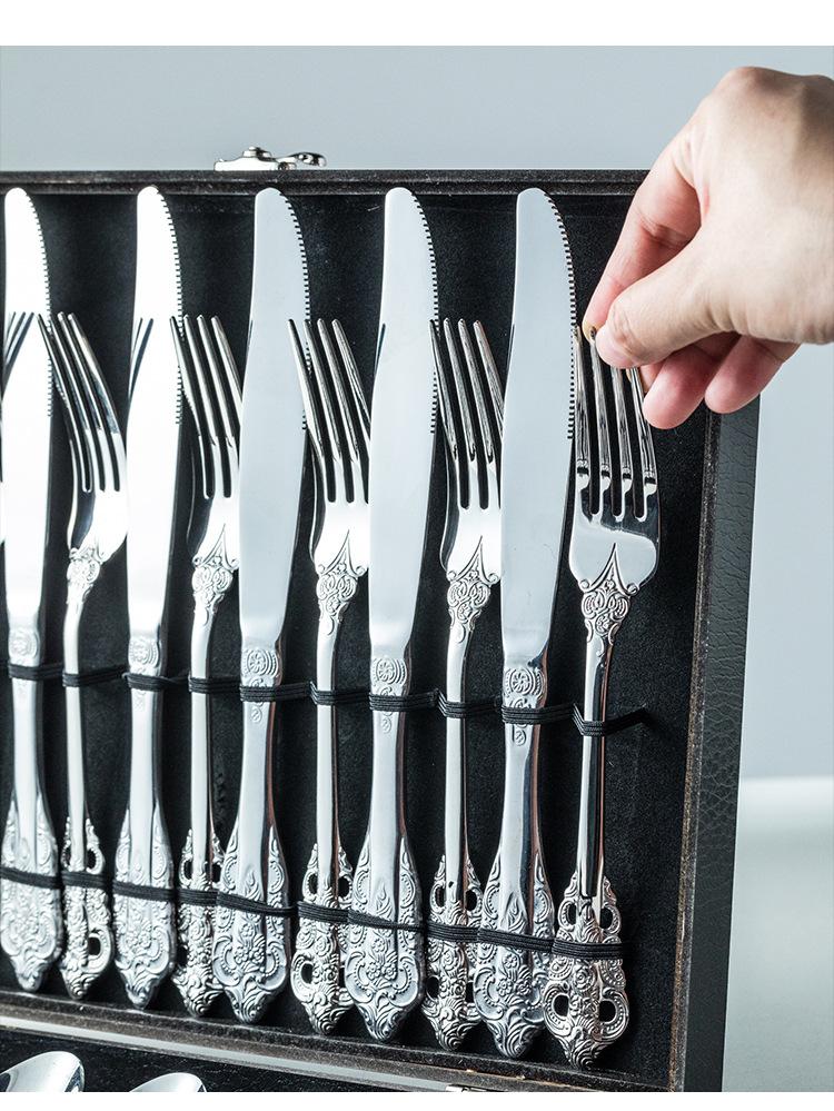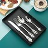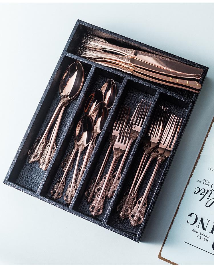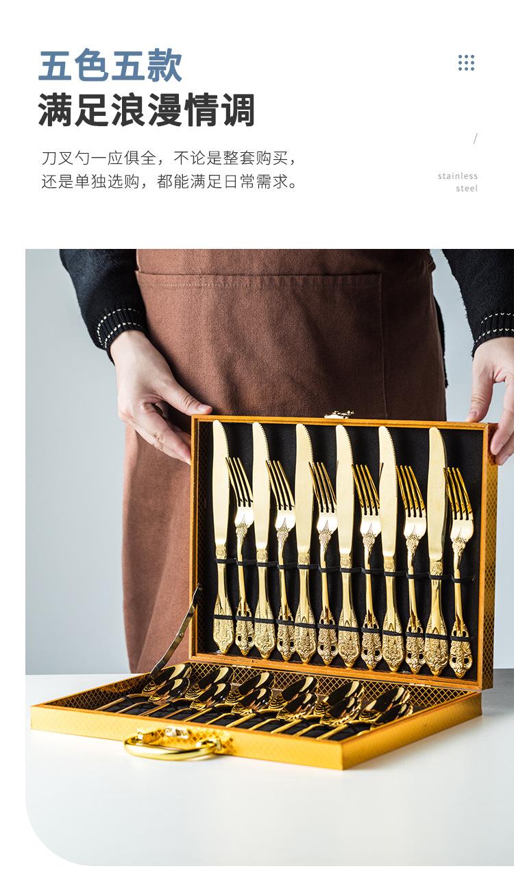 Vajilla europea de acero inoxidable 304 chapada en oro tallada para hotel, cuchillo para bistec, tenedor, cuchara de postre, juego de 24 piezas, caja de regalo
