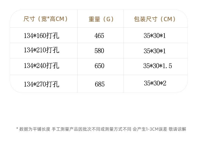 134*160 (perforated one piece), 134*210 (perforated one piece), 134*240 (perforated one piece), 134*270 (perforated one piece)