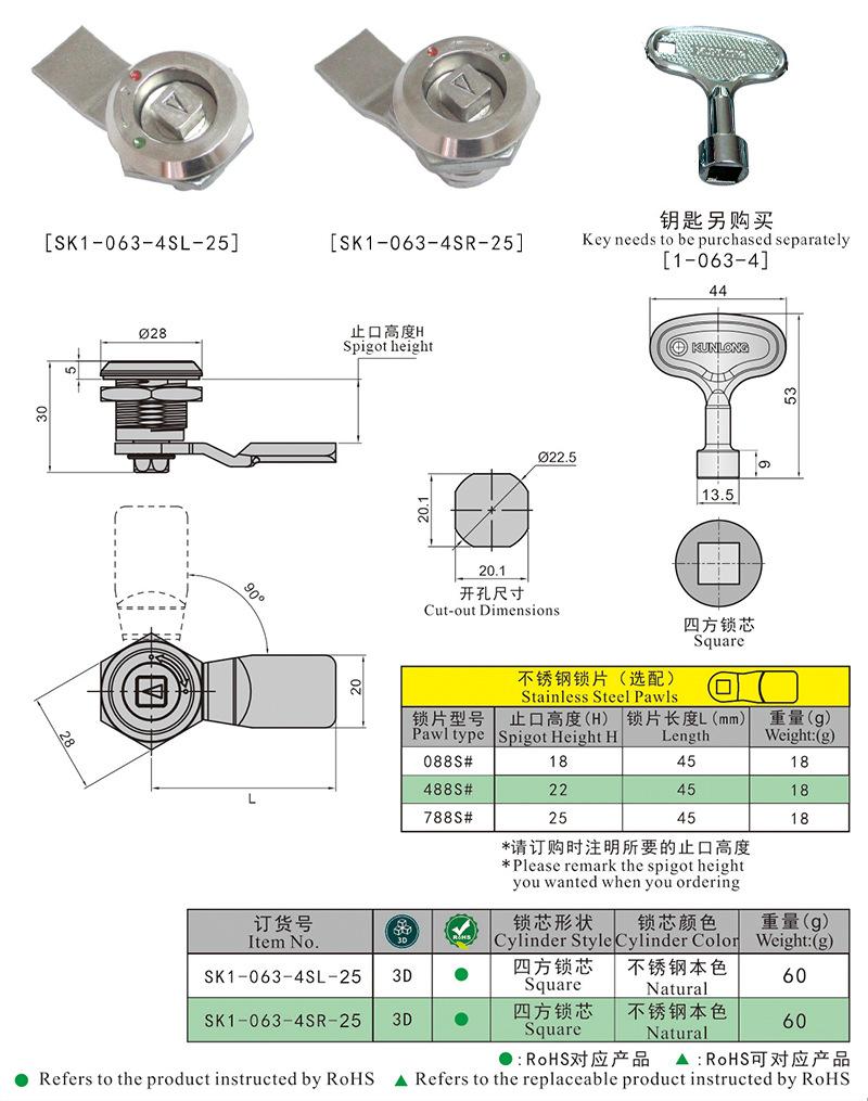 Shangkun SK1-063-4SR-25 Acero Inoxidable Cerradura para Puerta de Archivero de Oficina Gabinete de Control Caja Eléctrica Puerta Interruptor Cabezal de Cerradura Exhibición del Producto: