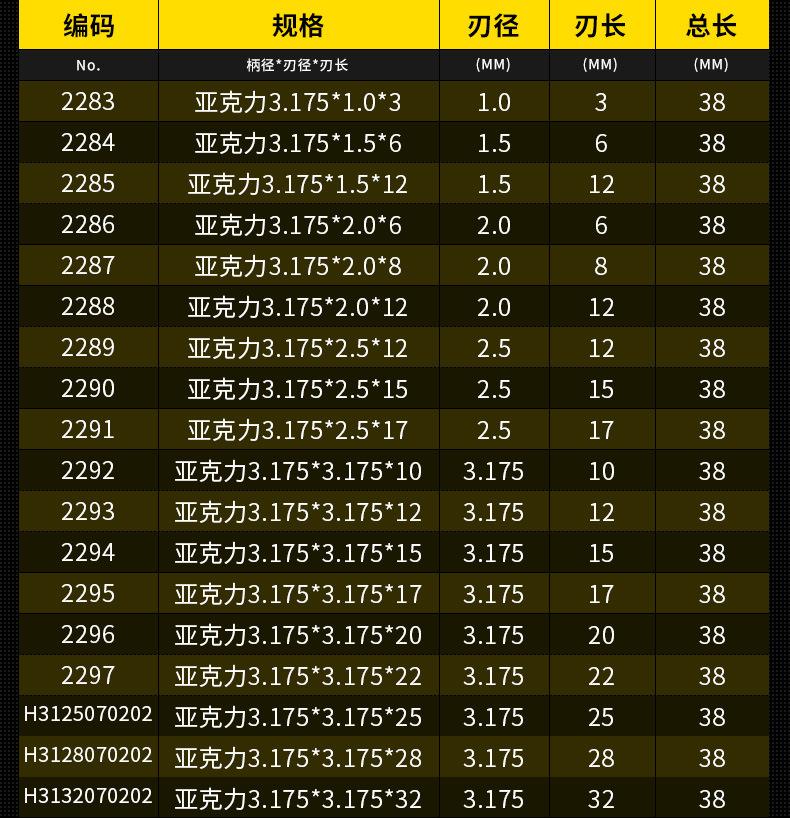 3.175*1.0*3*38, 3.175*1.2*6*38, 3.175*1.5*6*38, 3.175*1.5*12*38, 3.175*2.0*4*38, 3.175*2.0*6*38, 3.175*2.0*8*3...