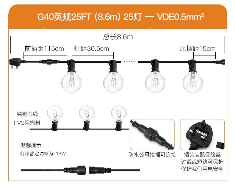 LED 7.6 meters 25 lights +2 bubble 25FT 220V British G40LED string lights UKCA certification