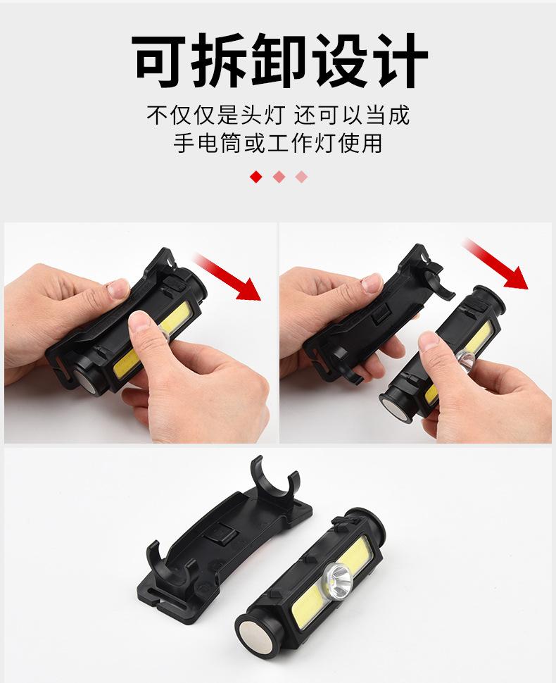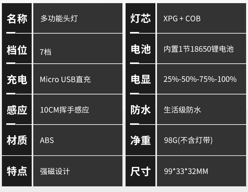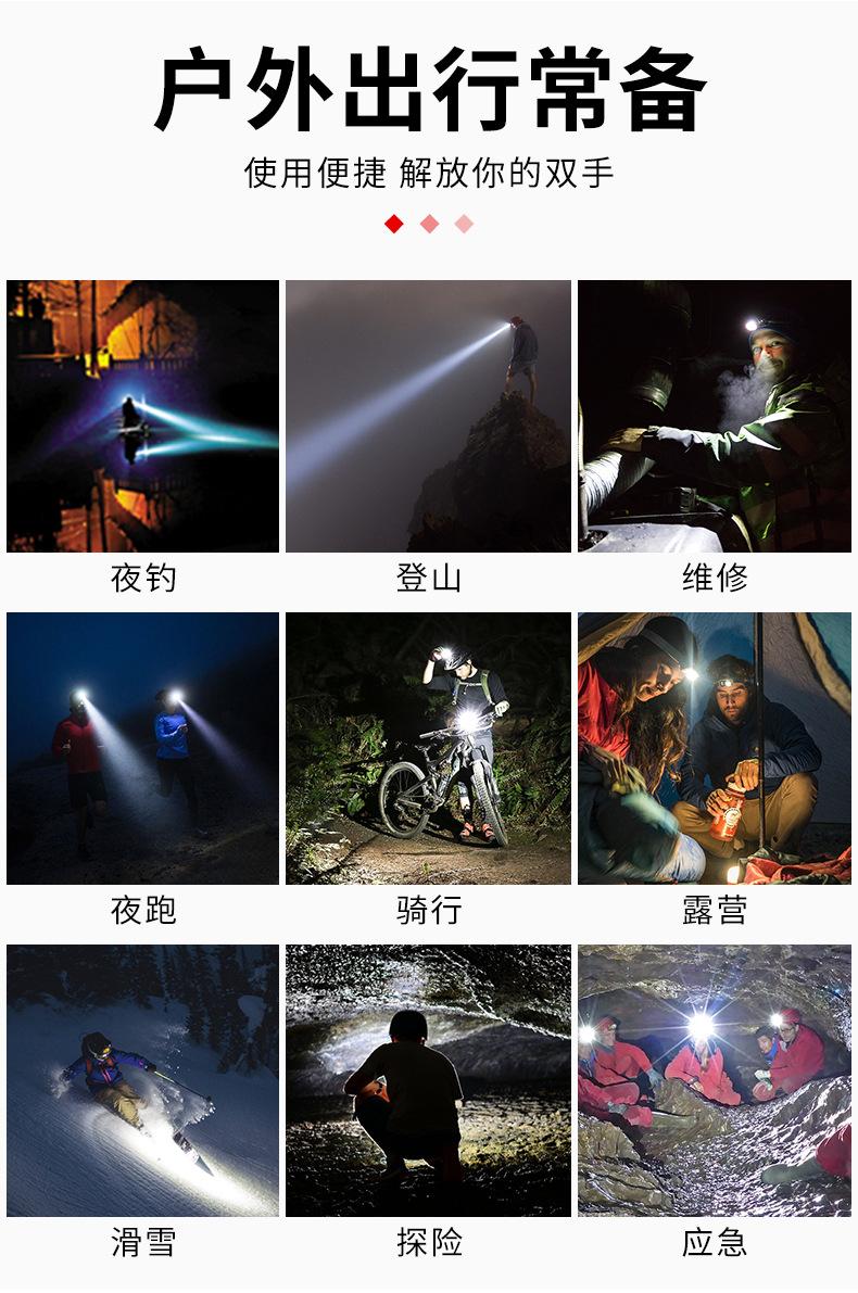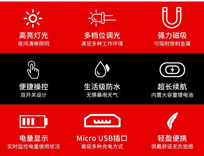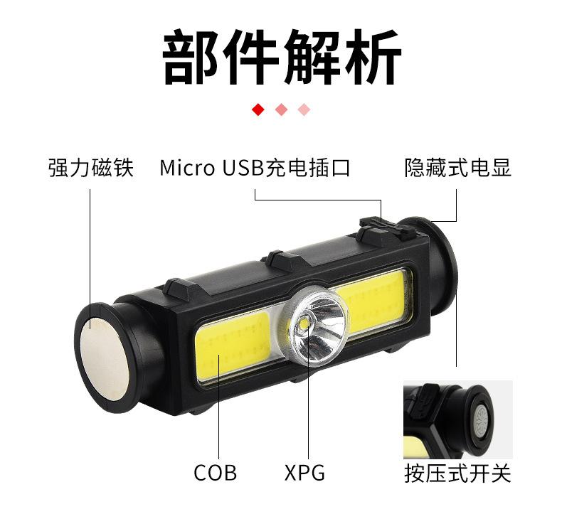 [Características del producto]: 1. Linterna frontal multiusos: La parte del faro de la linterna frontal es desmontable y se puede utilizar como una linterna de mano después del desmontaje. La linterna frontal viene con un potente imán que se puede adsorber en objetos de hierro. 2. Luz indicadora de batería: Luz indicadora azul de 4 segmentos (25%-50%-75%-100%), control en tiempo real del uso de la batería