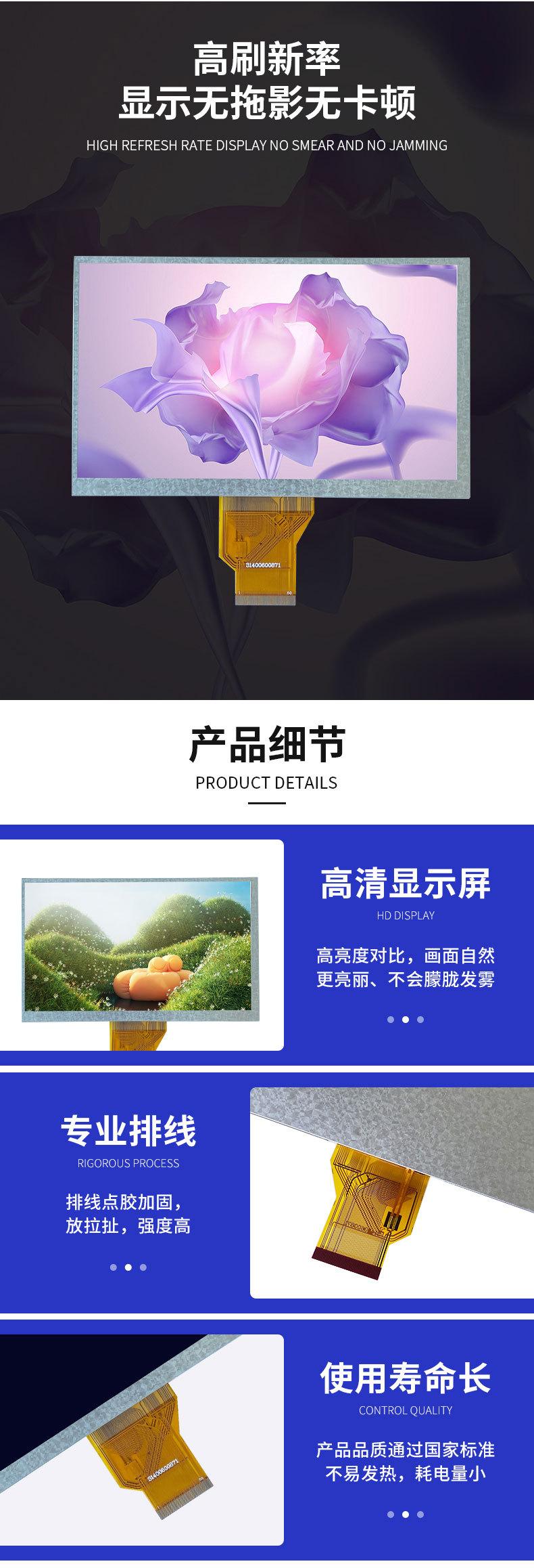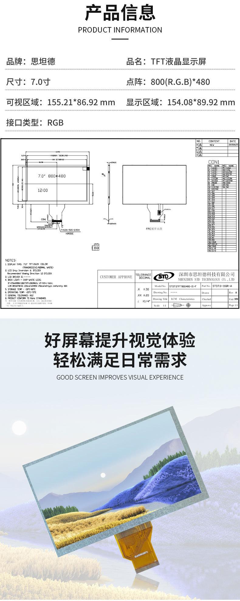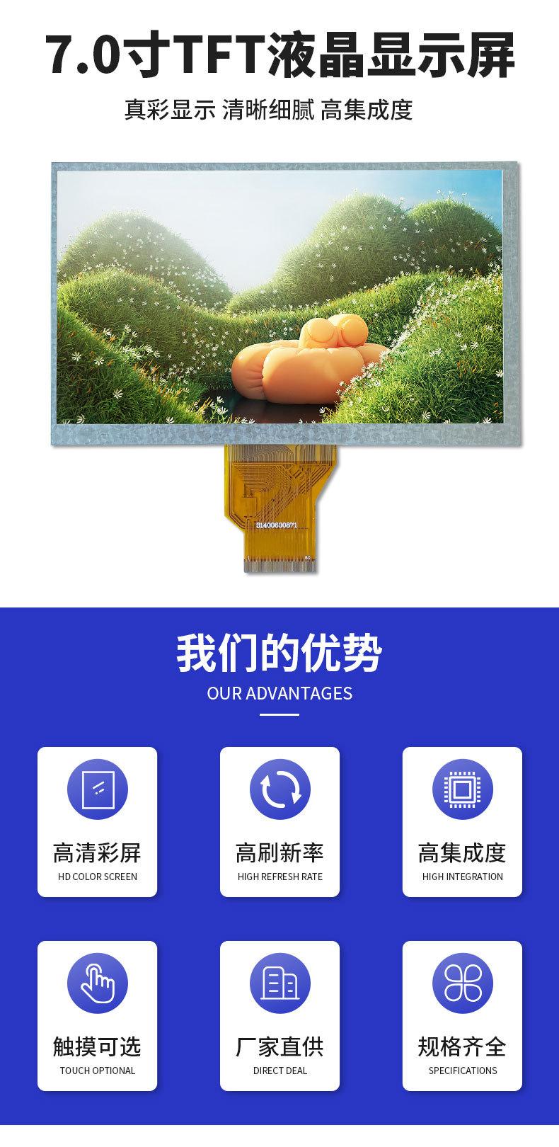 Pantalla LCD TFT a color de 7,0 pulgadas, interfaz RGB de 250 brillos, módulo 800*480