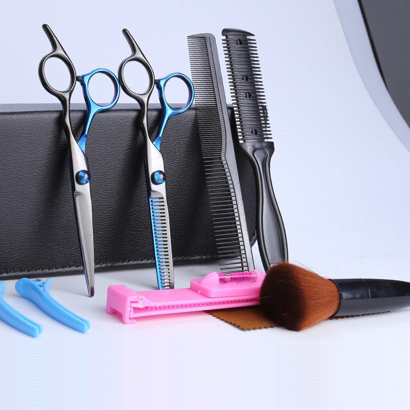 Fabricante de tijeras de barbero, herramientas de traje, suministro directo, tijeras planas de platino, flequillo volador, tijeras de peluquería, tijeras profesionales de entresacar, negras y azules