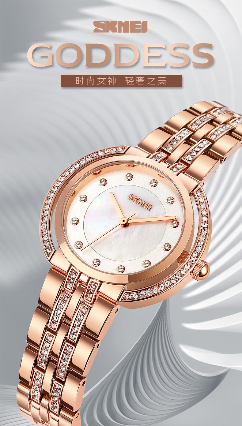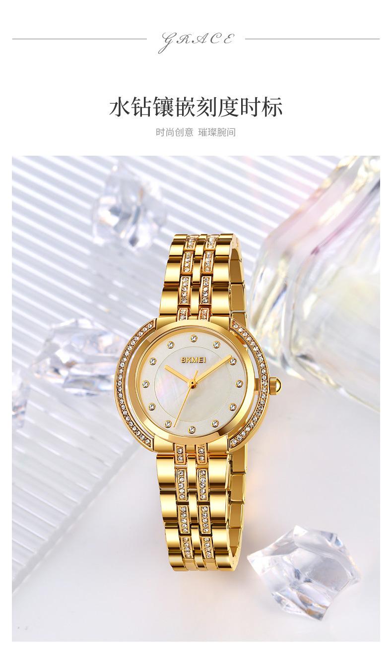 Hermoso reloj de cuarzo Skmei para mujer, elegante, con incrustaciones de diamantes, para estudiantes, con pulsera totalmente combinable.