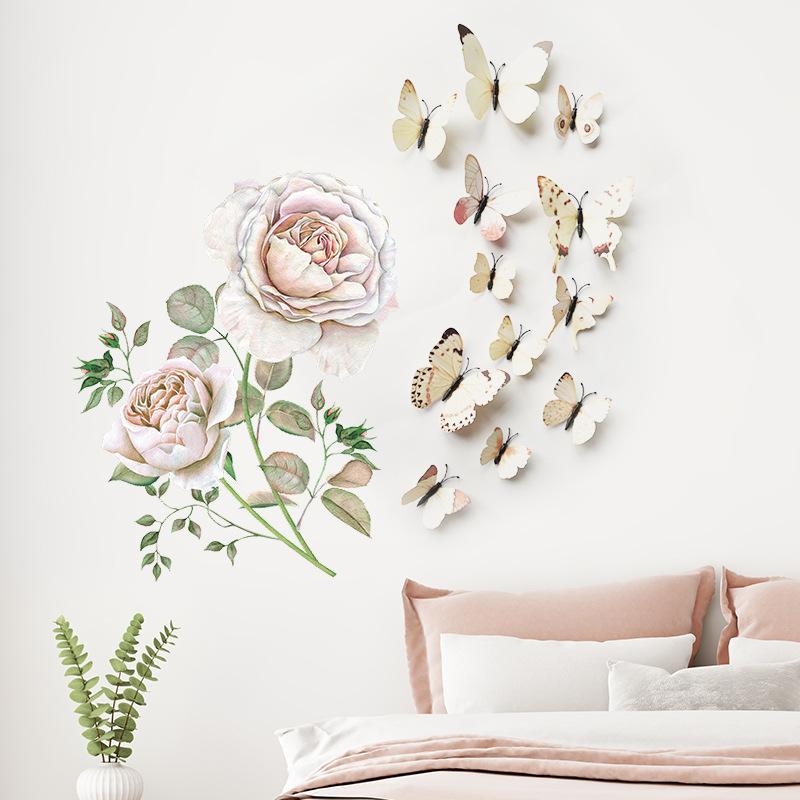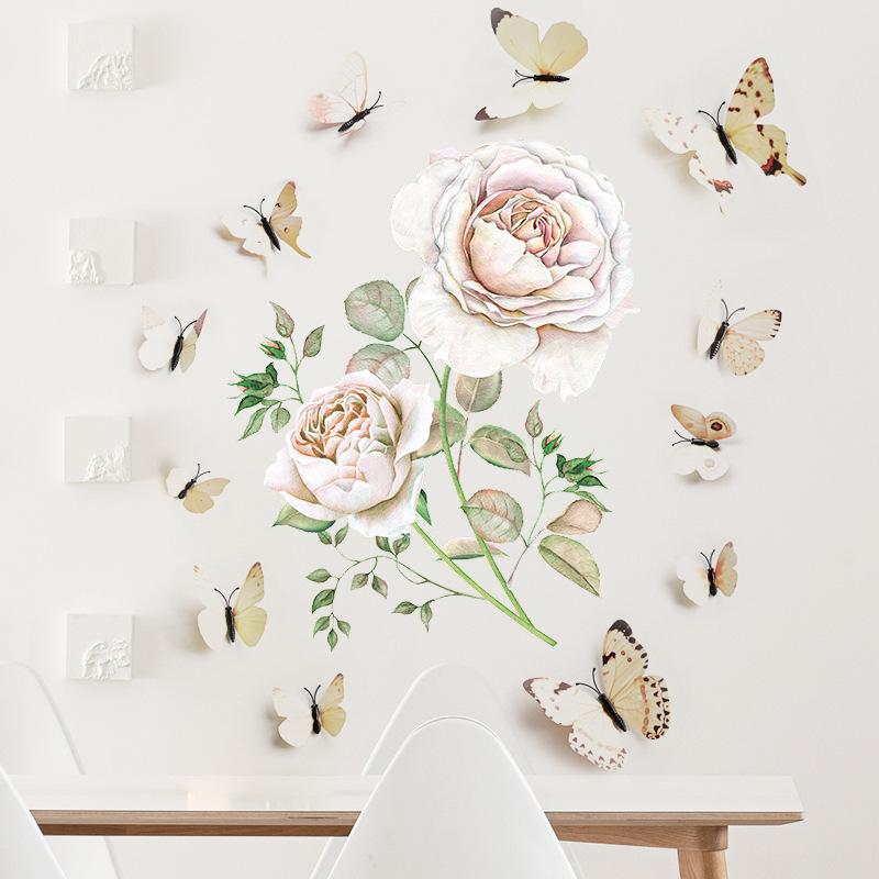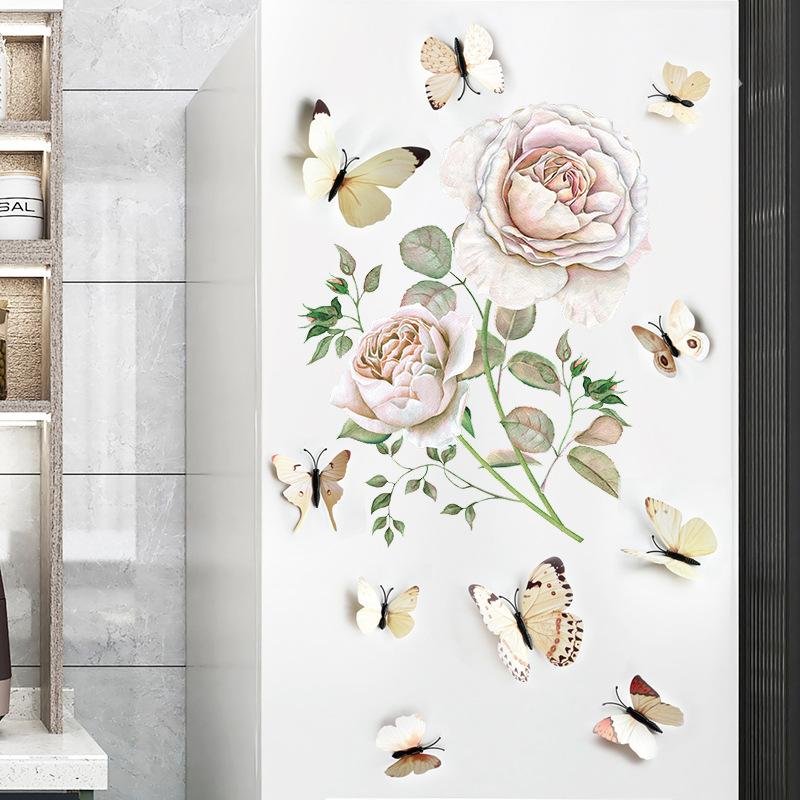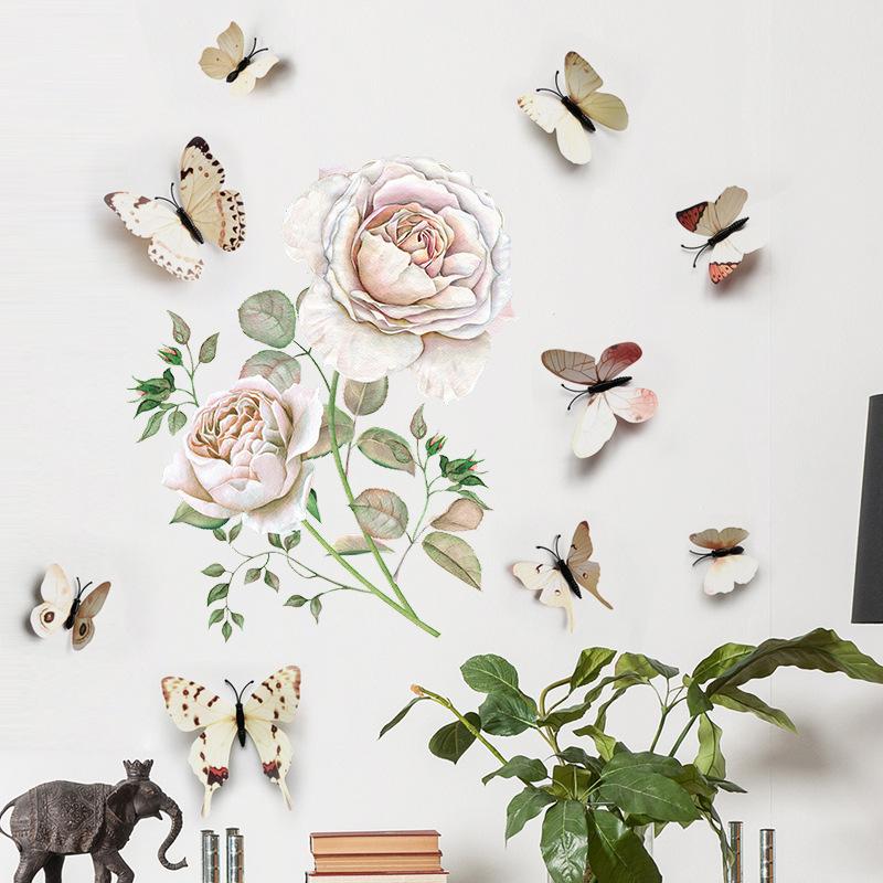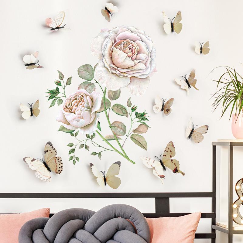 Nuevo FX-F302 + Mariposa blanca en flor de durazno, rosa rosa, mariposa tridimensional, pegatinas decorativas de pared para el hogar.