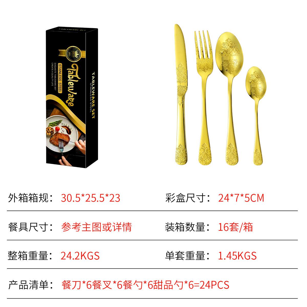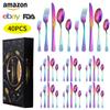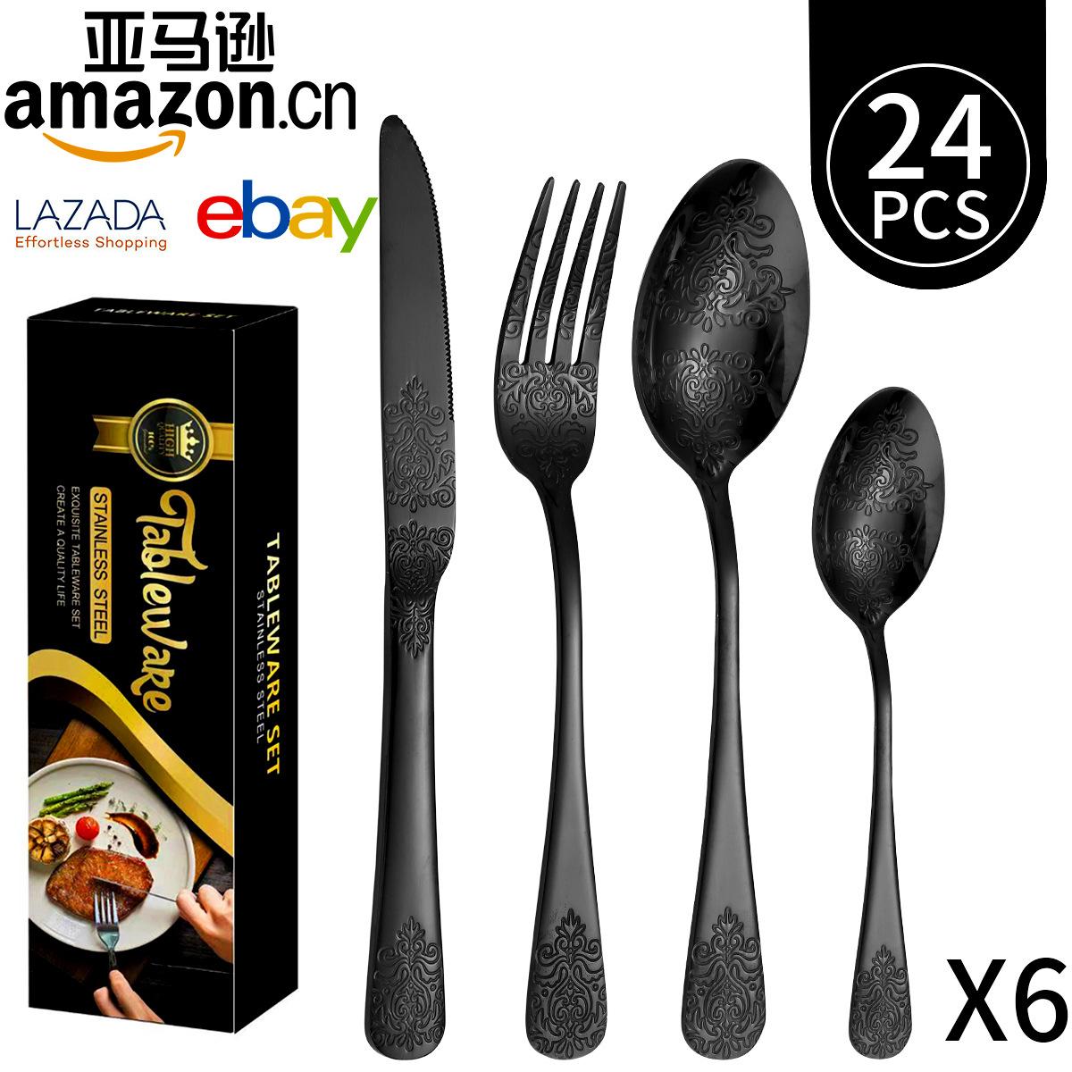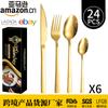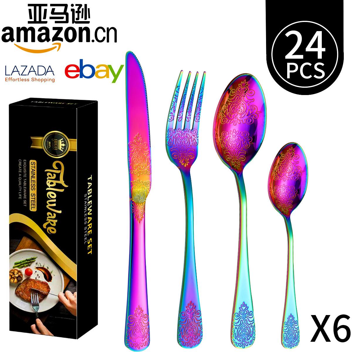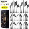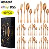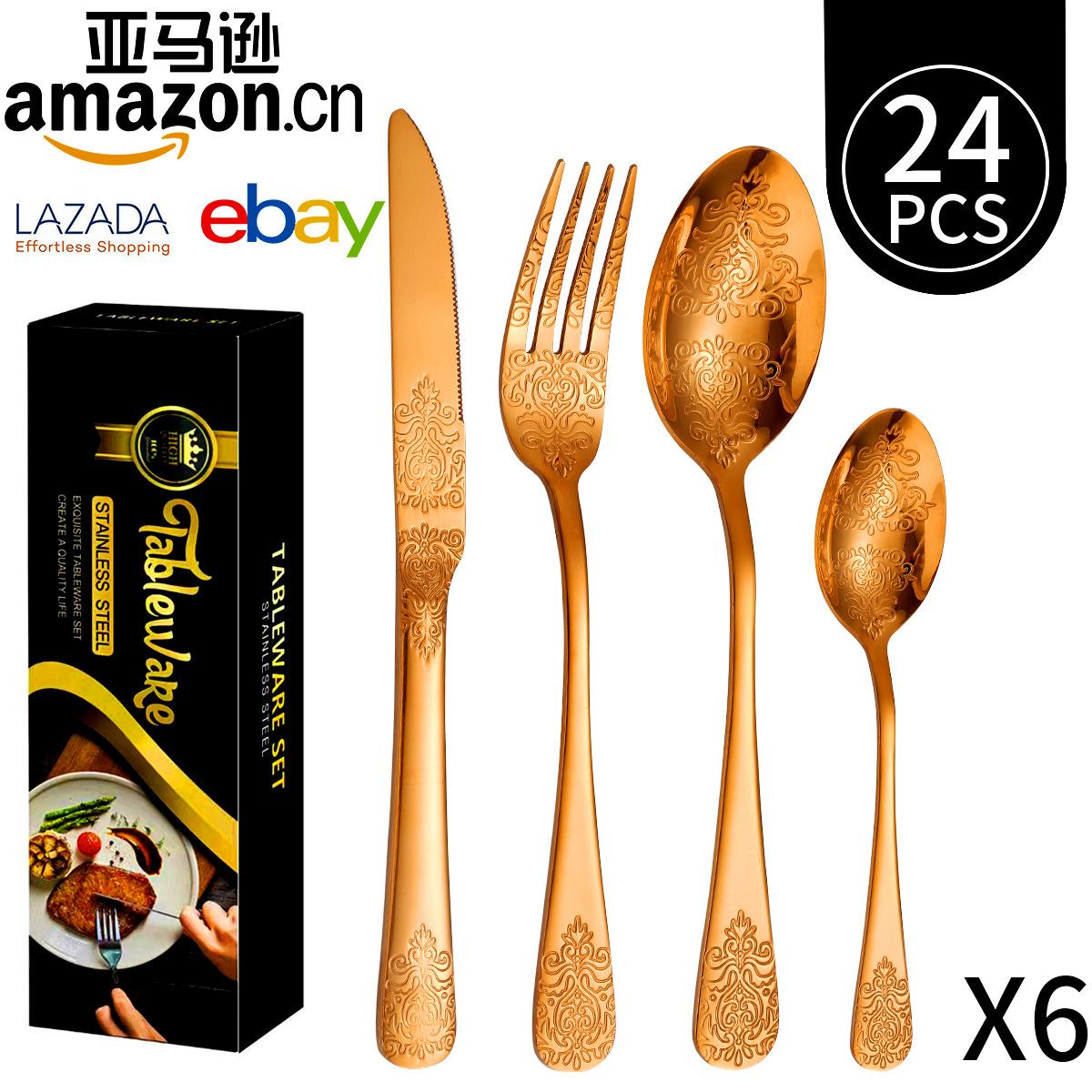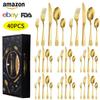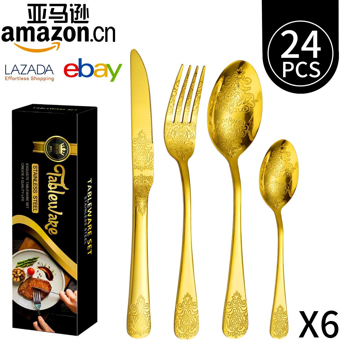 Juego de vajilla de acero inoxidable estilo occidental, 24/40 piezas, 430 piezas, con patrón de Amazon, cuchillo y tenedor para carne, cuchara, color dorado.