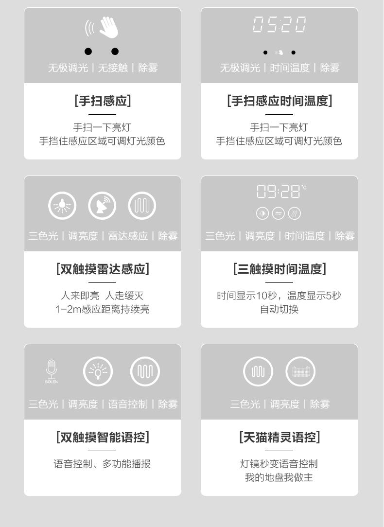 Cut down [three-color light + brightness adjustment] Human body induction + six touch Bluetooth time + calendar week temperature + defogging + explosion-proof