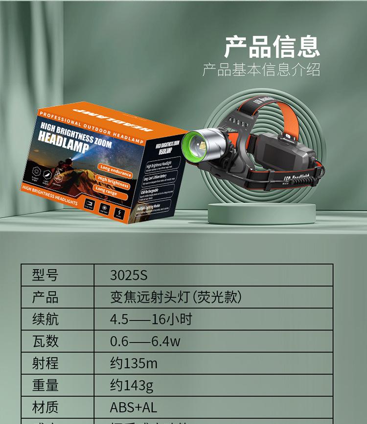 3025s zoom headlamp 260lm with 2 1200 mA 18650 batteries
