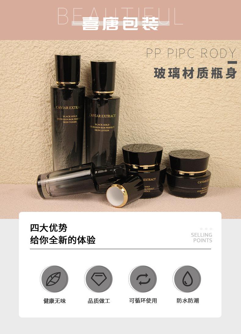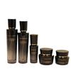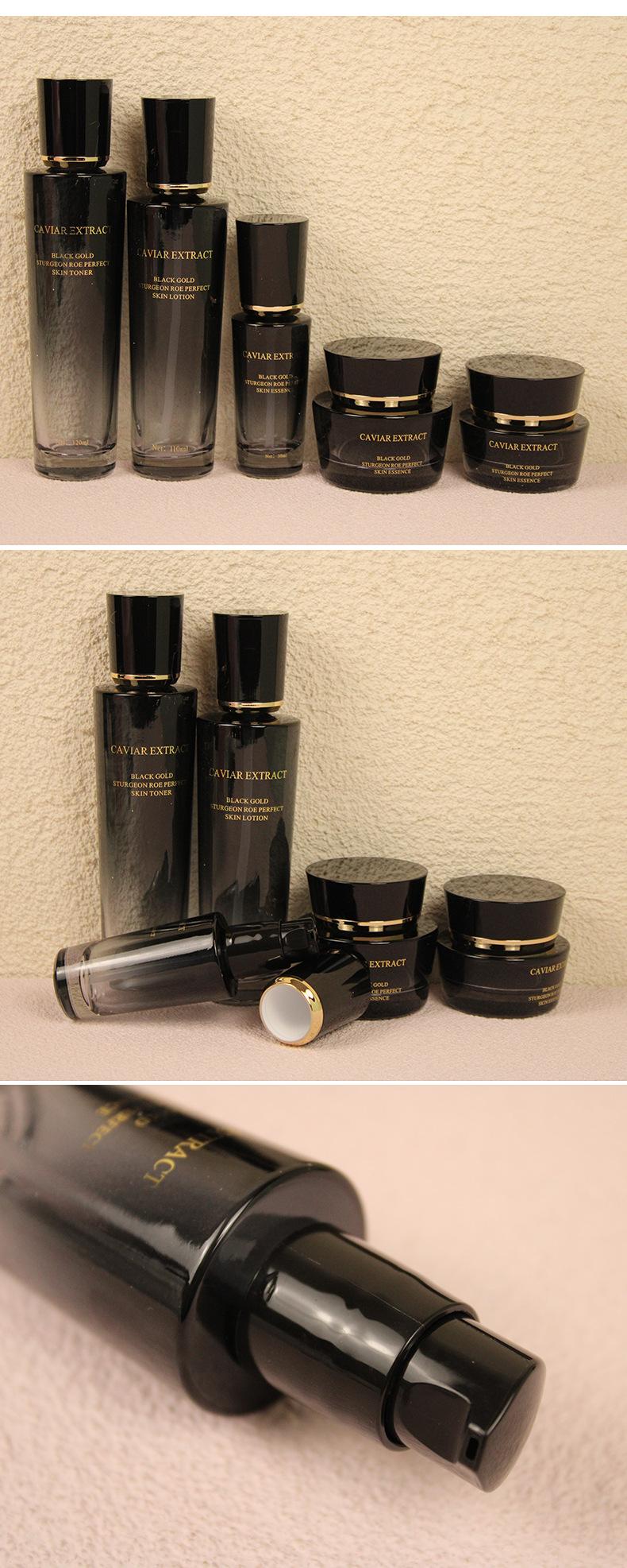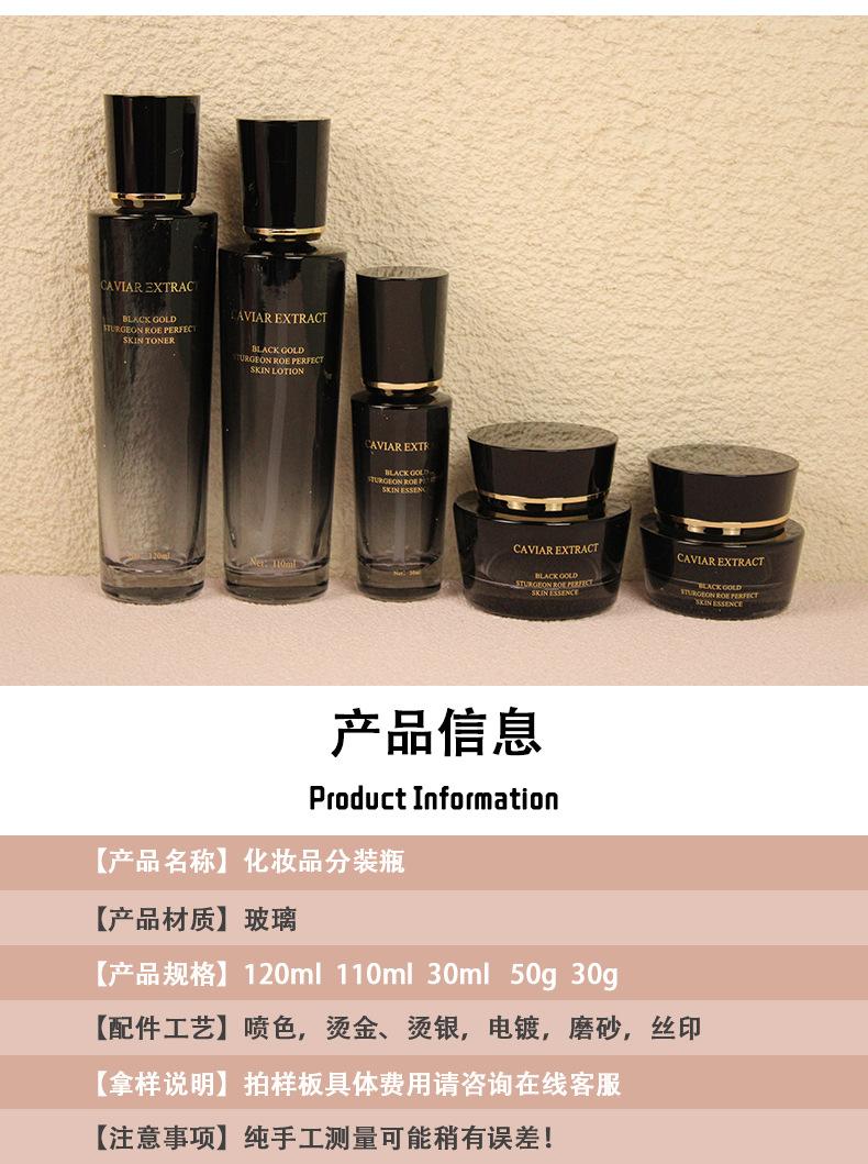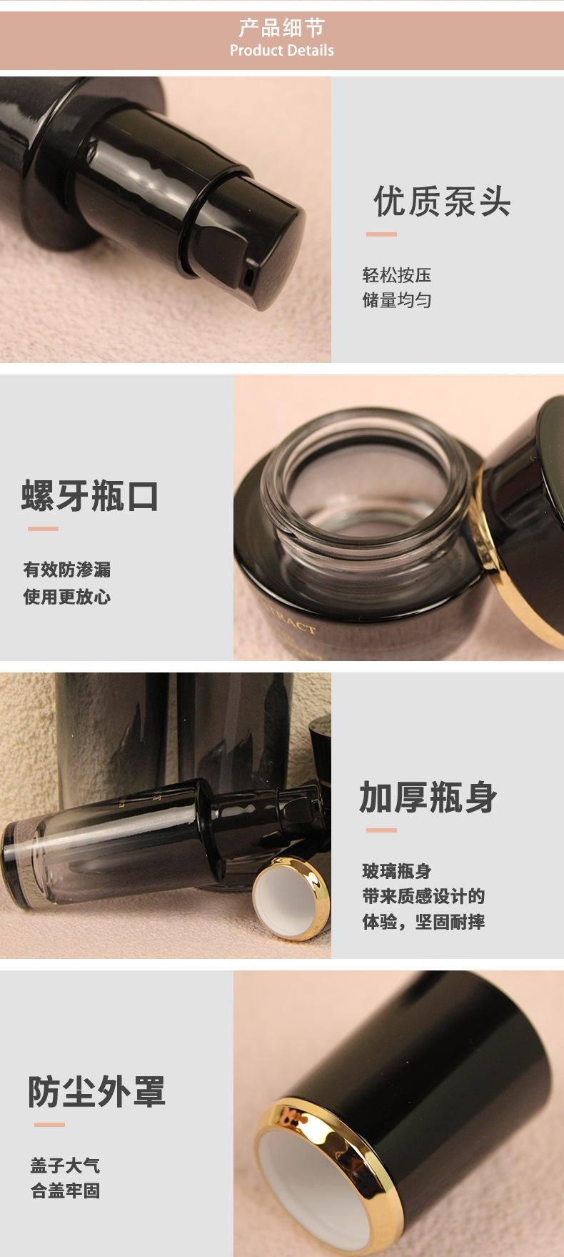 Botella de esencia, pequeña botella negra, botella de vidrio de fondo grueso de alta gama, botella cosmética, material de embalaje, fábrica, botella para agua, leche, crema.