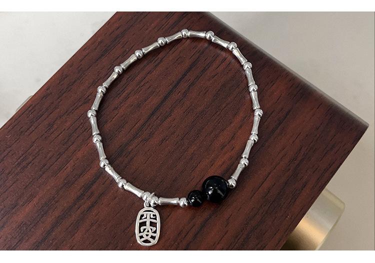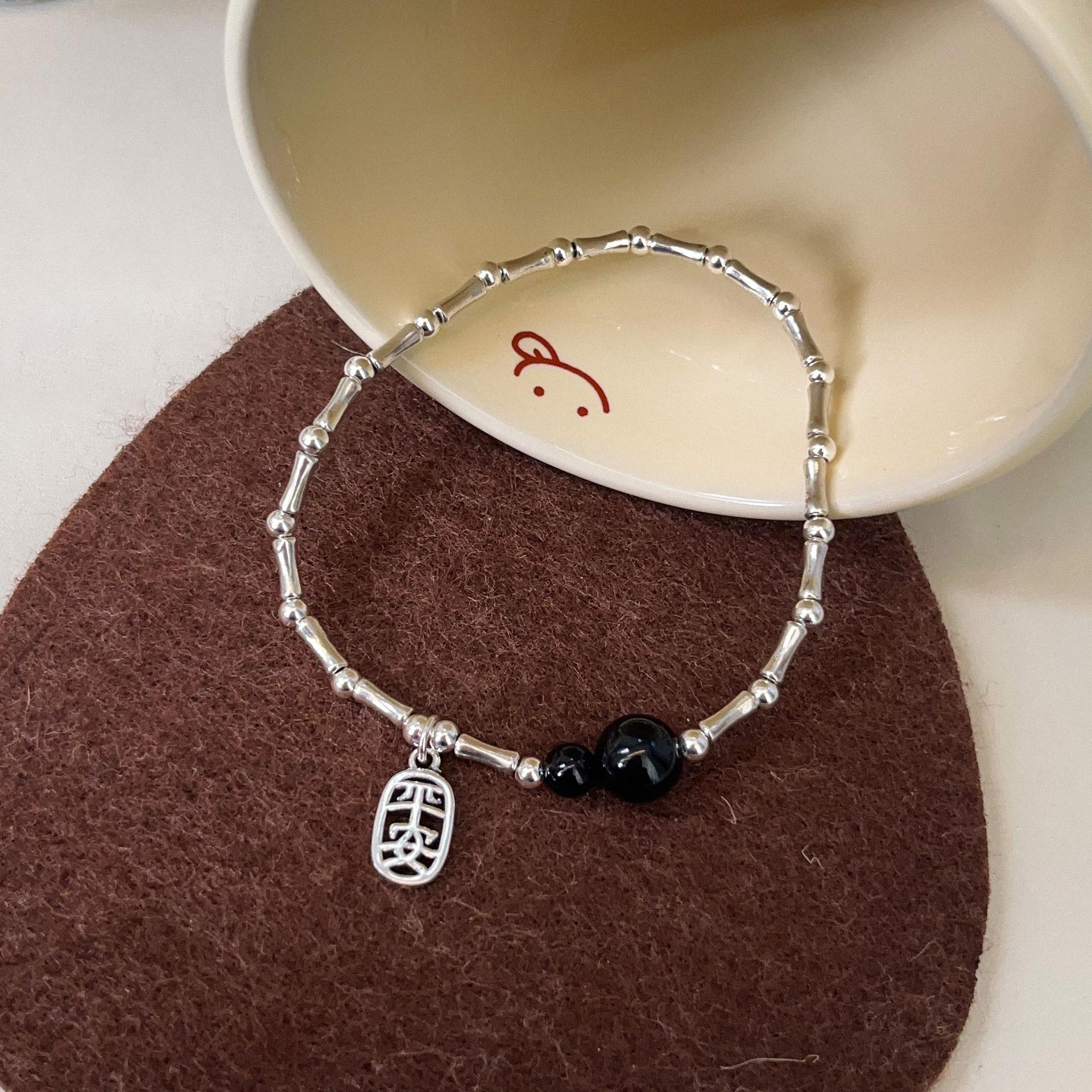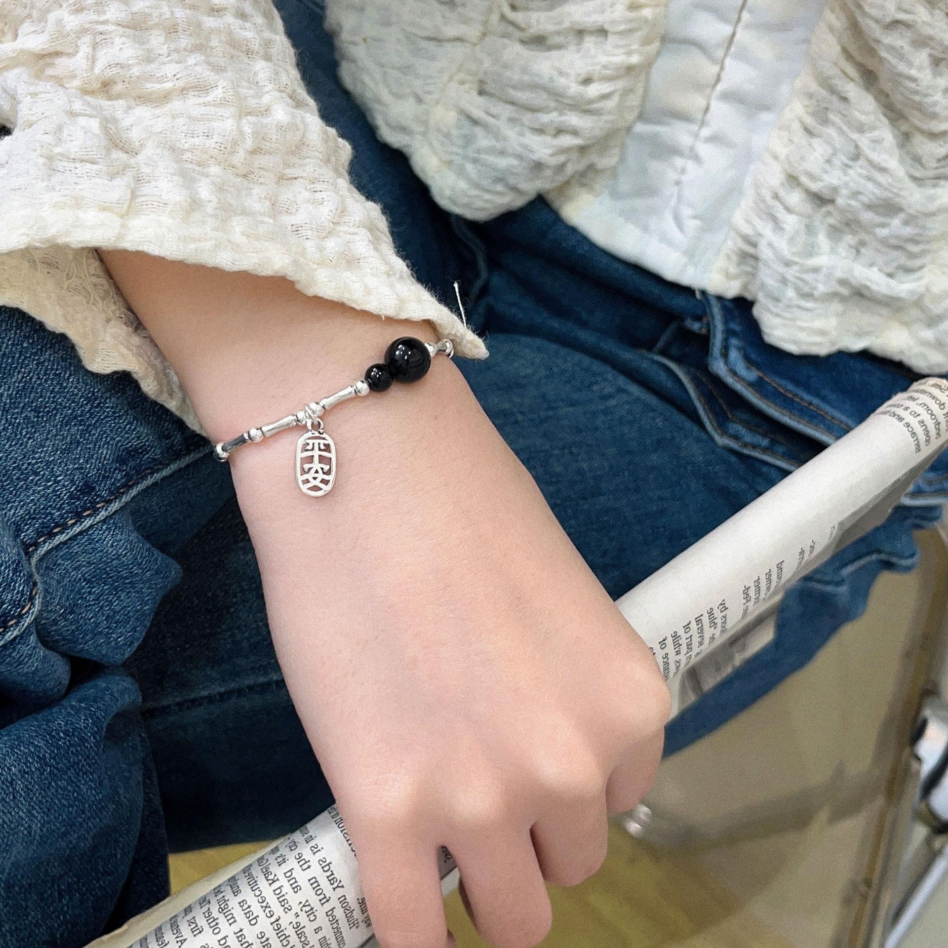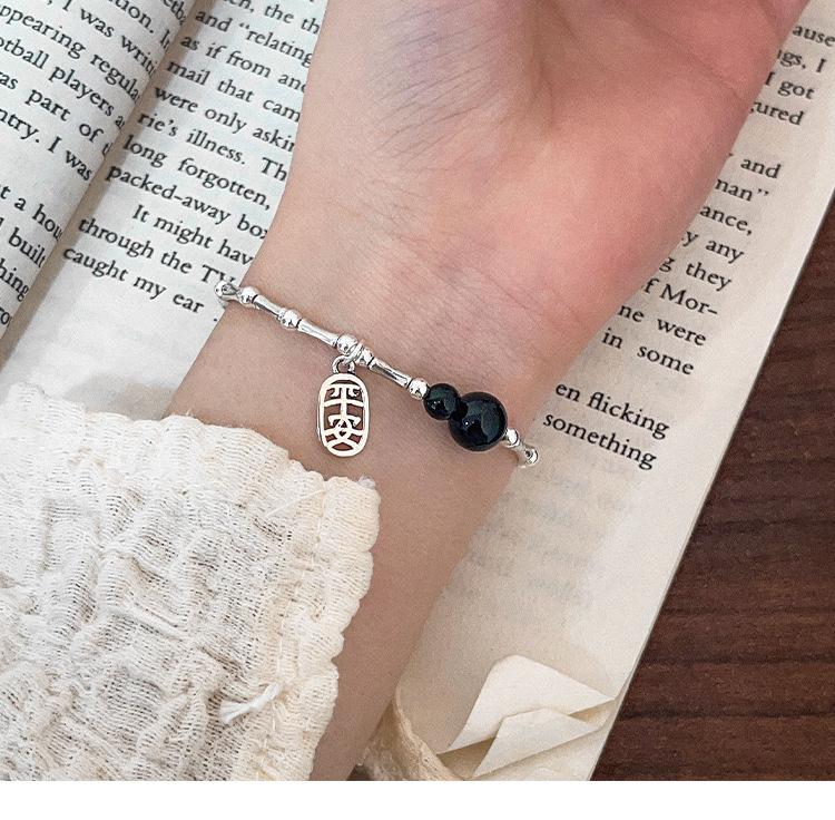 Pulsera Yinruitai s925 de plata esterlina para mujer, estilo nacional, con ágata negra, diseño original de nicho retro Fu Lu Ping An.