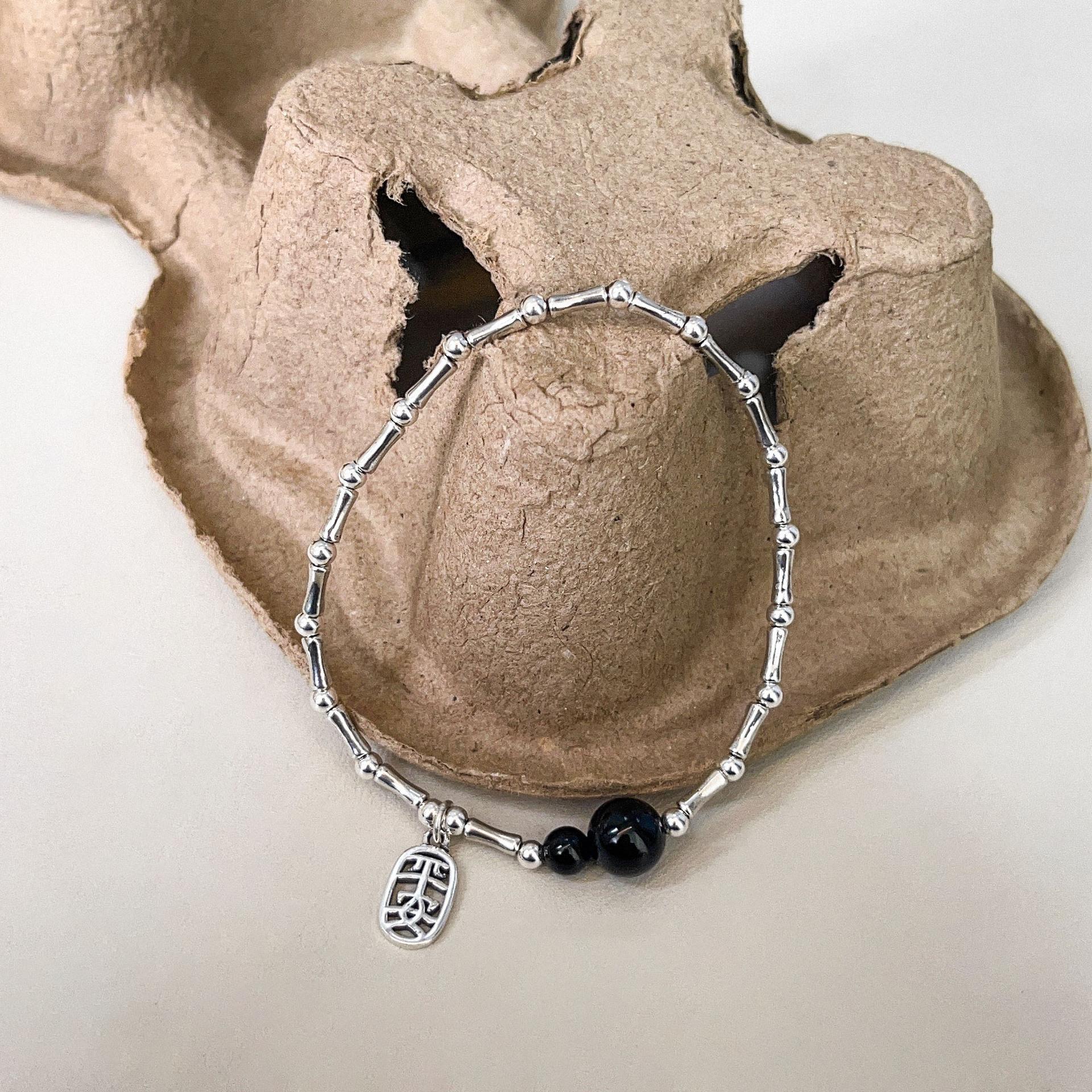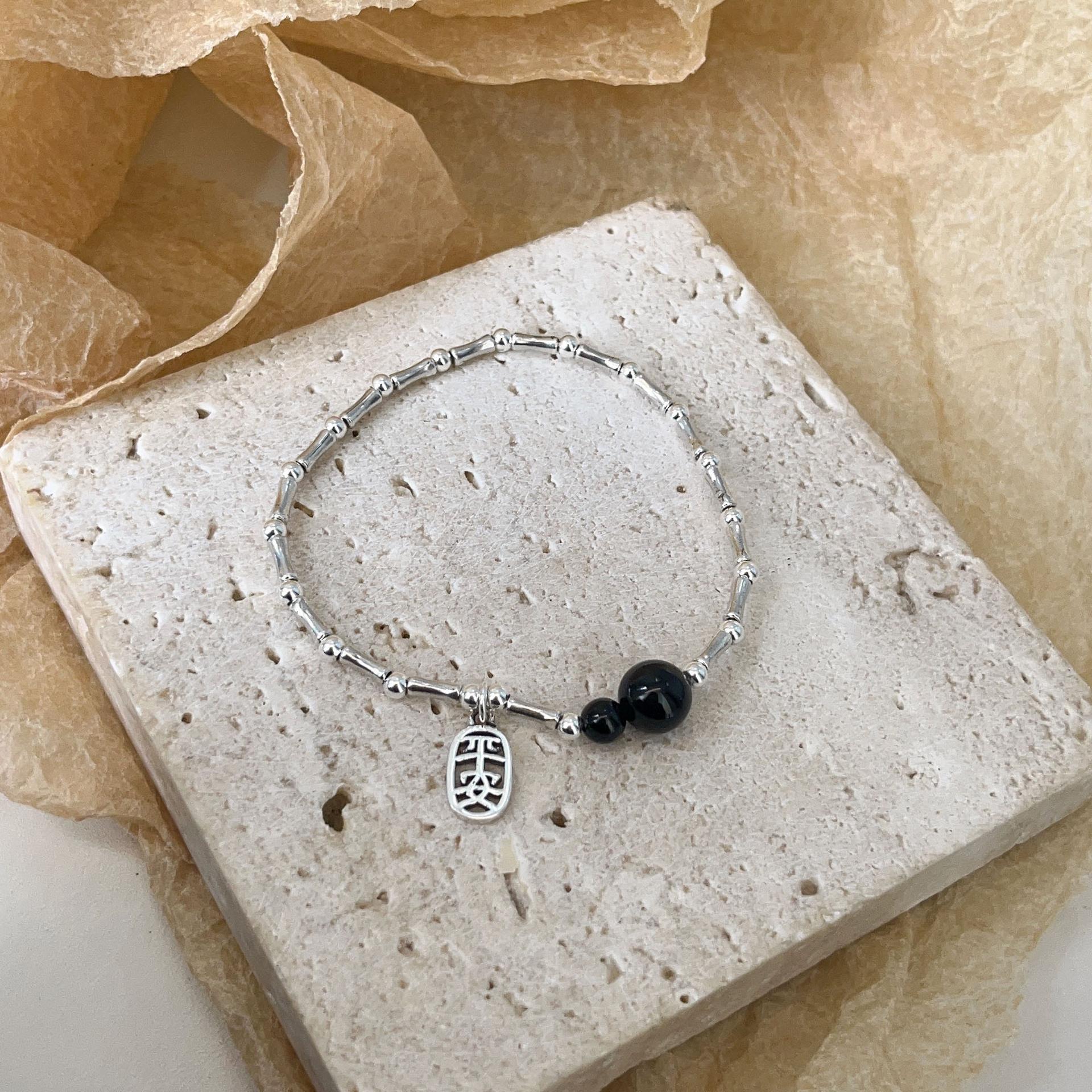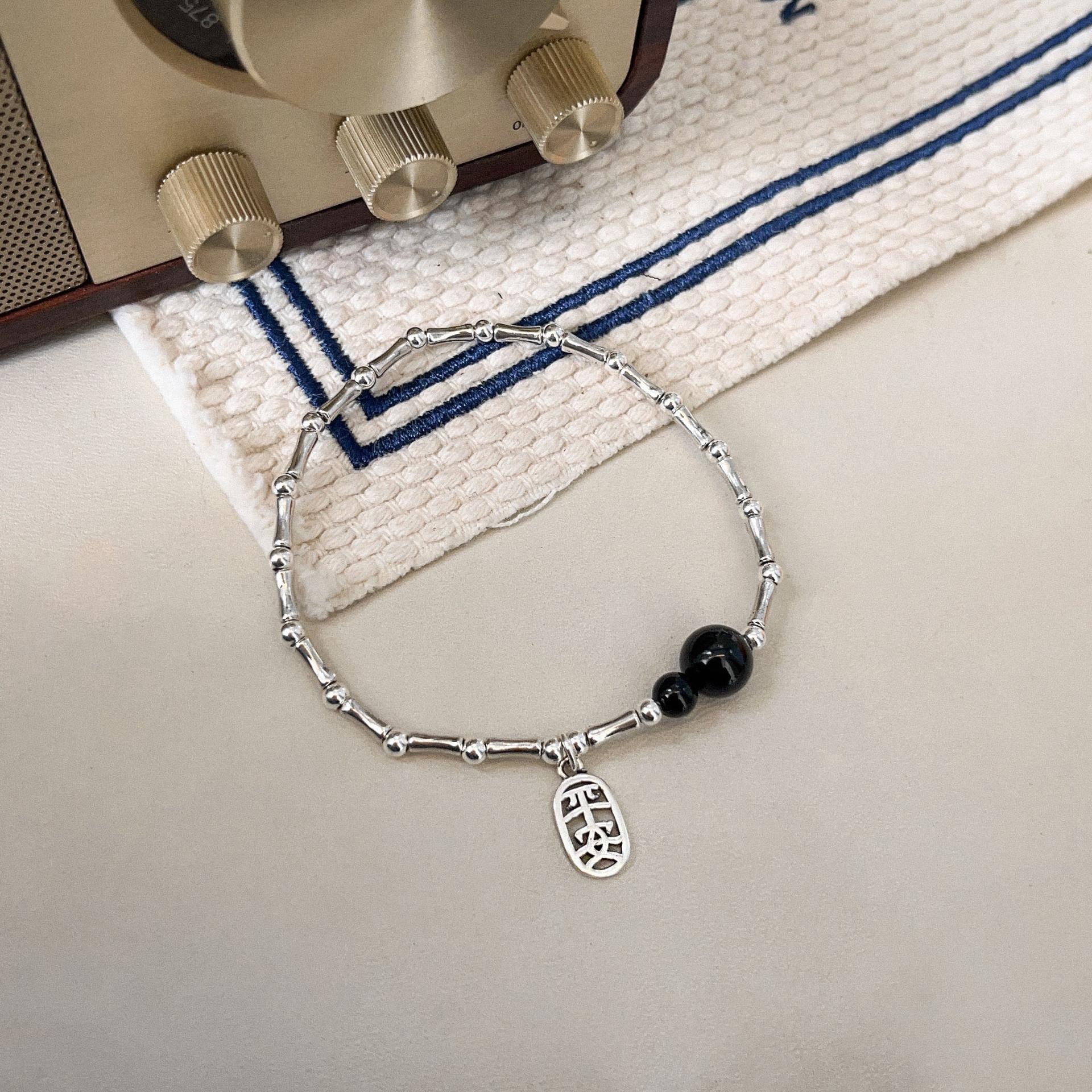 Pulsera Yinruitai s925 de plata esterlina para mujer, estilo nacional, con ágata negra, diseño original de nicho retro Fu Lu Ping An.