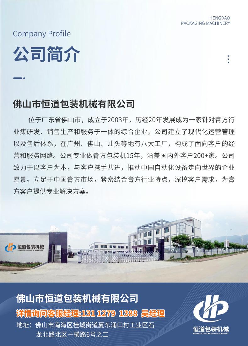 Foshan Hengdao maquinaria de embalaje Co., Ltd.Es una empresa moderna de maquinaria de envasado que se centra en la I+D, el diseño, la fabricación y la venta de productos de maquinaria de envasado, y cuenta con un sistema de gestión de calidad completo y científico. Nuestra maquinaria de envasado opera principalmente con máquinas de envasado de gránulos, salsas líquidas, polvos, artículos de primera necesidad, ferretería, papelería, suministros médicos, componentes eléctricos, juguetes y otros tipos de maquinaria de envasado.