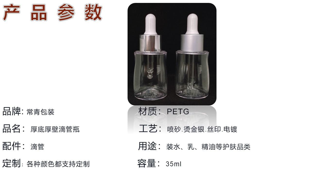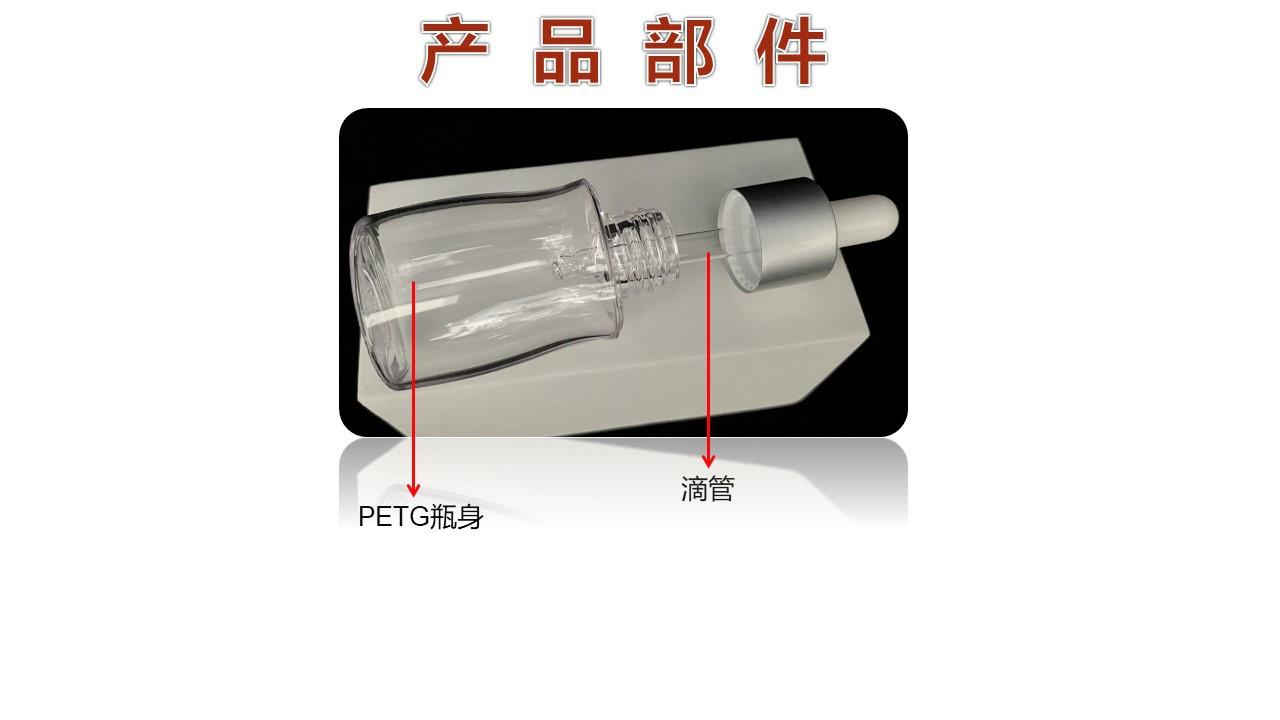 Botella vacía con forma de gotero de esencia cosmética de PETG, transparente, fondo grueso, pared gruesa, material de embalaje cosmético para el cuidado de la piel
