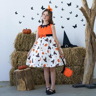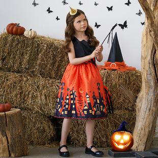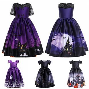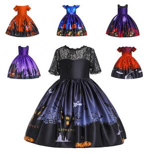 Vestido de princesa infantil de comercio exterior europeo y americano, estampado de Halloween, disfraz de cosplay de dibujos animados, encaje, disfraz de actuación, Halloween