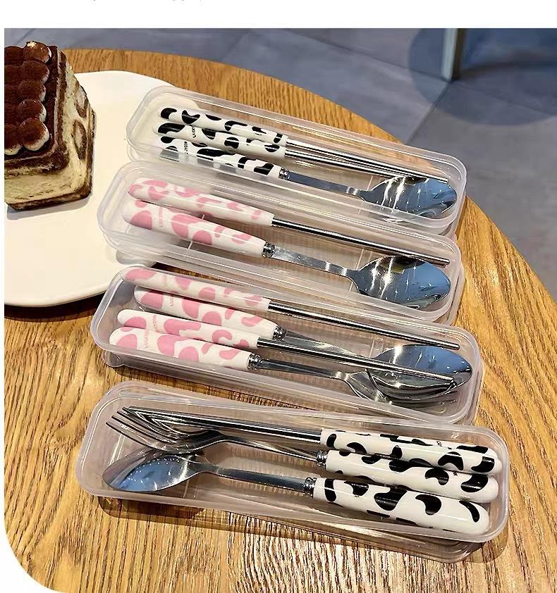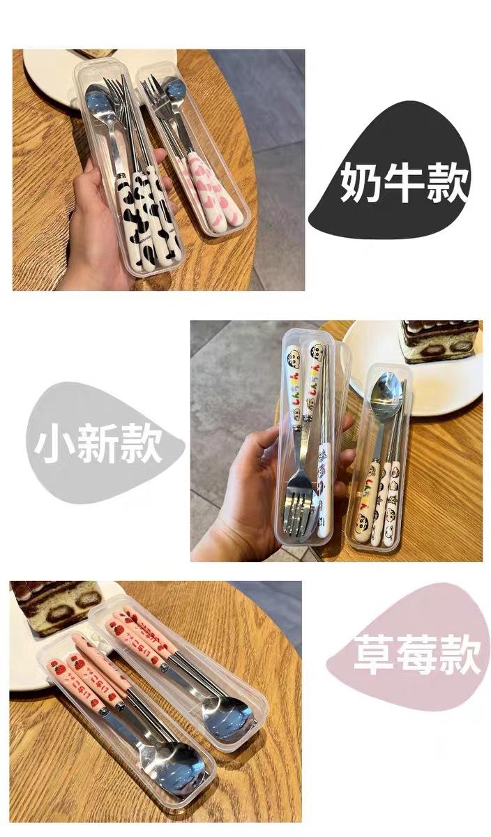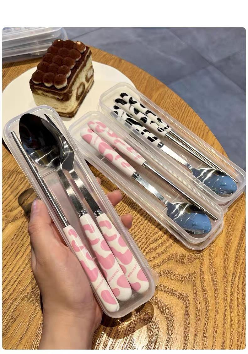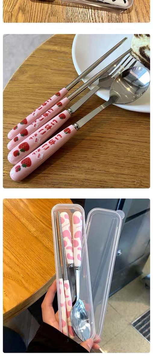 Lindos palillos de acero inoxidable, cuchara, traje para estudiante femenina, cuchara, tenedor, vajilla infantil de tres piezas de aspecto alto