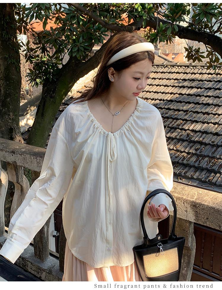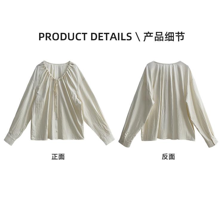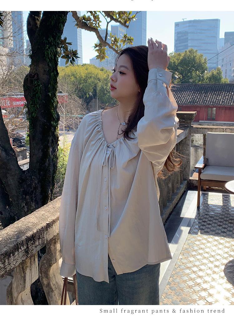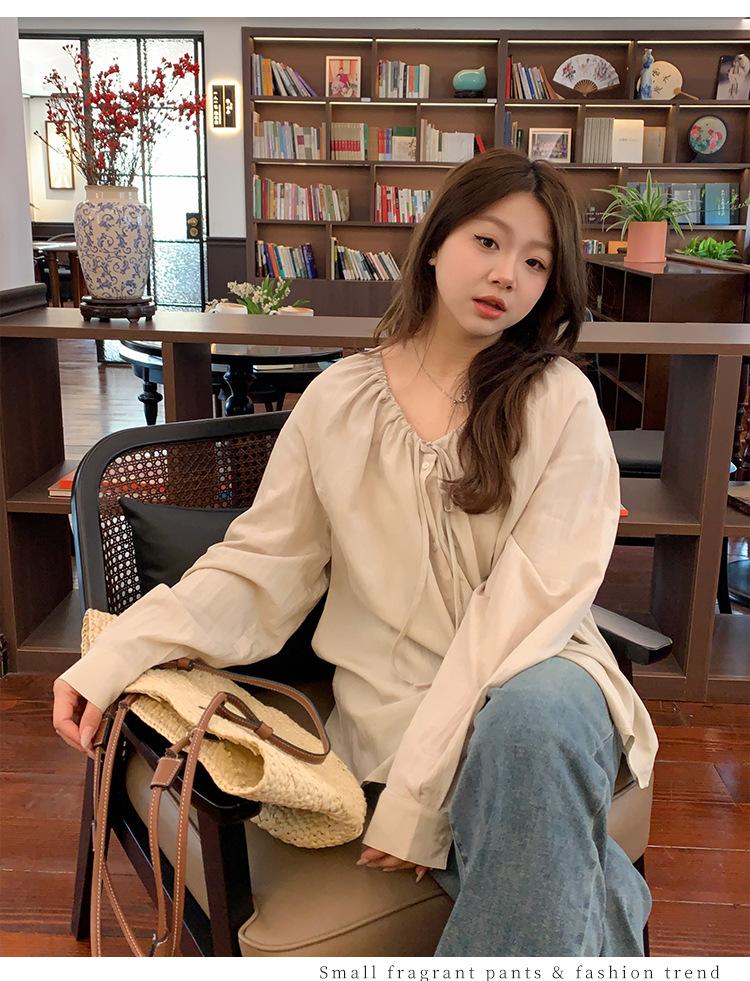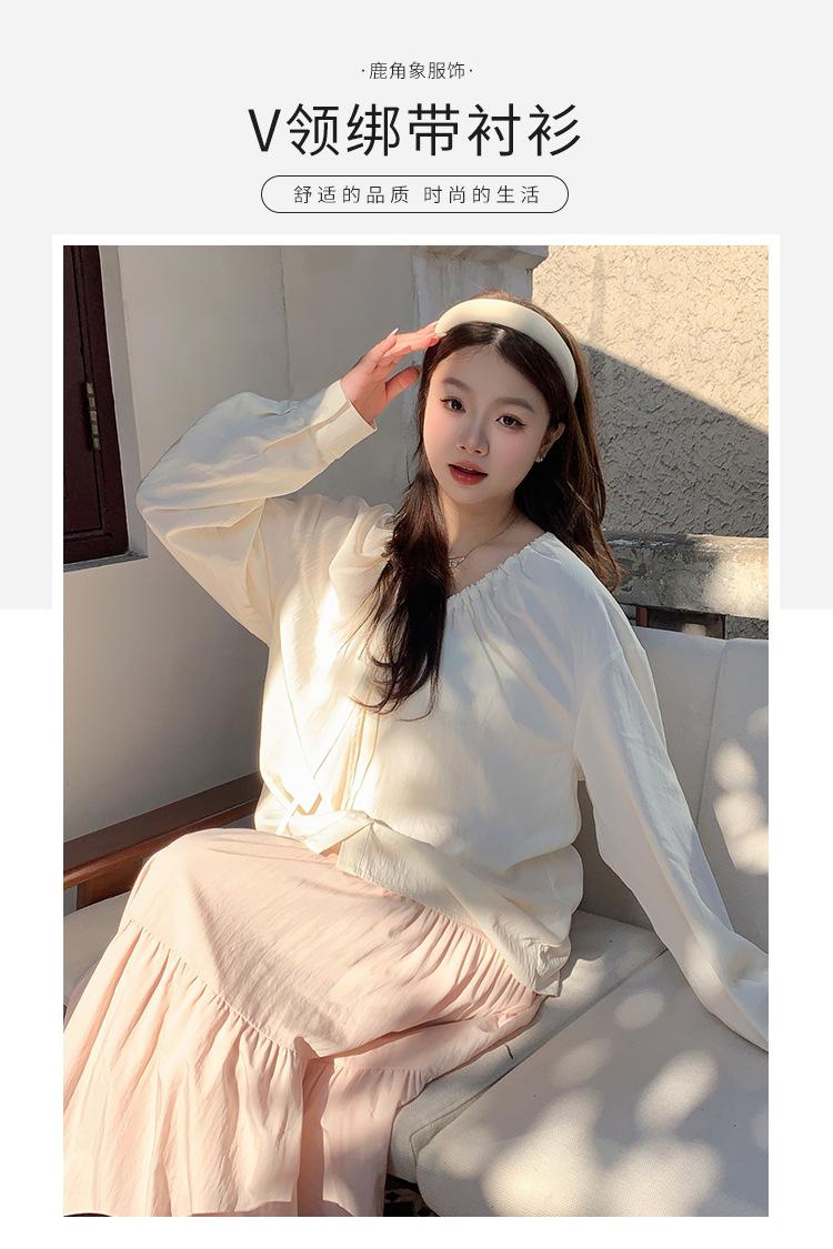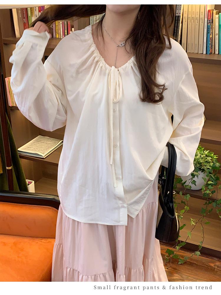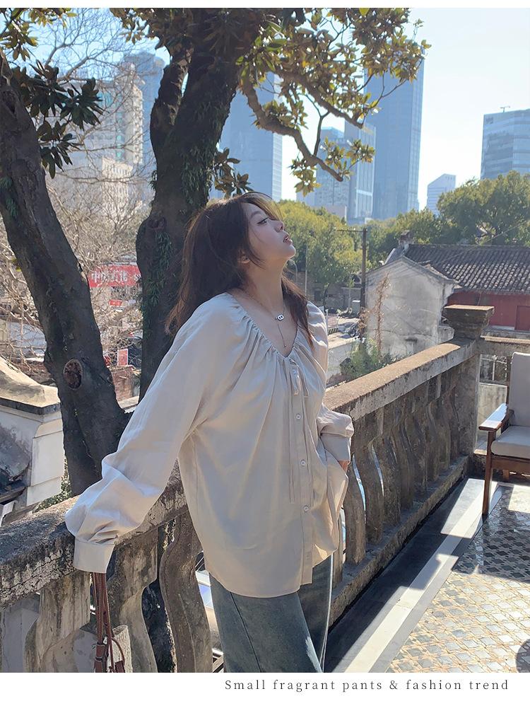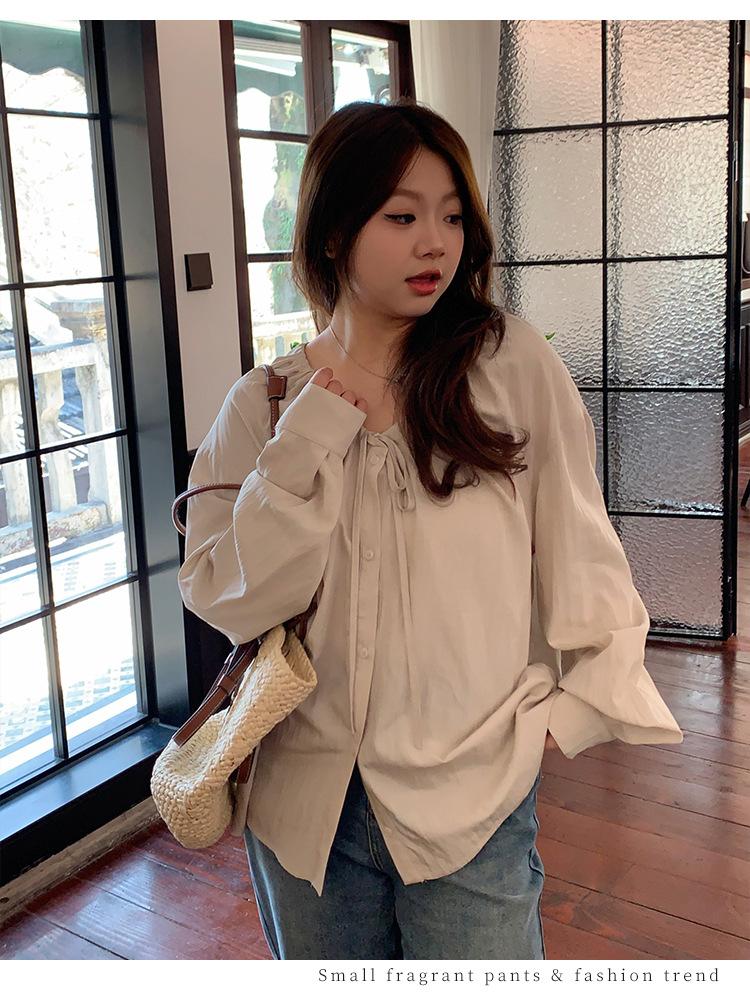 Elegante camisa de encaje con cordones y cuello en V para mujer de talla grande, diseño cómodo y holgado de manga larga estilo dama