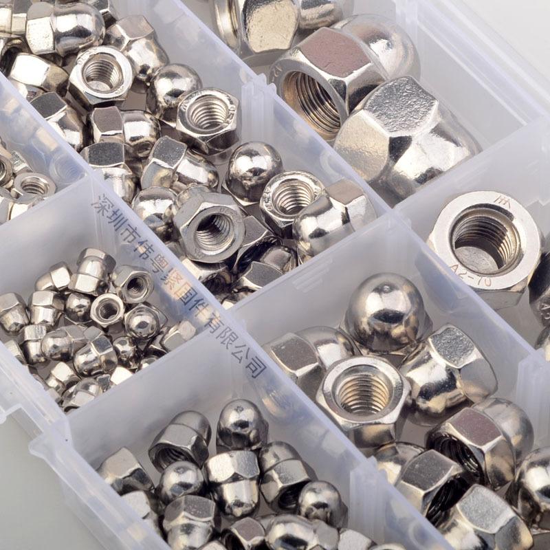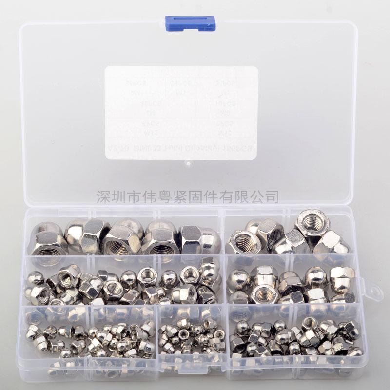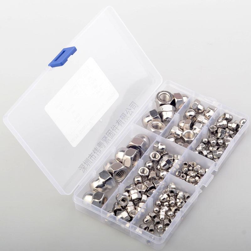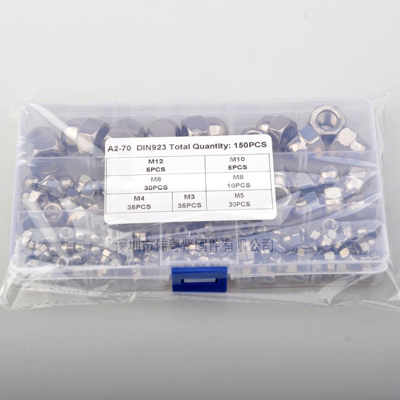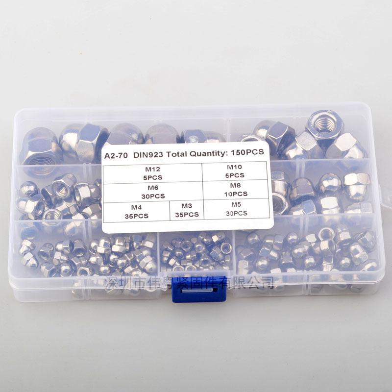 150 piezas M3 M4 M5 M6 M8 M10 M12 Acero inoxidable 304 DIN923 juego combinado de tuercas de sombrerete Peso neto del producto: 604g