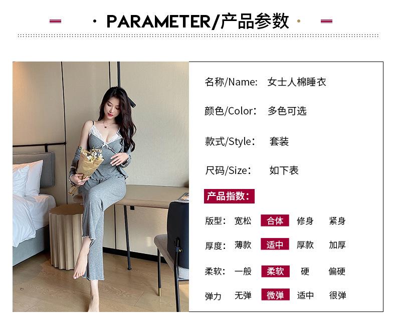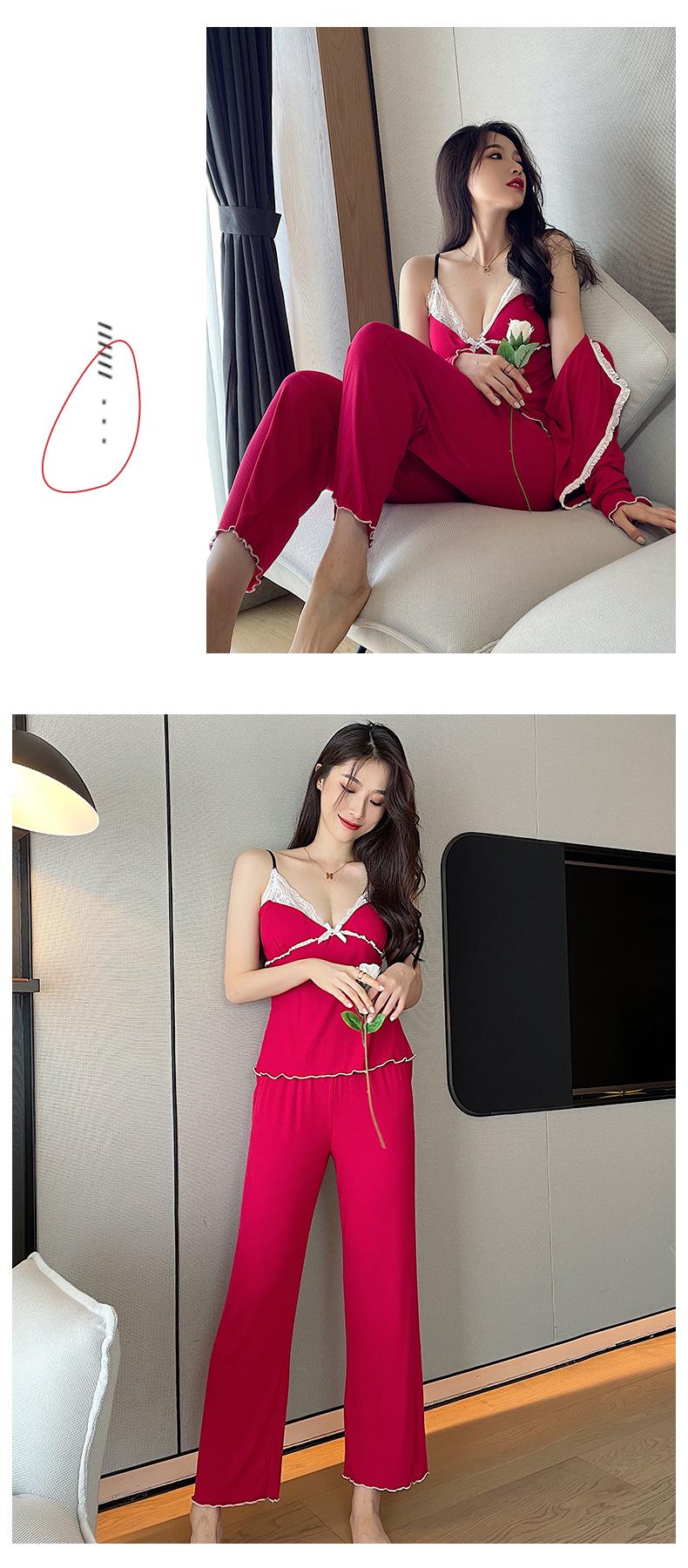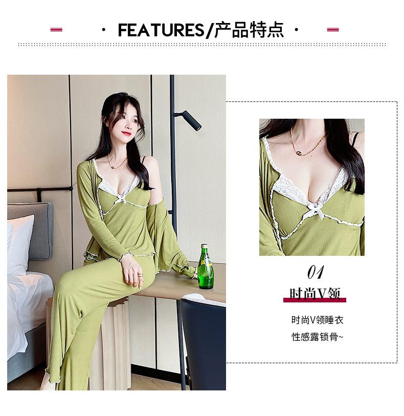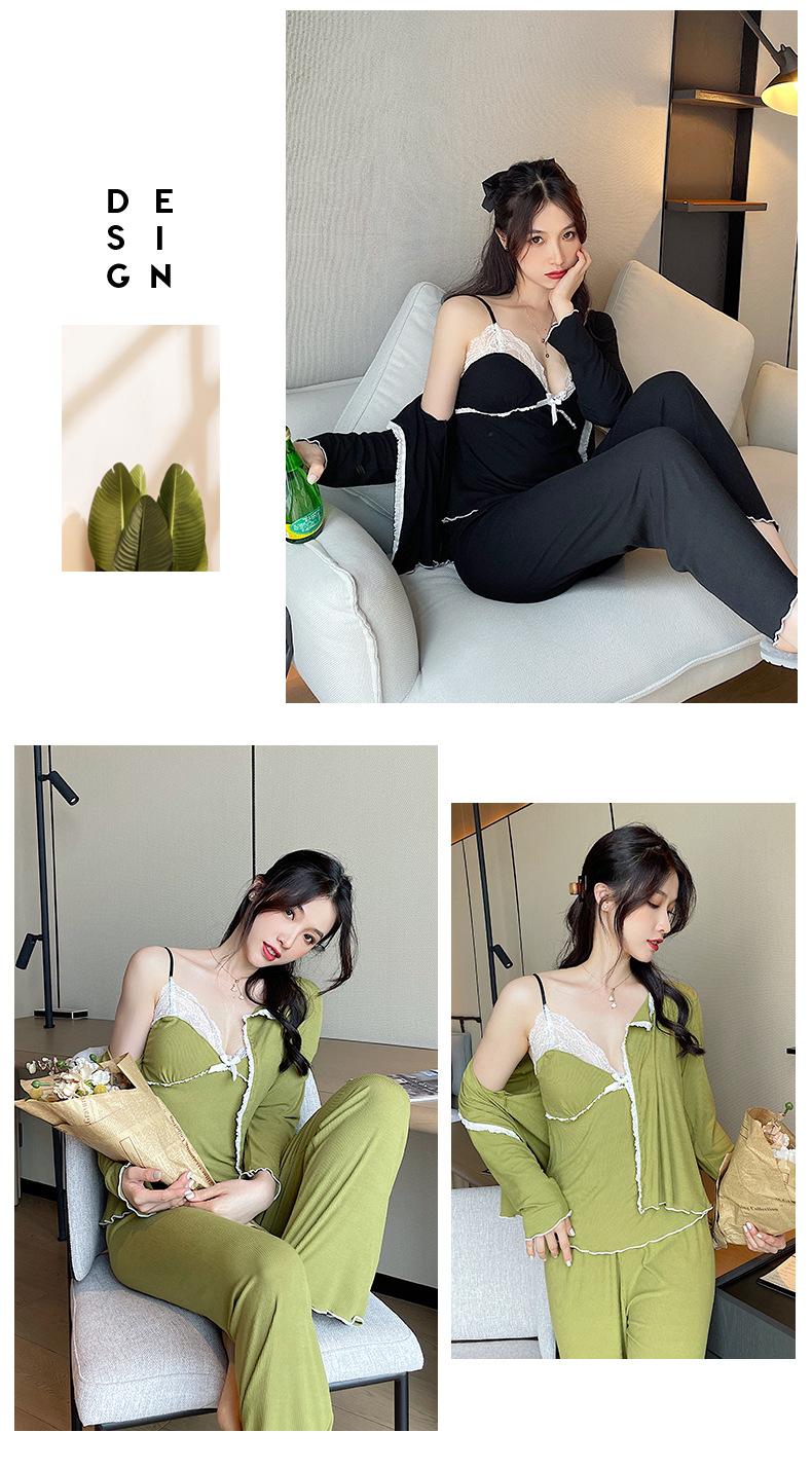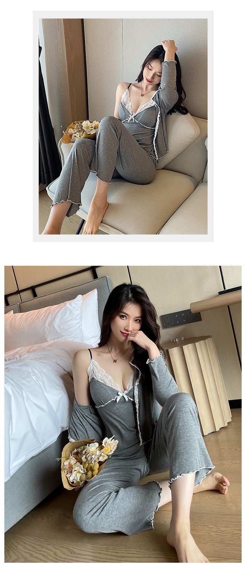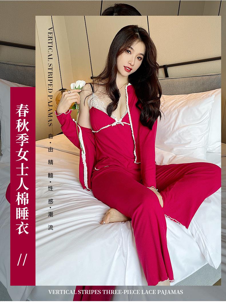 Otoño e Invierno Nuevo Conjunto Sexy de Pijama de Tres Piezas con Cuello en V Escotado, Bata y Pantalón Largo, Conjunto de Pijama de Algodón para Mujer Transpirable y Suave