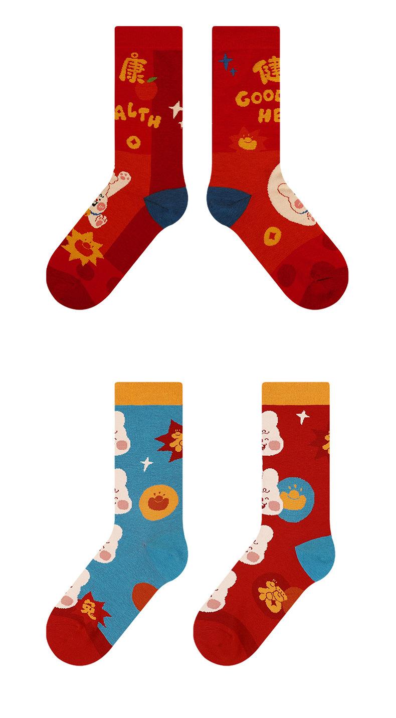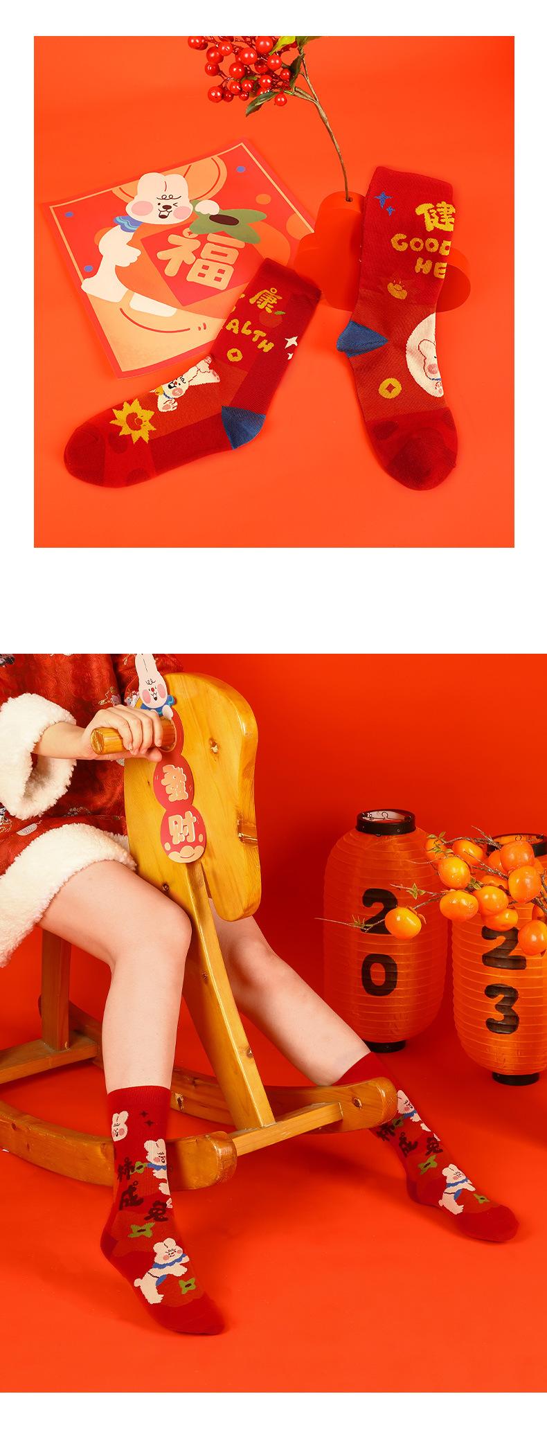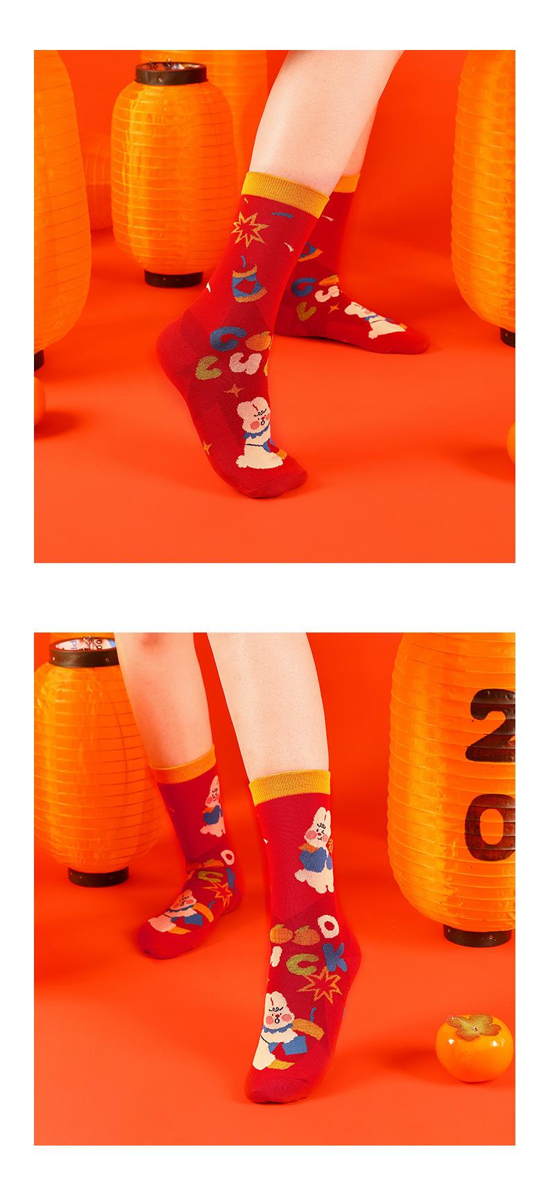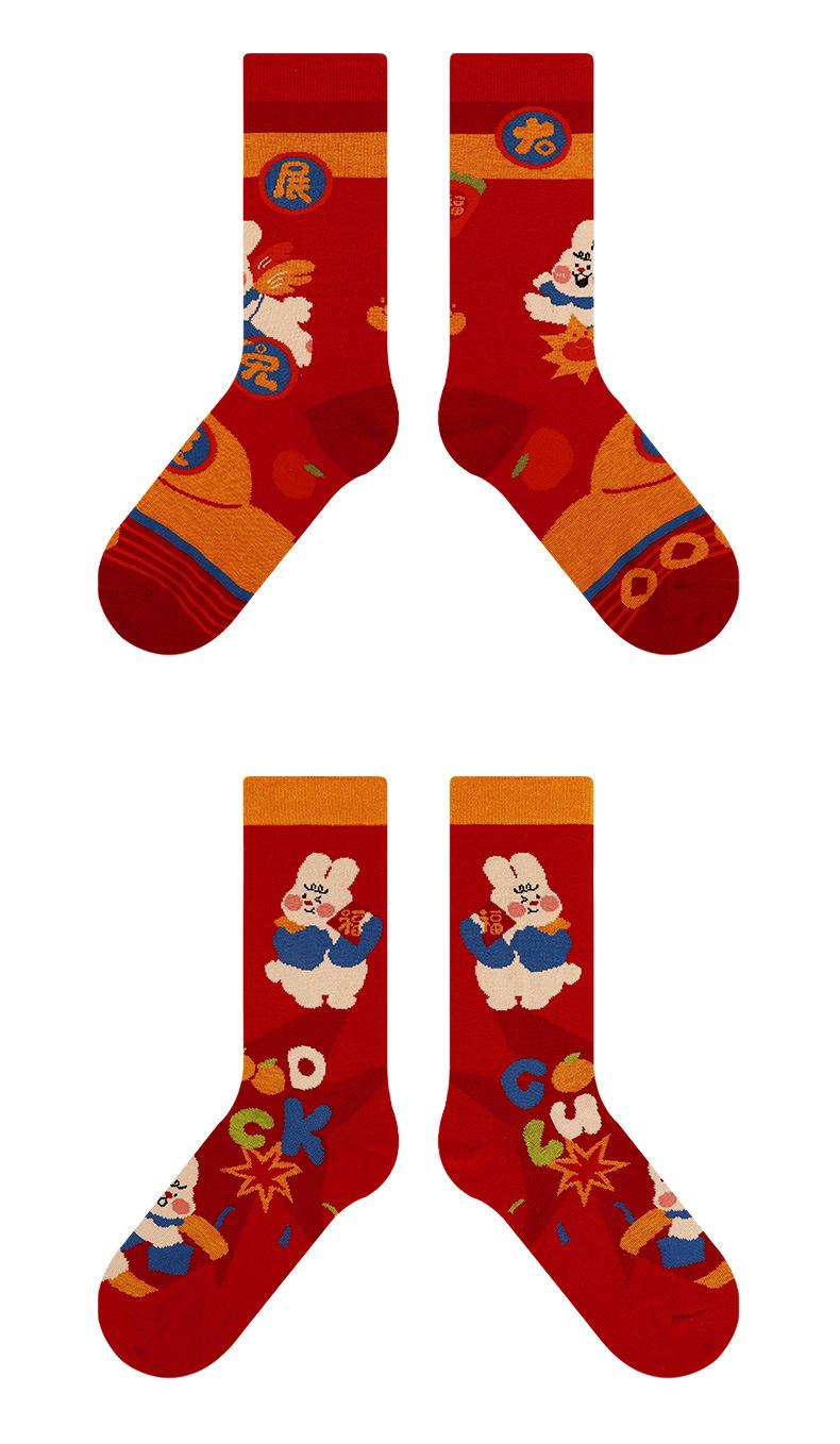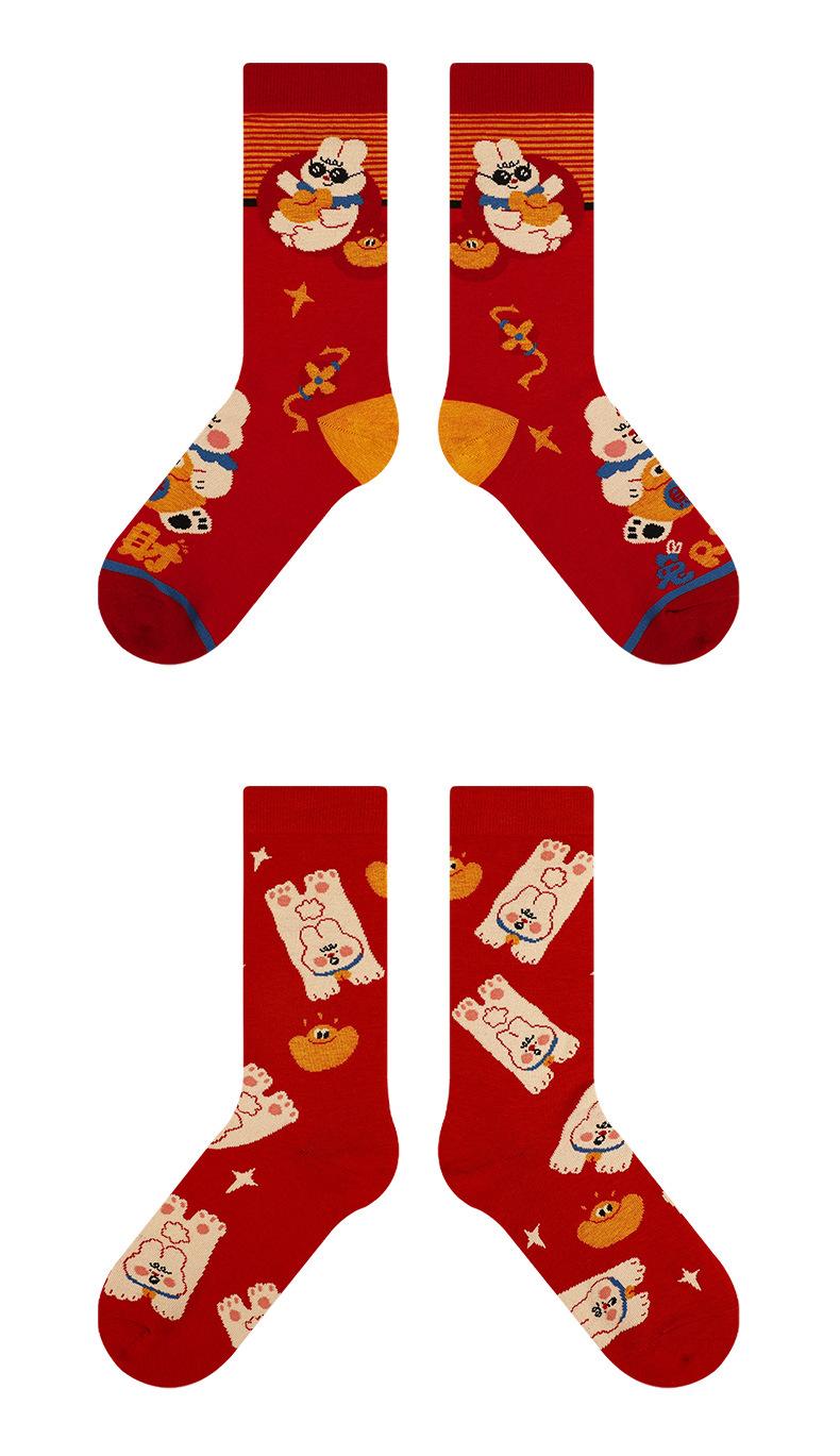Calcetines Rojos Originales Jitu Blessing Año del Conejo Regalo de Año Nuevo Año Buming Algodón Dibujos Animados Otoño e Invierno Calcetines de Hombre y Mujer Calcetines de Media Caña