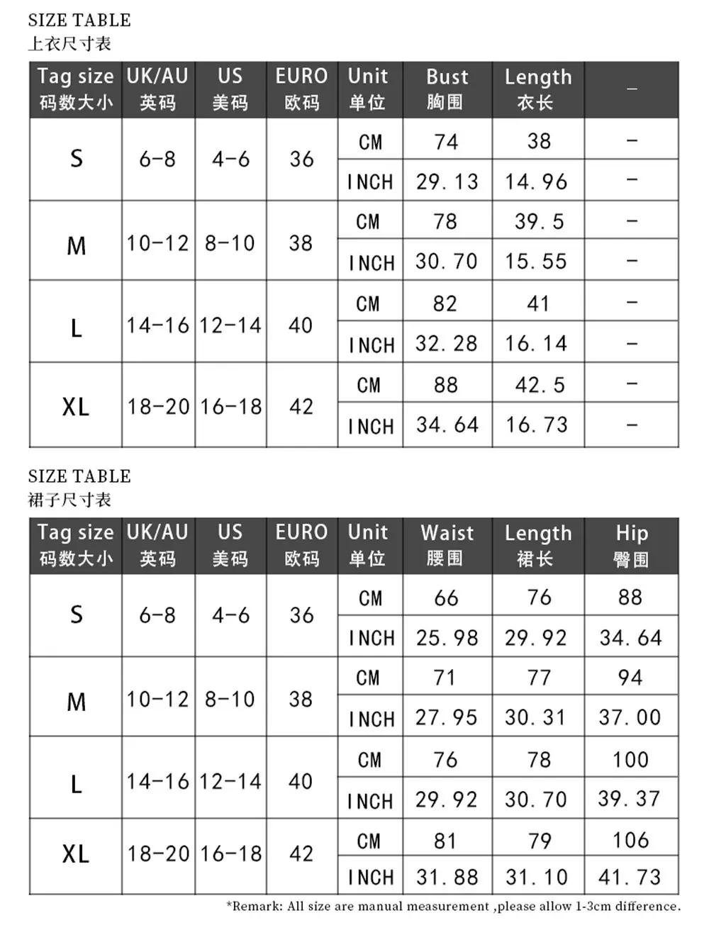 S, M, L, XL