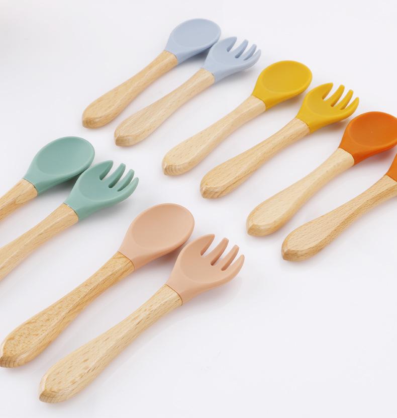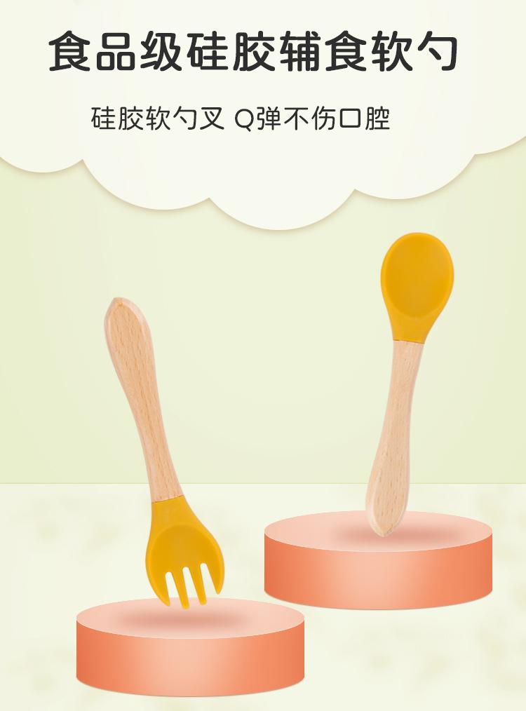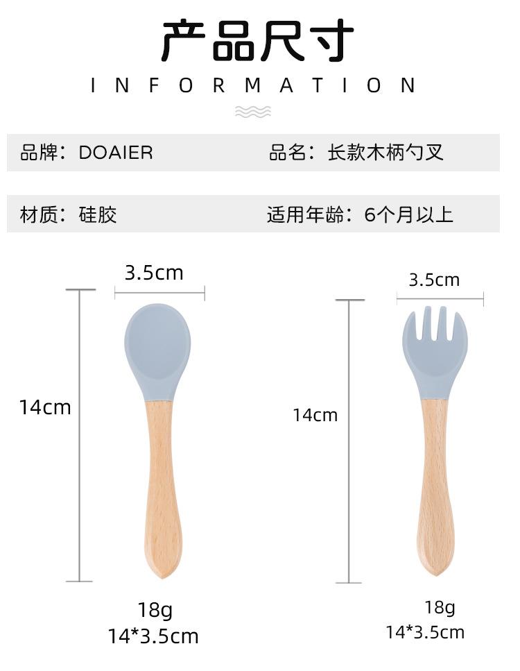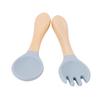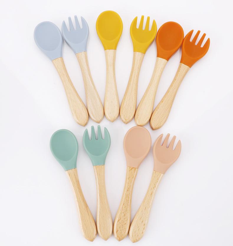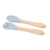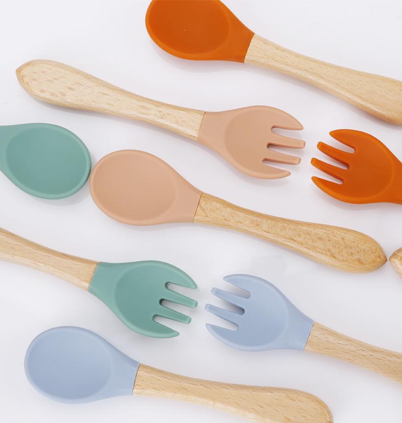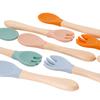 Cuchara Tenedor Suave de Silicona para Bebé Vajilla Suplemento Alimenticio Bebé Aprendiendo a Comer Cuchara Tenedor Mango de Madera Vajilla para Madre e Hijos