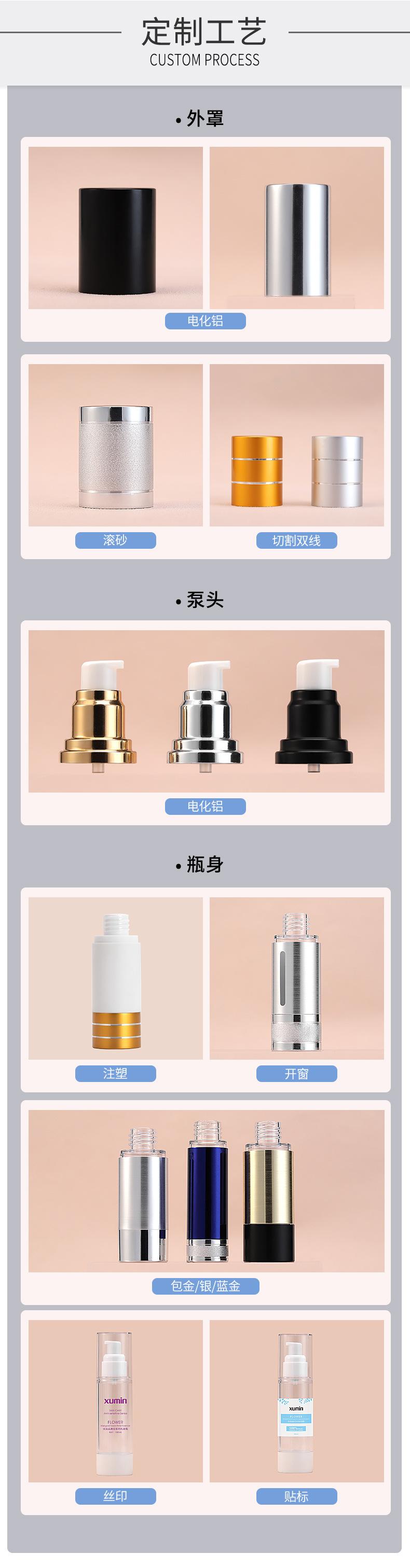 Envases Xumin, botella de vacío de loción personalizada, botella de muestra de 10-50 ml, botella de prensa cosmética de 80-120 ml