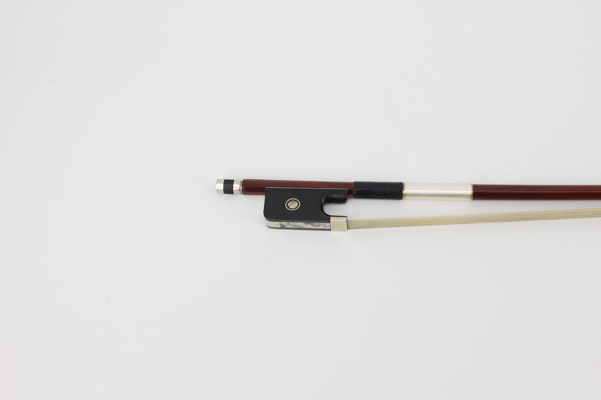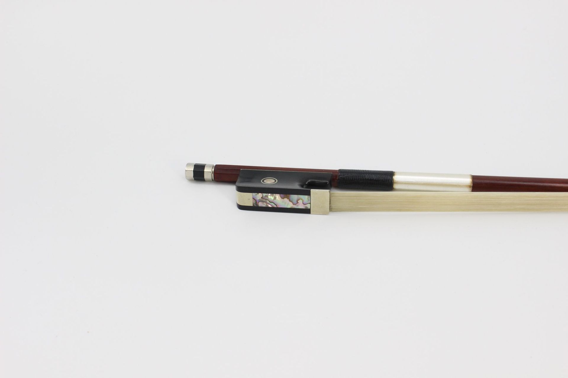 Base de cola de caballo de ébano, incrustación de concha de colores, accesorios de metal.