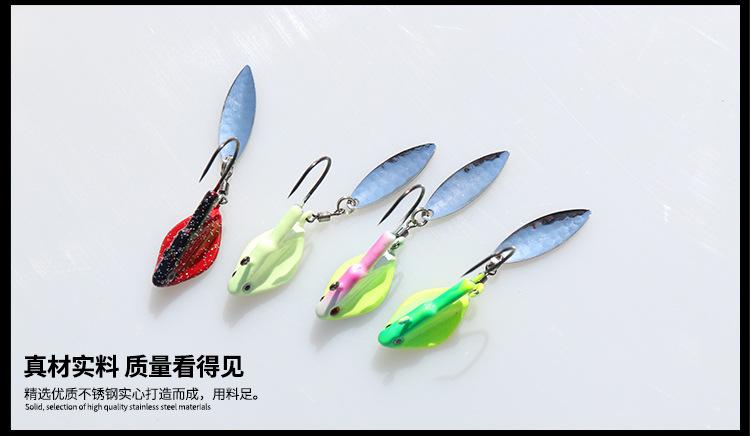 El diseño único de cabeza plomada en forma de pez, con el centro de gravedad inclinado hacia abajo, está equipado con lentejuelas de hoja de sauce giratorias. Combina las ventajas de VIB, gusanos blandos y lentejuelas al buscar en las capas de agua media y superior. El ángulo natural al saltar al fondo elimina la necesidad de técnicas engorrosas y es un superventas. Se ha utilizado en Europa y Estados Unidos durante muchos años, ¡y es una herramienta poderosa para buscar en todas las áreas de agua durante todo el día!