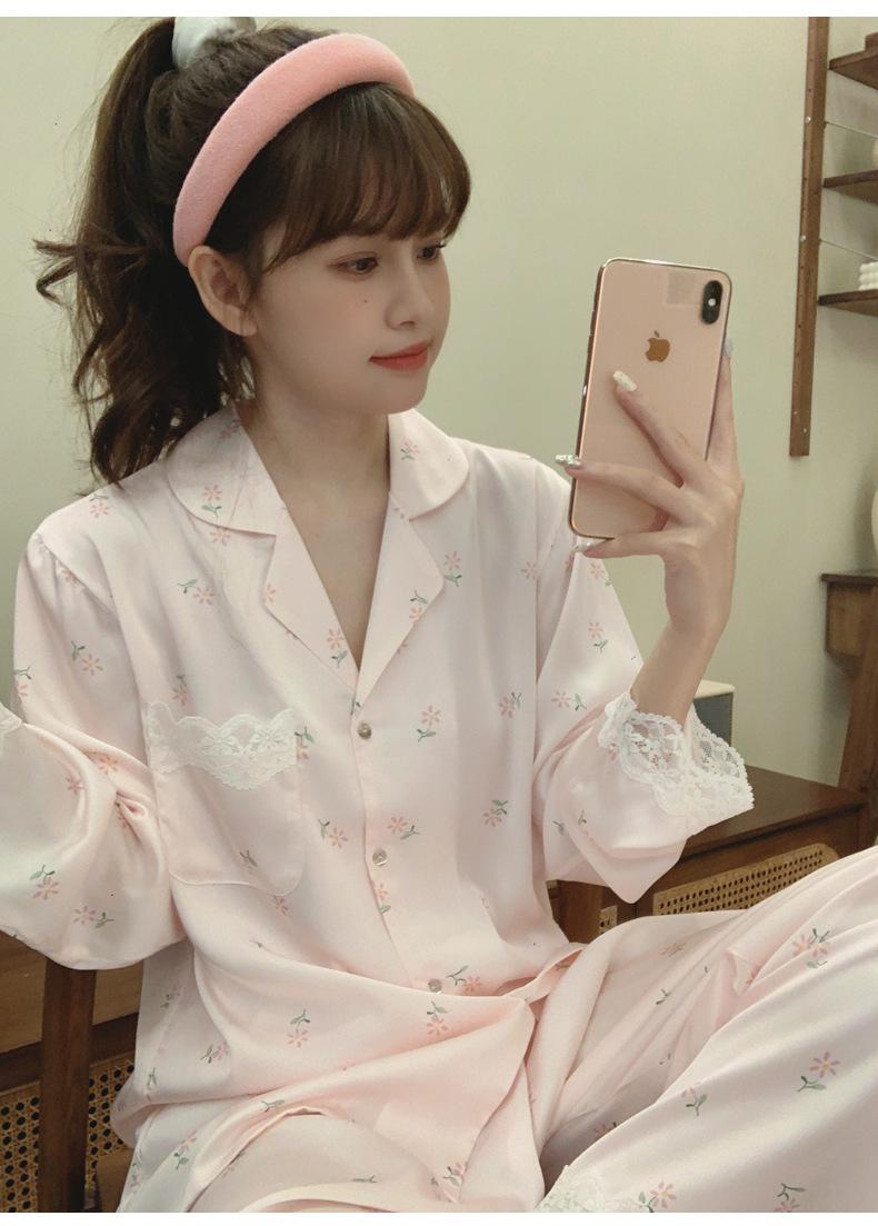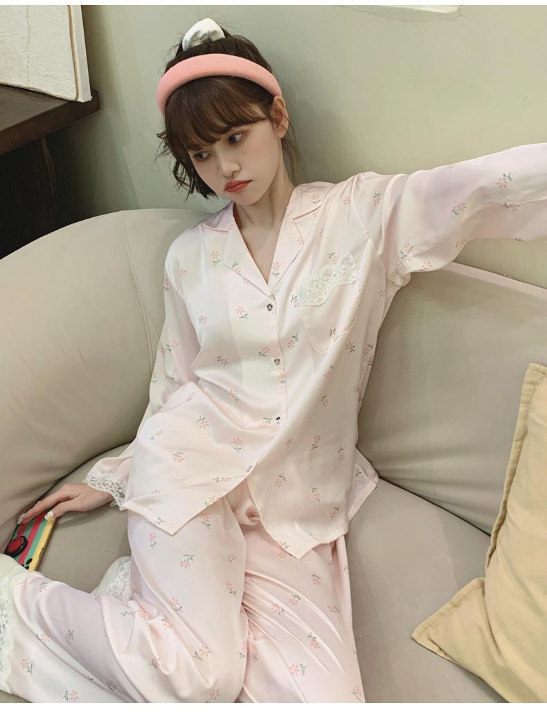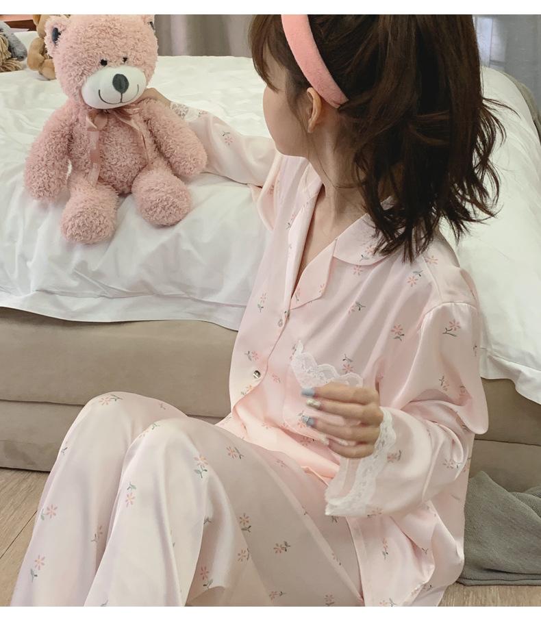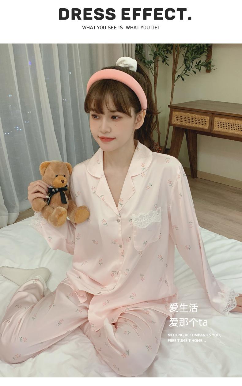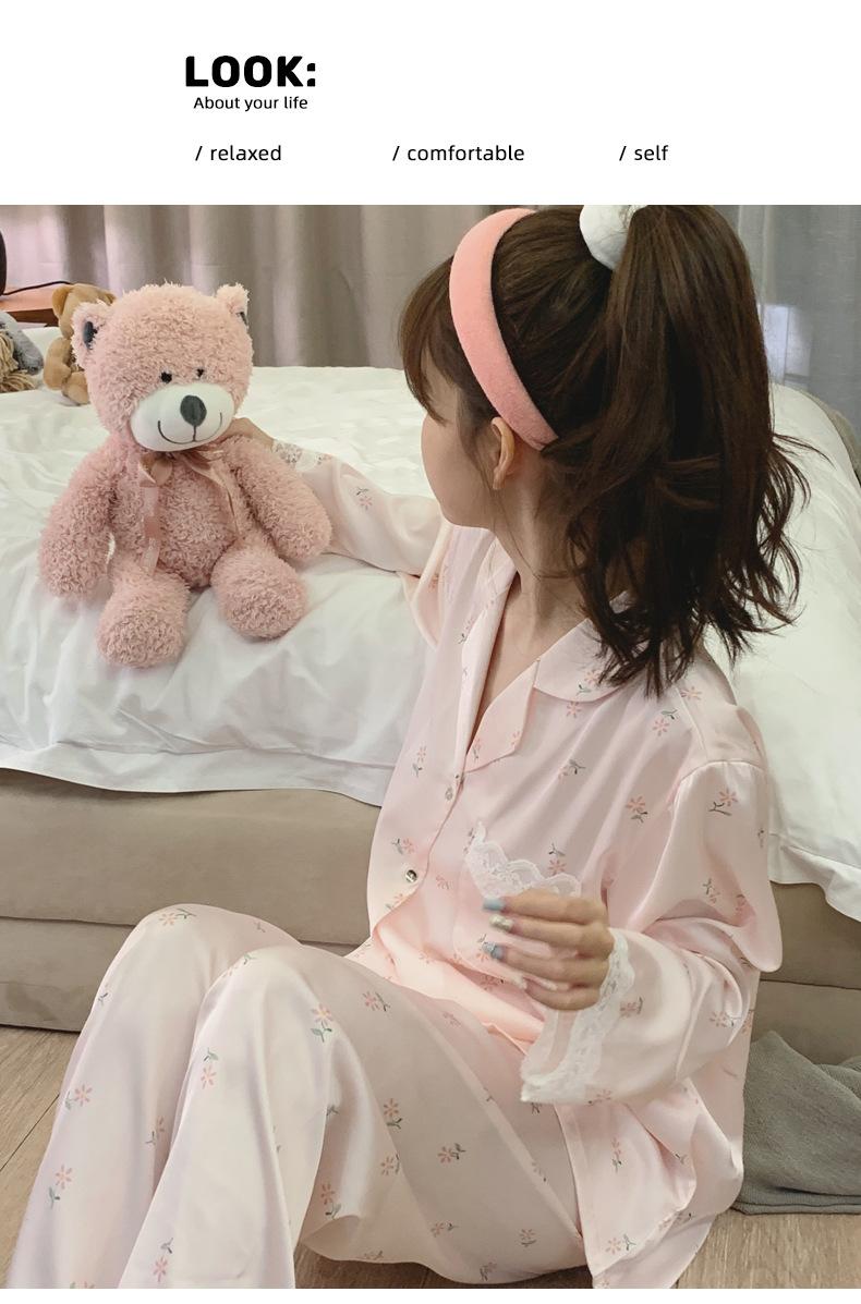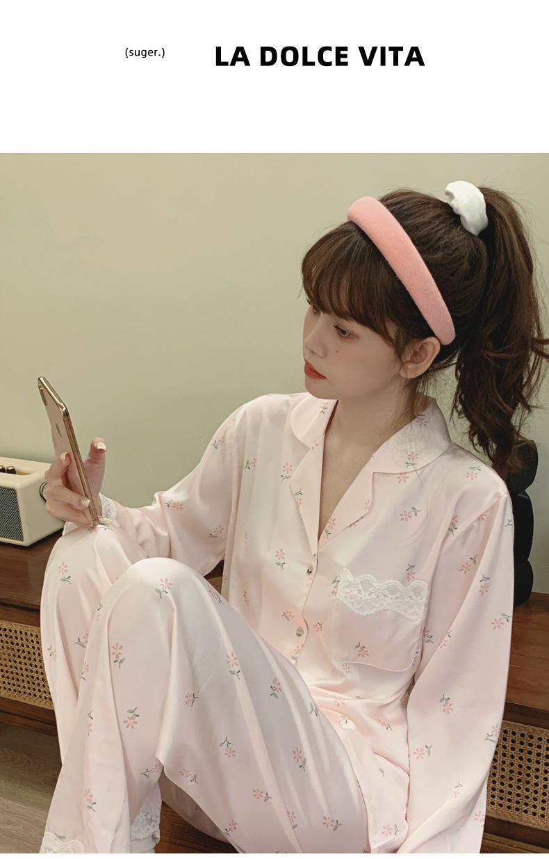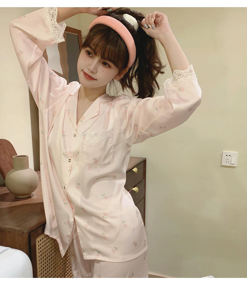 Pijama de seda de hielo para mujer, novedad de primavera y otoño de 2024, con encaje fino estampado, ropa de casa, traje de dos piezas dulce y fresco