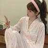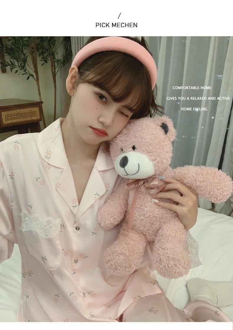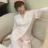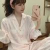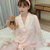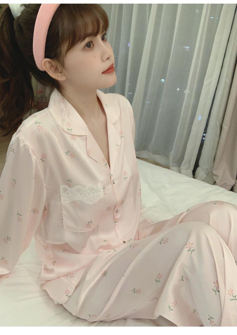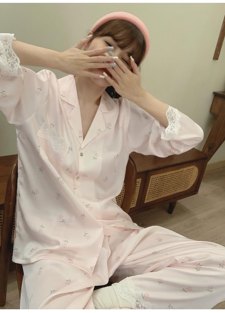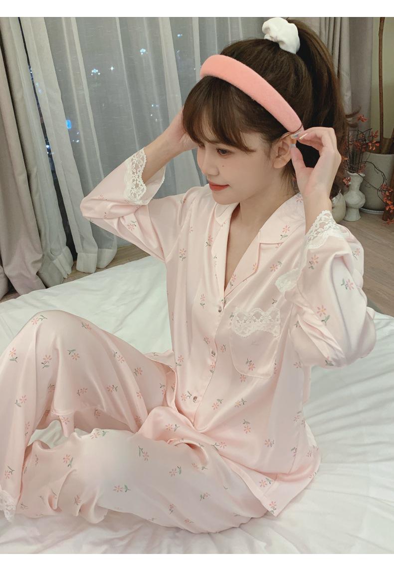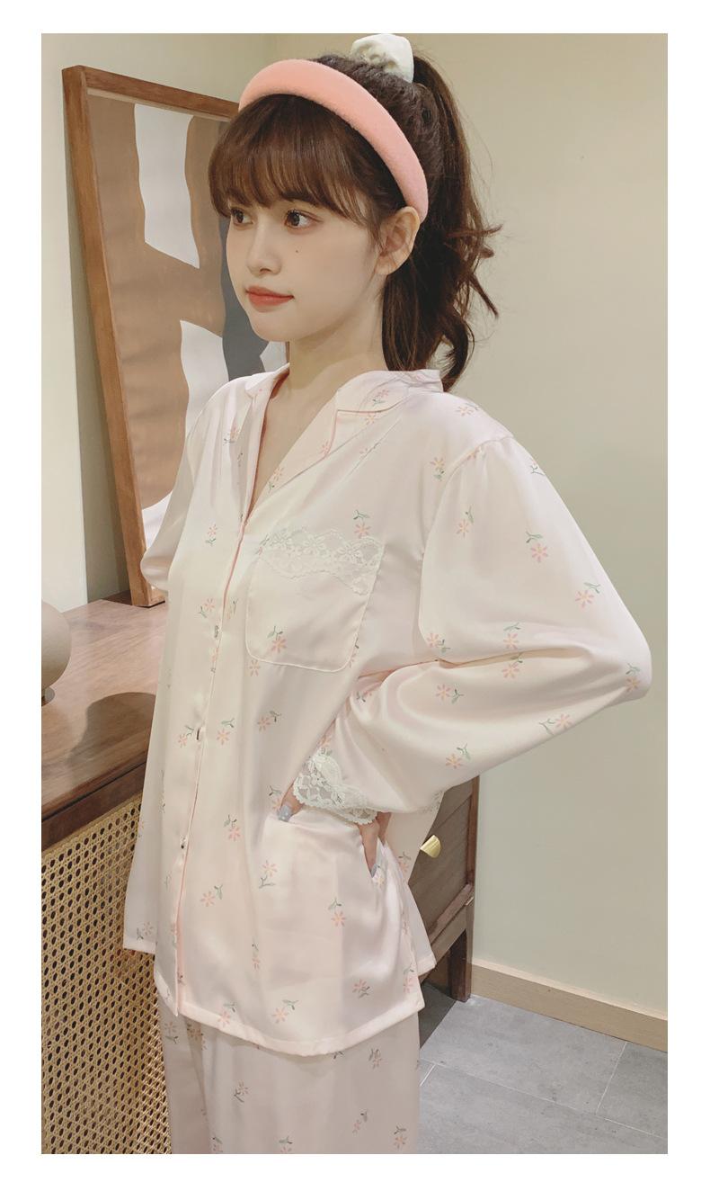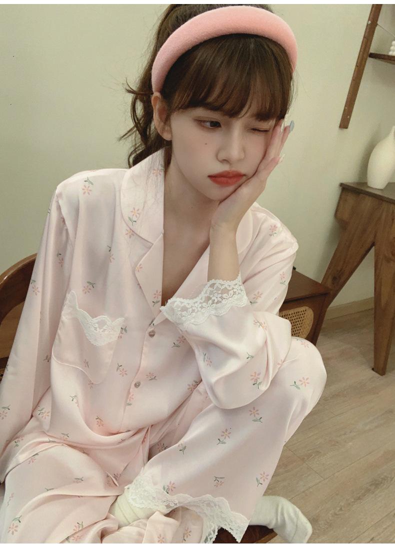 Pijama de seda de hielo para mujer, novedad de primavera y otoño de 2024, con encaje fino estampado, ropa de casa, traje de dos piezas dulce y fresco
