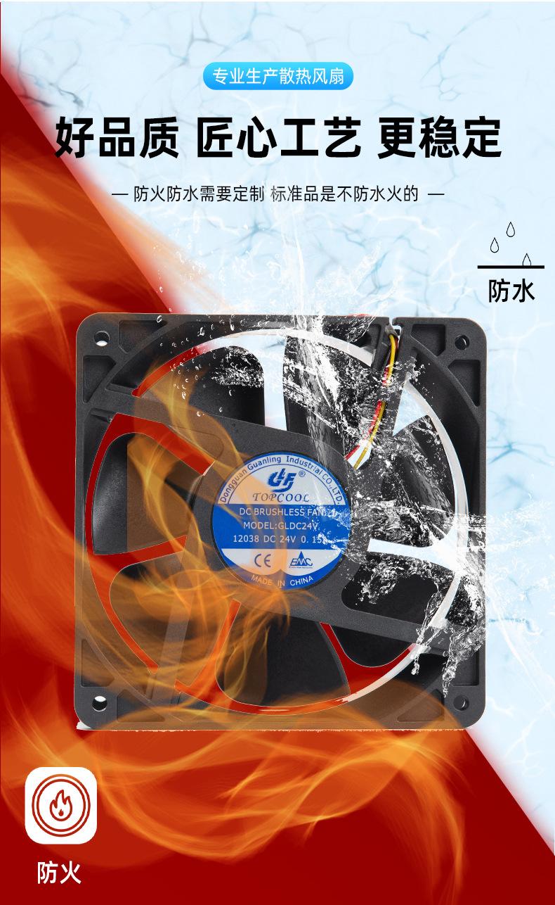 Ventilador industrial Gl12038 de alta potencia, con marco metálico, 12/24 V, ignífugo, CC, personalizado de fábrica