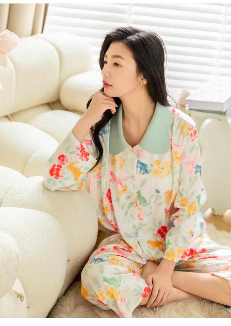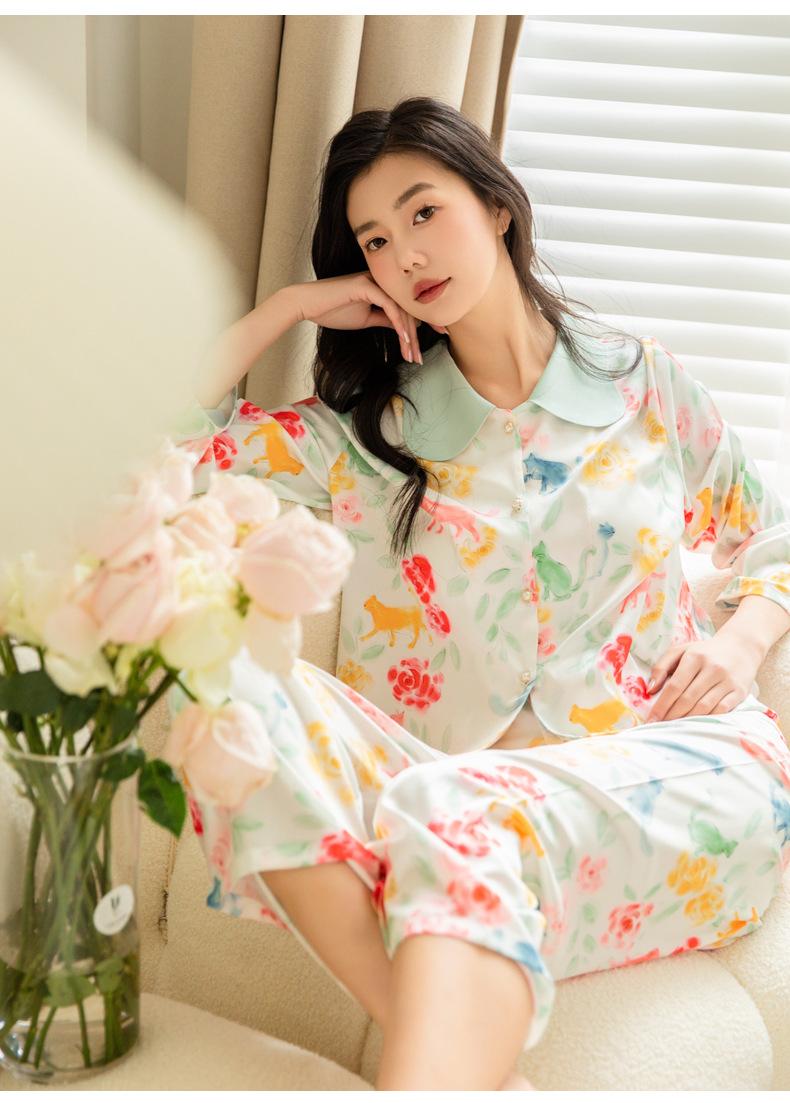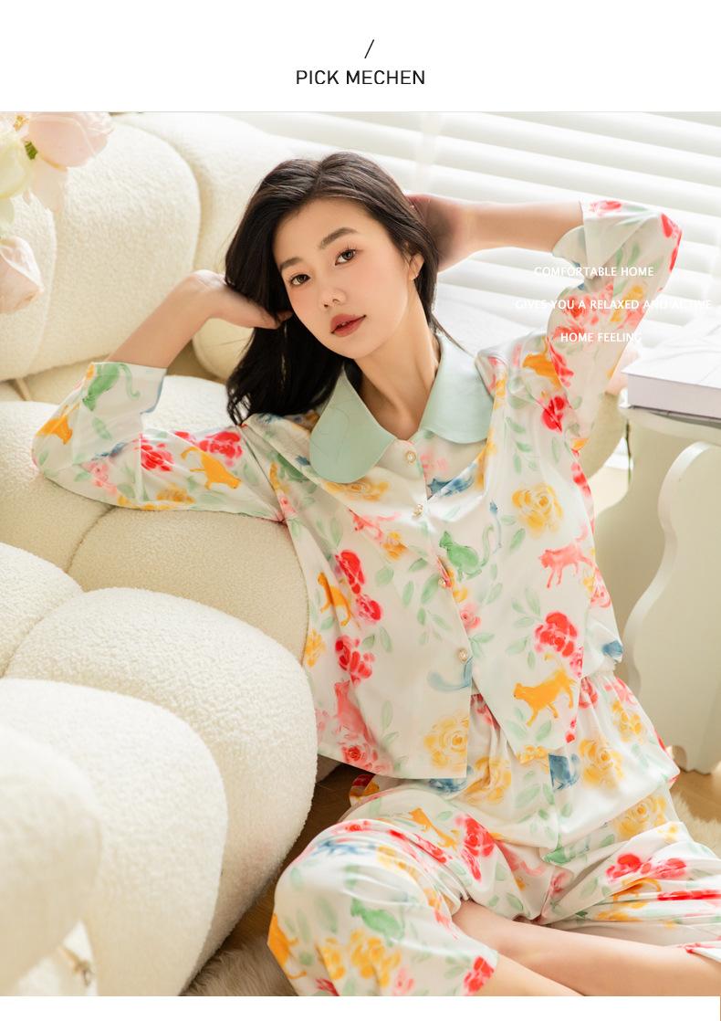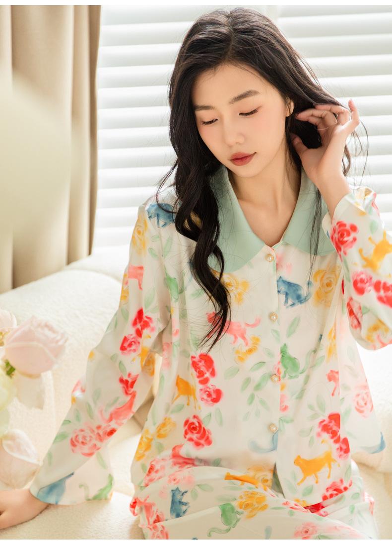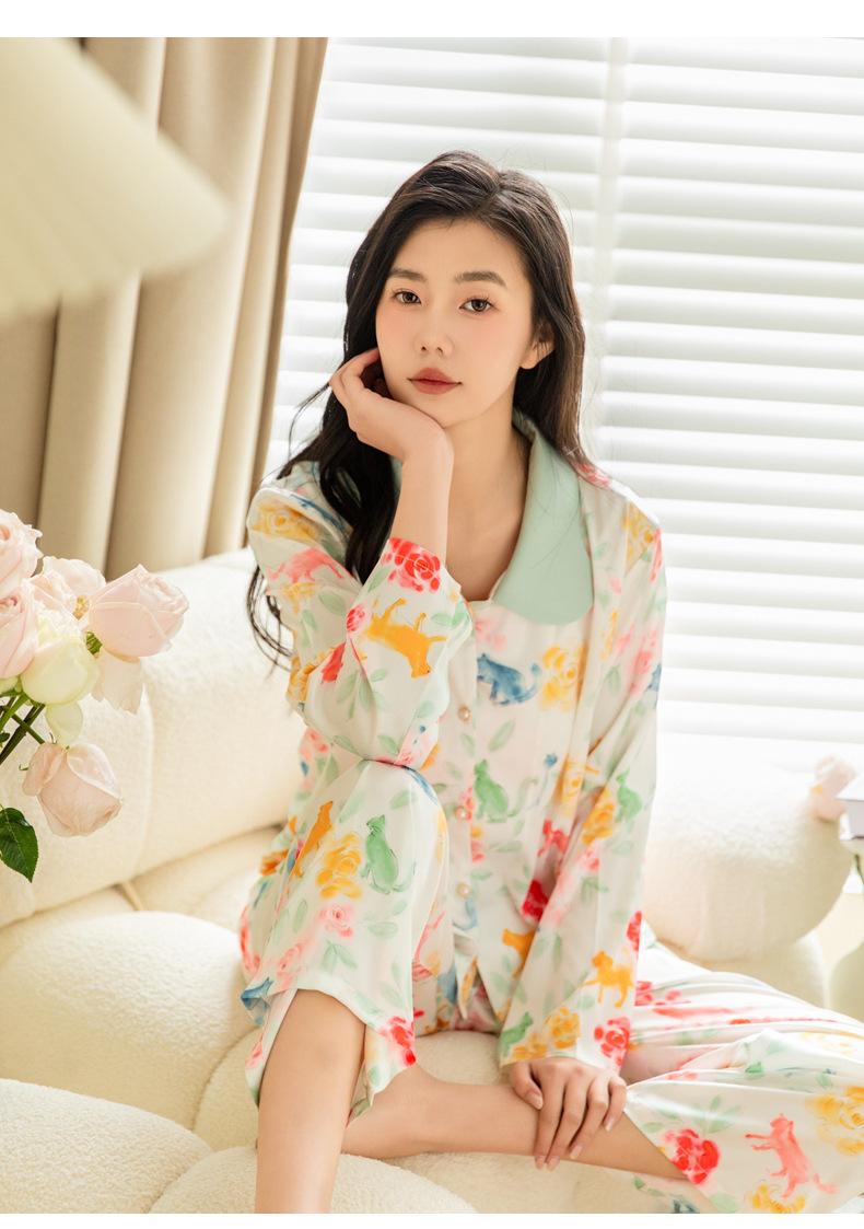 Pijama de seda de hielo para mujer, primavera 2024, pantalones de manga larga, cárdigan con estampado de gato colorido, traje fino y moderno para el hogar para mujer