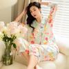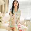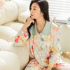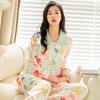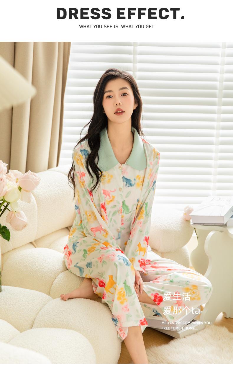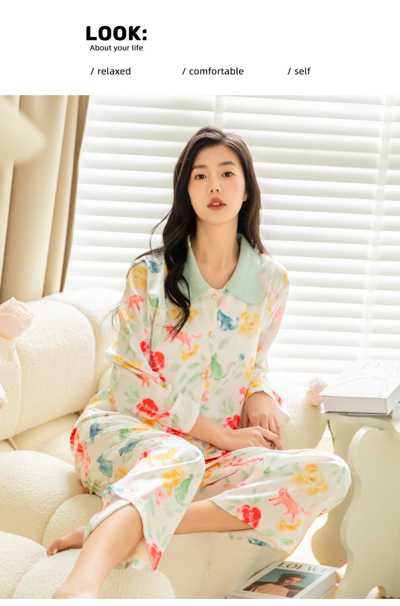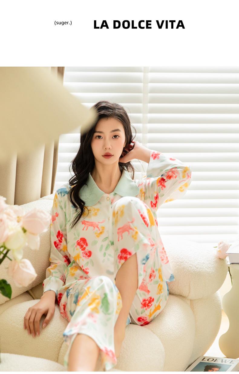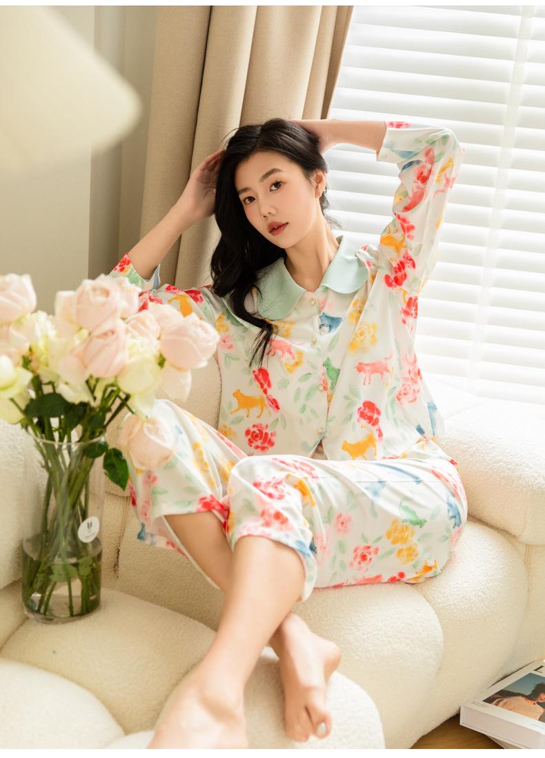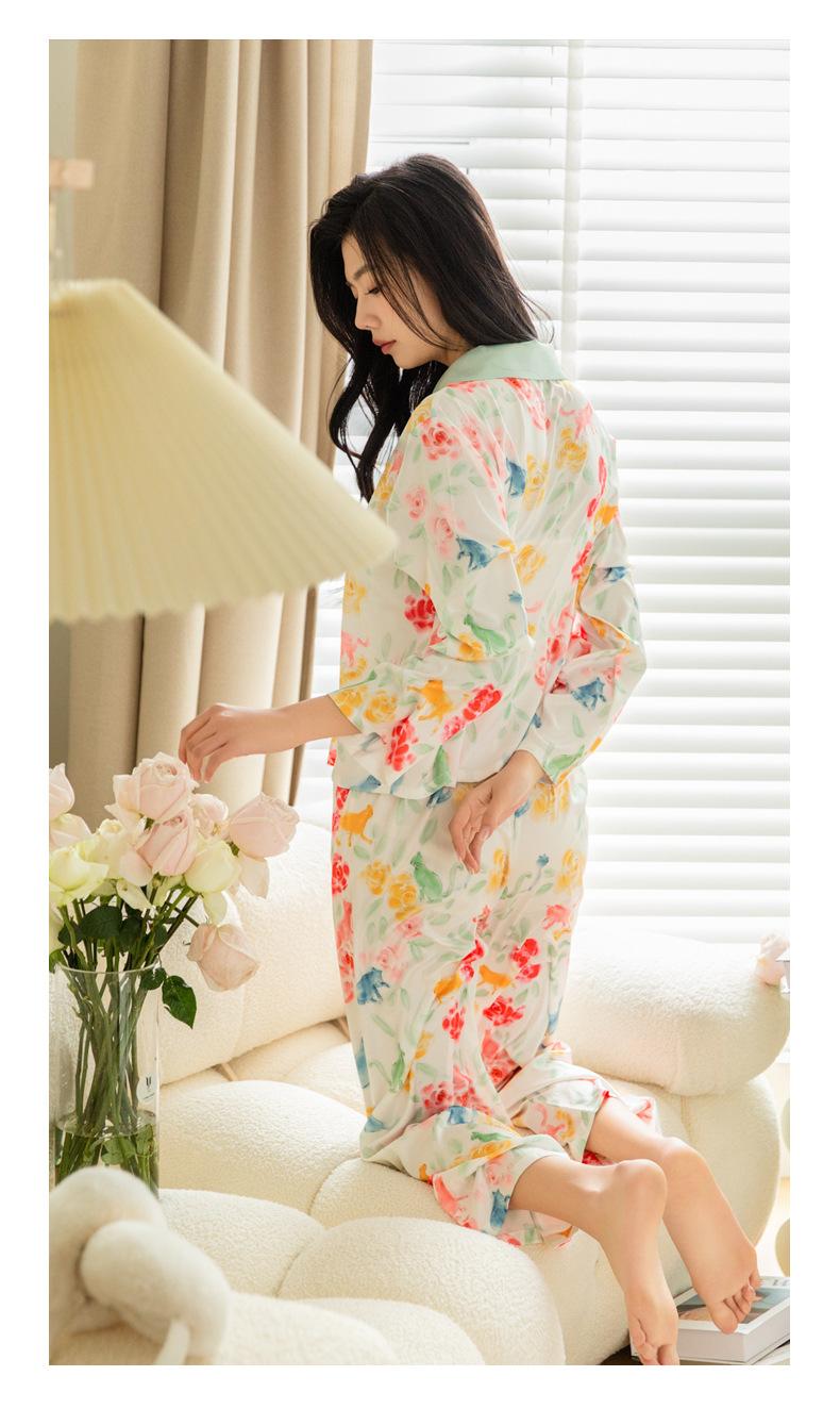 Pijama de seda de hielo para mujer, primavera 2024, pantalones de manga larga, cárdigan con estampado de gato colorido, traje fino y moderno para el hogar para mujer